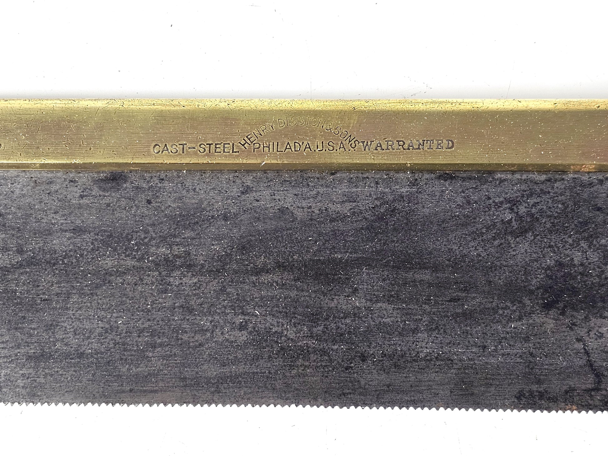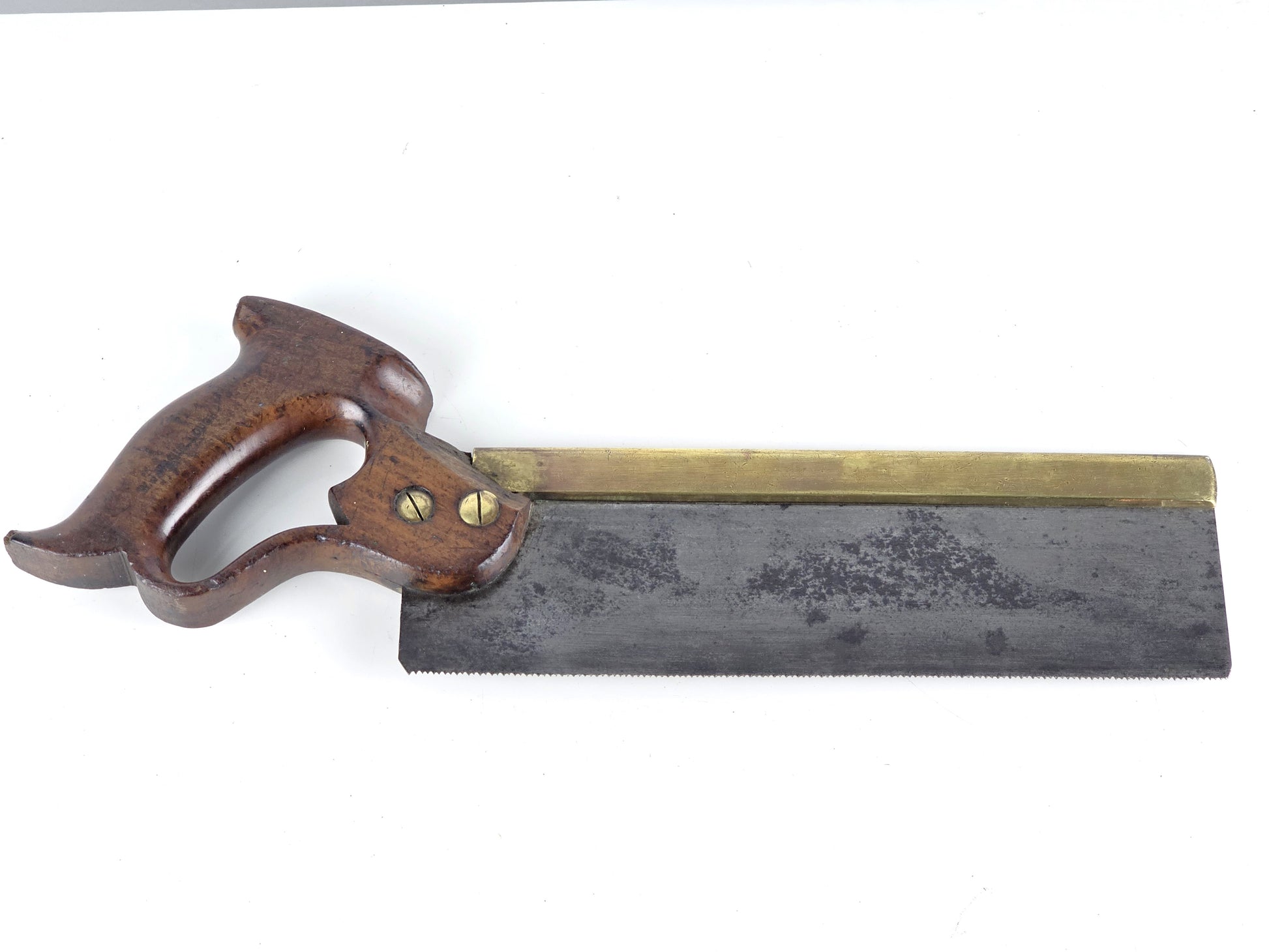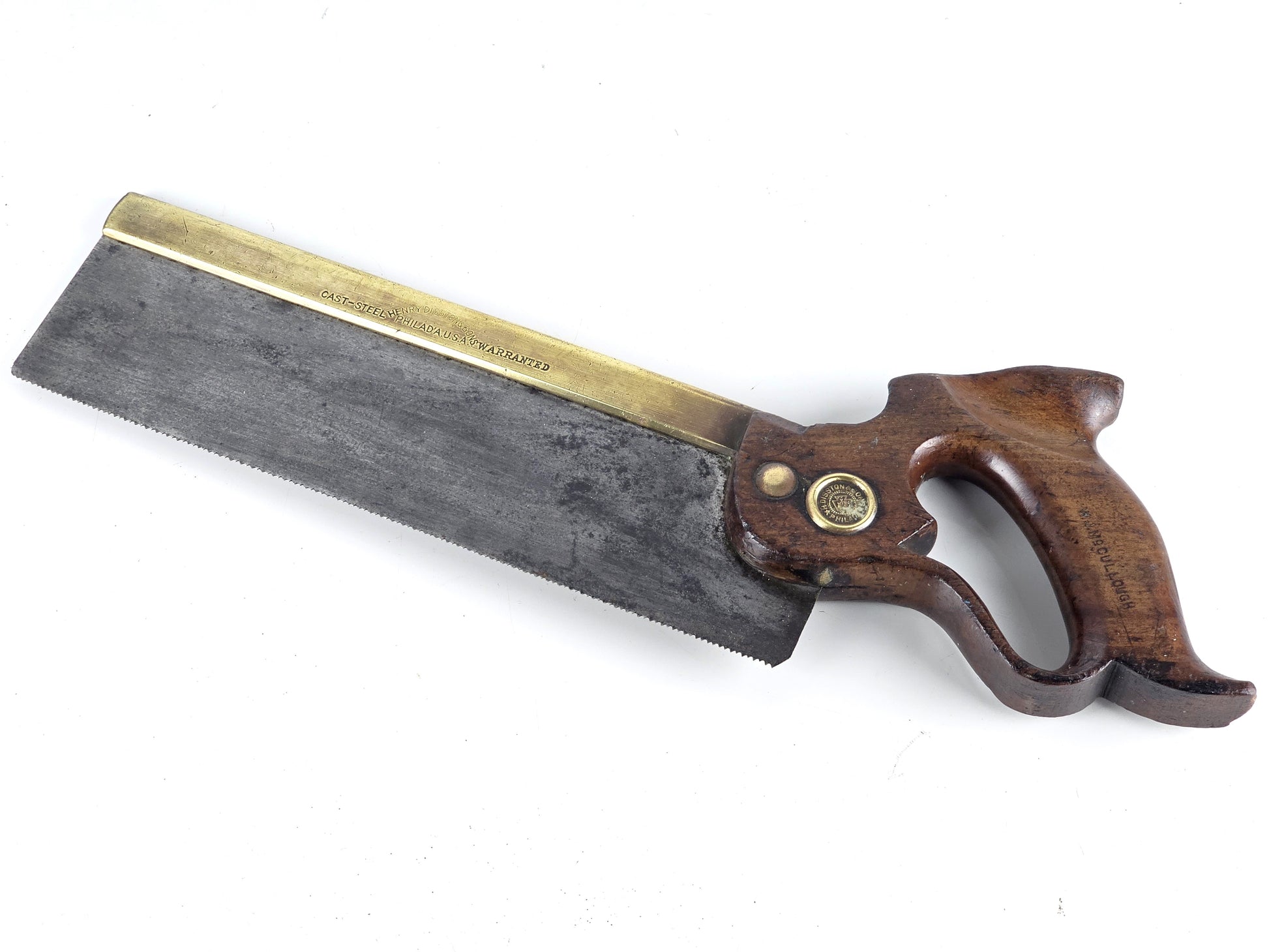 A nice 10" heavy brass back tenon saw by Henry Disston & Sons with fully enclosed apple wood handle, good patina, cast steel blade and protective wooden sleeve. early 20th century. Blade depth 2.25"