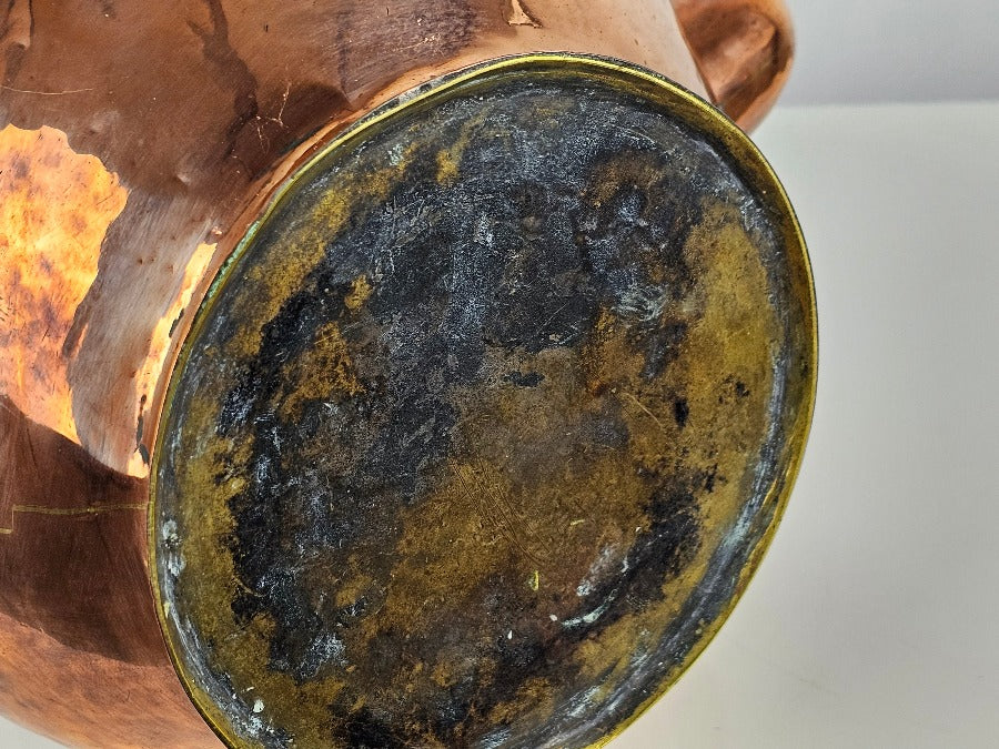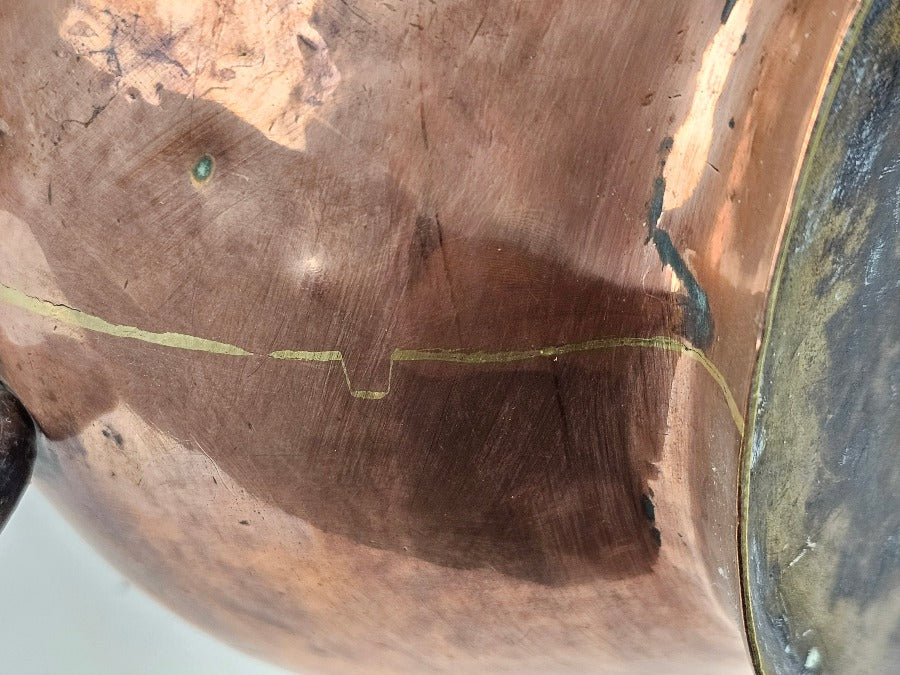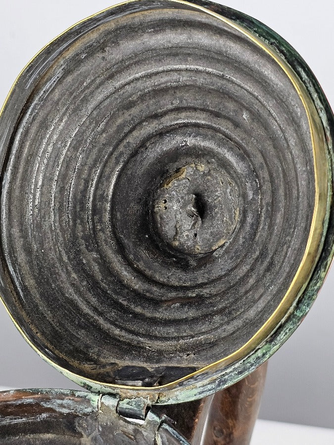 This beautifully handmade and rare item bears all the hallmarks of use and conversation from the 18th century, the patina and knocks over the years where it has been handled are wonderful, with dovetail seams in the construction of both the body and spout including a strong brass base and support to the lid with original wooden handles make this piece exceptional.