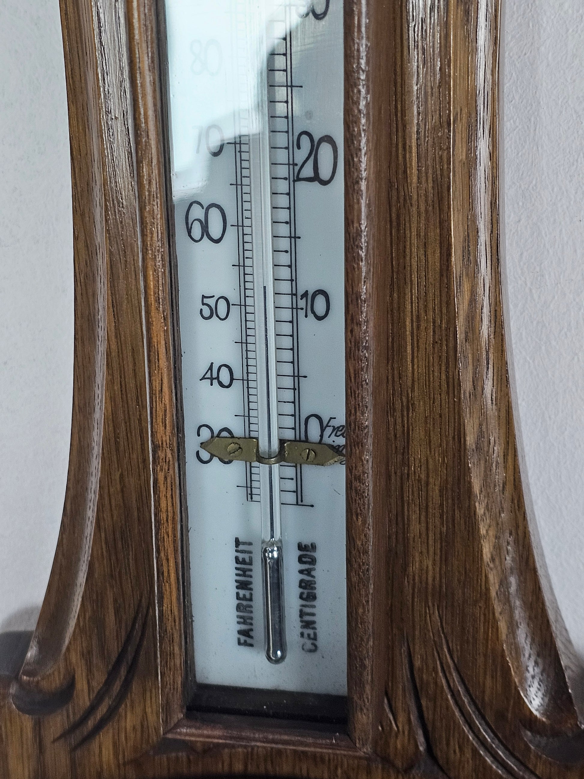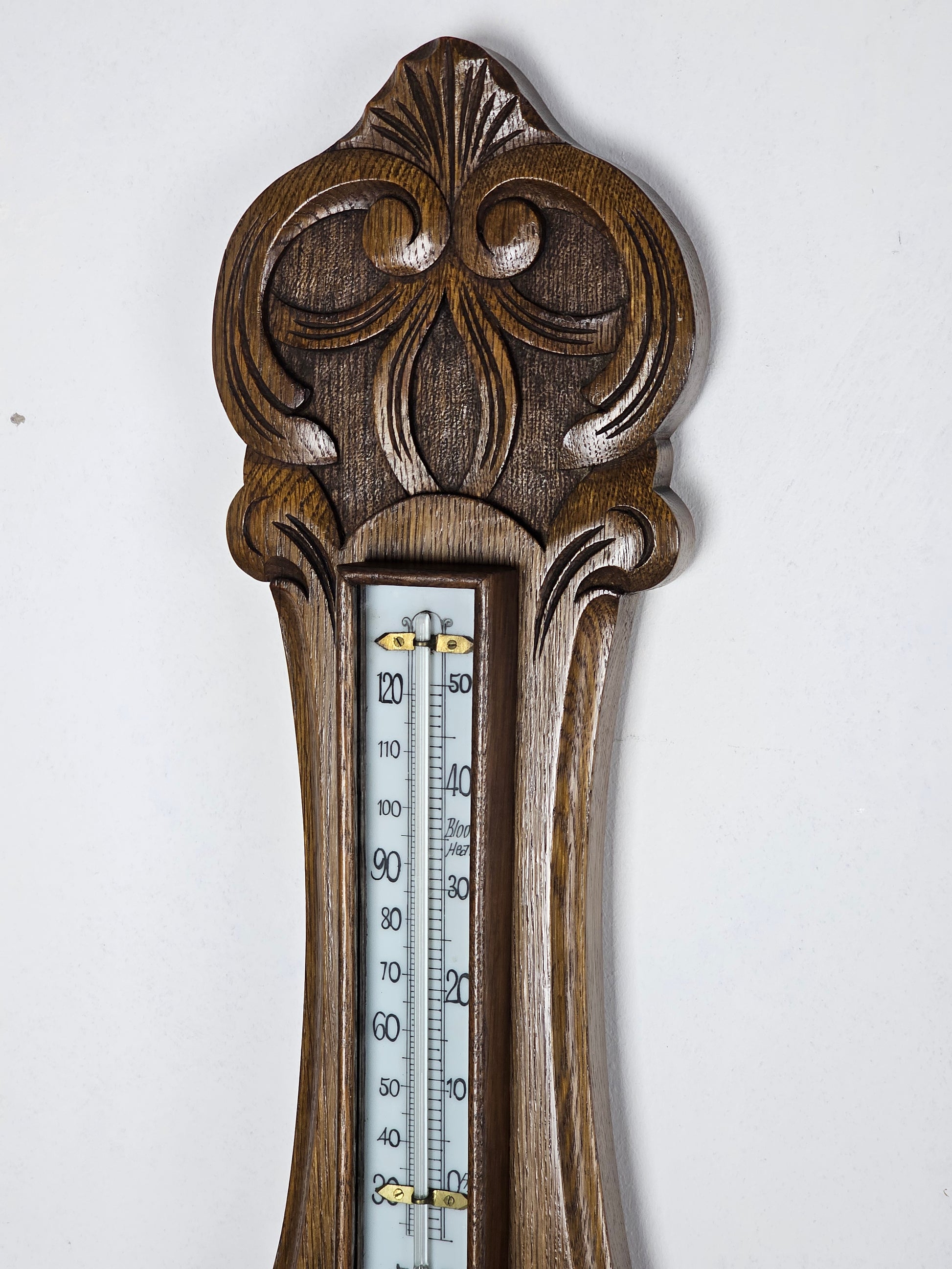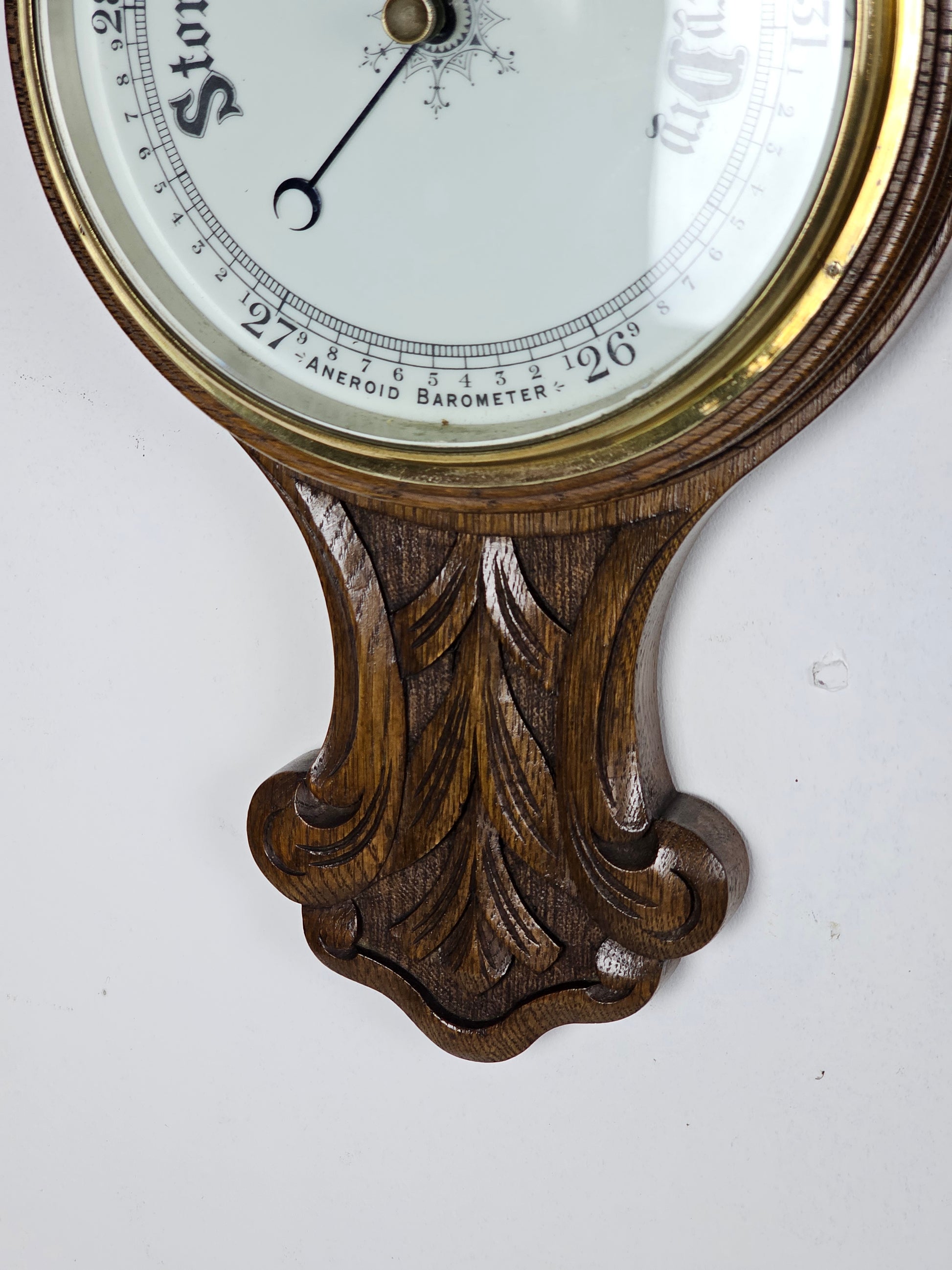A highly decorative early 20th century carved oak aneroid barometer with mercury thermometer, all dials are glass. In lovely working condition.