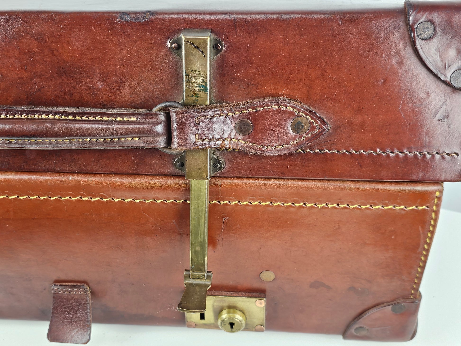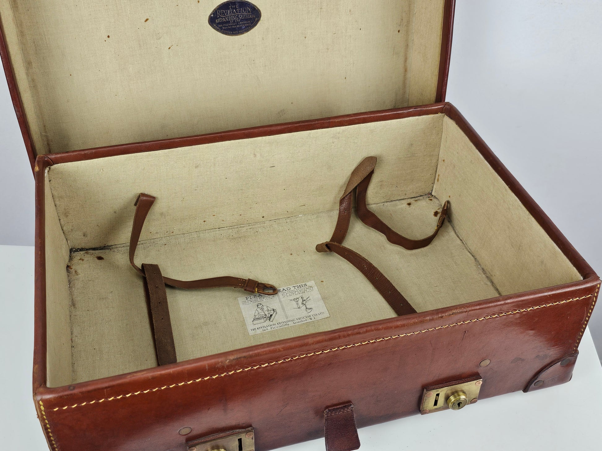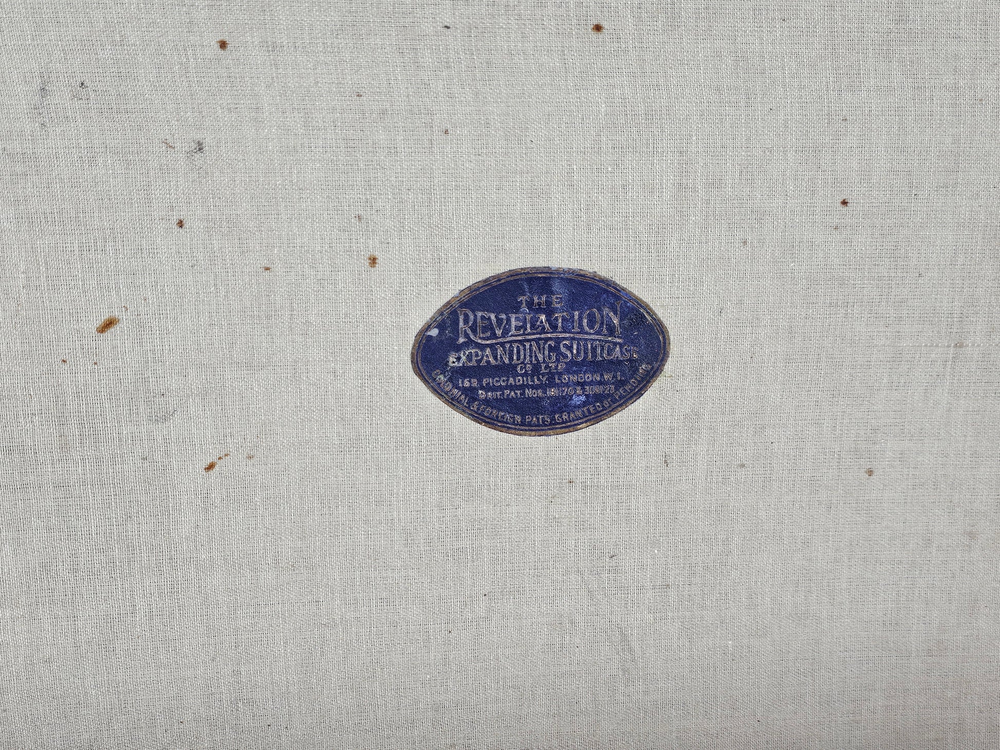 Labelled "Revelation 169 Piccadilly London W1". The revelation being this suitcase expands into the depth of a trunk. The hinges and the front hasps elongate, turning the case into almost twice its size
