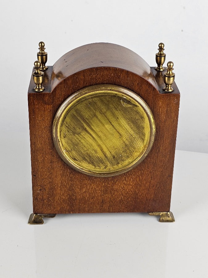 A good Edwardian French mantel clock with platform escapement. The movement is of French brass construction and very good quality. It is designed to run eight full days. Made from mahogany with a beautifully inlaid case with brass finials and feet. In good working order and winds up from the back as well as allowing for the setting of the hands.
