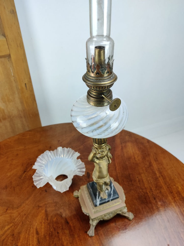 A lovely French oil lamp/ peg lamp with opaline shade, font and clear glass chimney. Single burner on a brass and marble base with cherub. This oil lamp is in nice condition and would fit nicely anywhere around the home.
