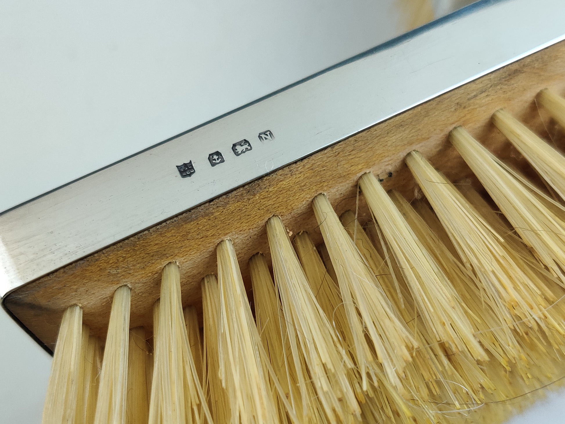 A handsome Sterling Silver set of gentle-mans clothes and hair brushes, having rectangular bodies, with engine-turned decoration together with original pig bristles set into wooden bases. Made by Charles S Green & Co Ltd.