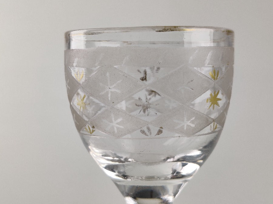 Antique Georgian tincture glass. Wheel engraved ogee bowl, gilt decoration, angular knop stem on a conical folded foot and rough pontil.