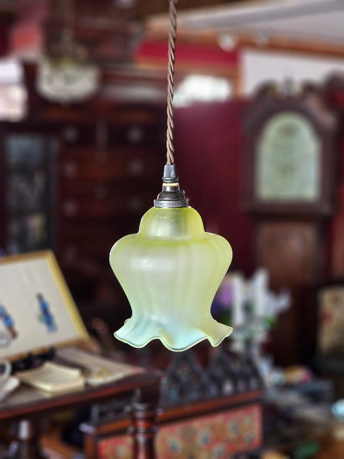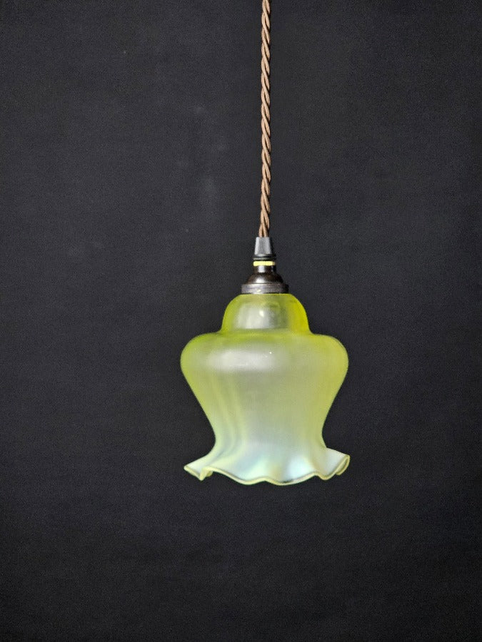 A beautiful pair of antique vaseline glass pendant lamps in a light yellow/lime green colour. Wired with new dark chocolate 3 core brown braided flex and bronze tinted bayonet fitting.