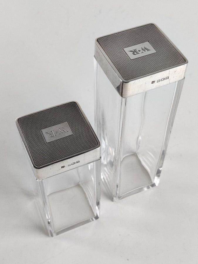 A fabulous set of very stylish Art Deco solid silver topped vanity bottles.