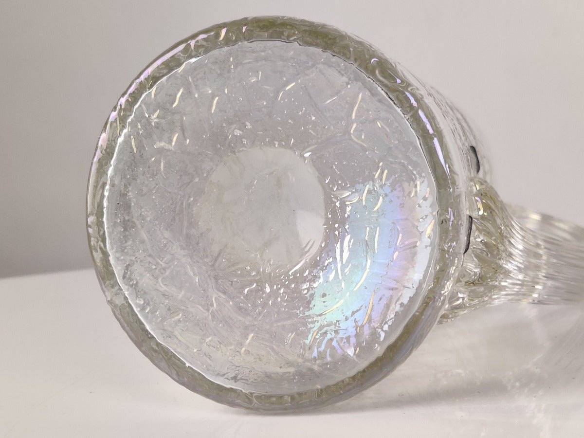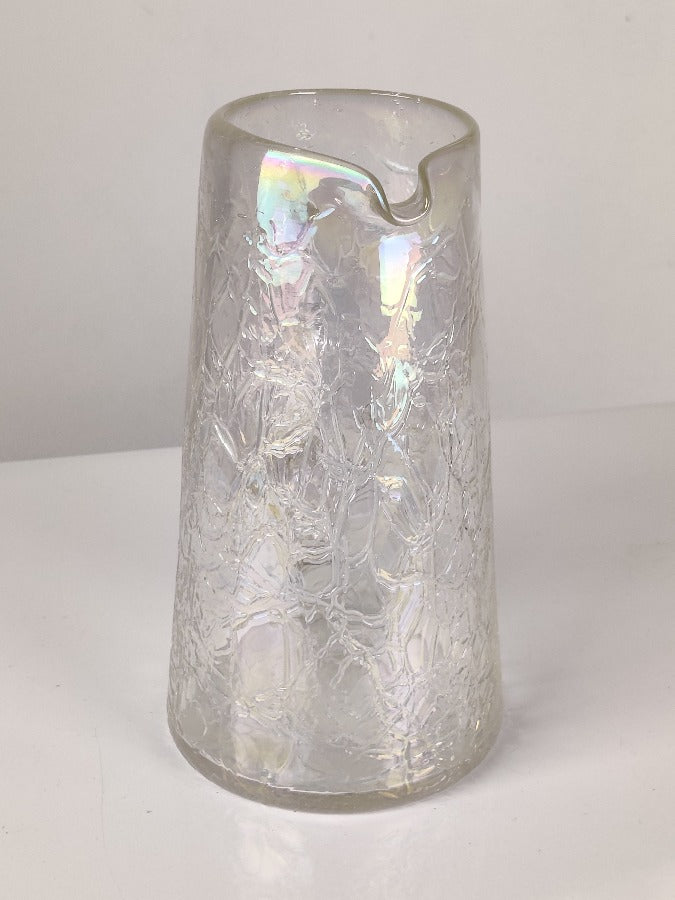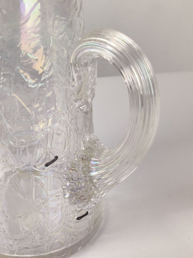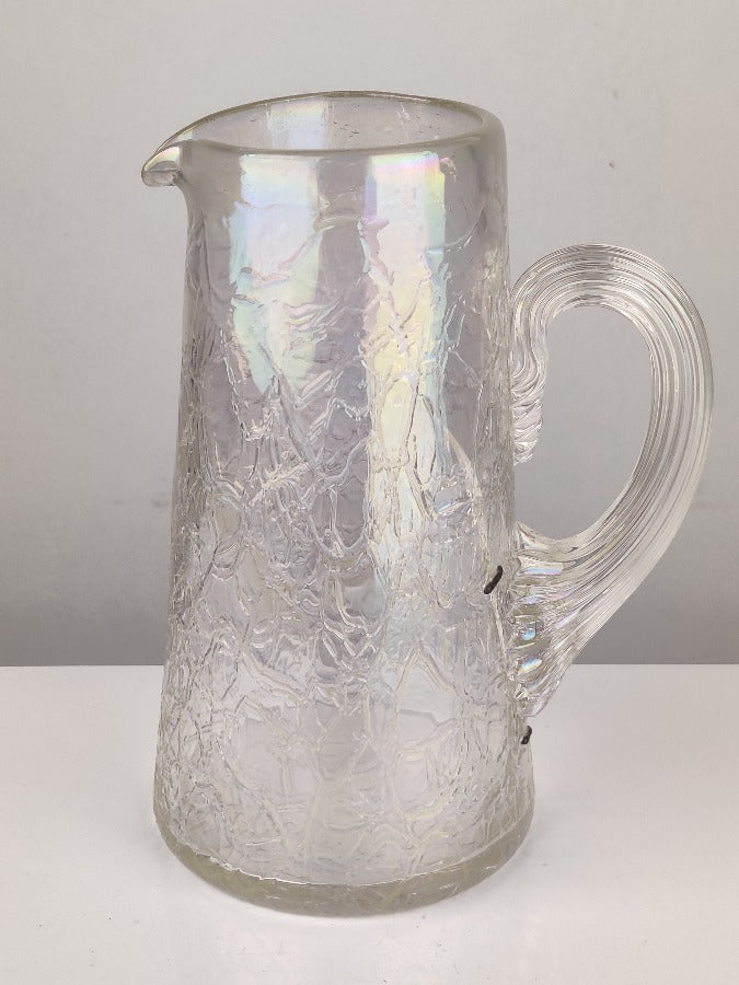 This beautiful Art Nouveau glass jug with iridescent colouring would look fantastic with flowers. With a good ground pontil mark to the base, this would have been made around the end of the 19th century. It sustained a crack at some point in its life but this would have been over 70 years ago! The repair is metal staples which are equally a work of art, so much so, that what used to be considered "damaged and de-valued" now enhances the value.