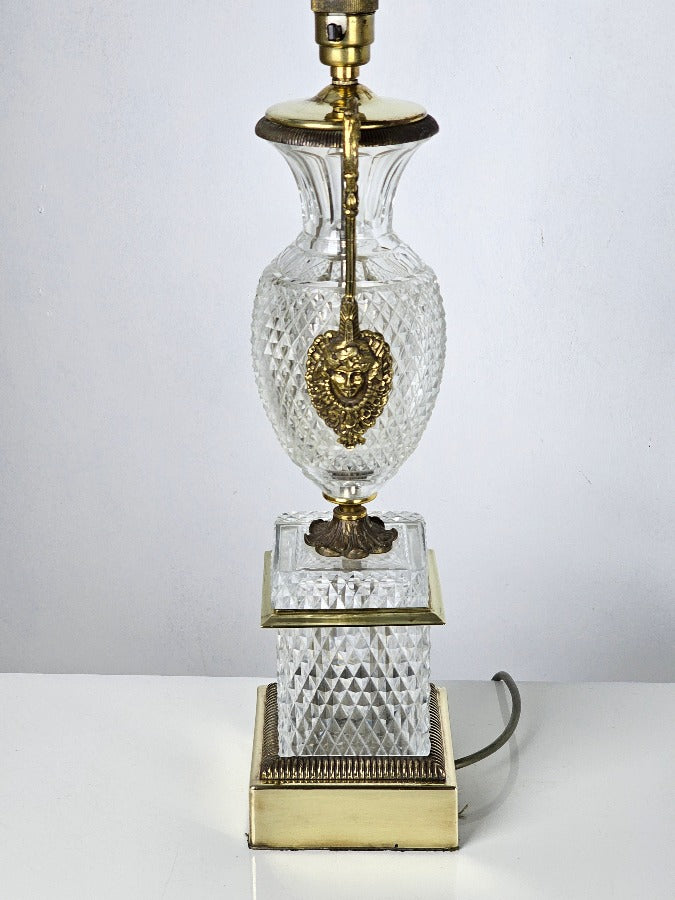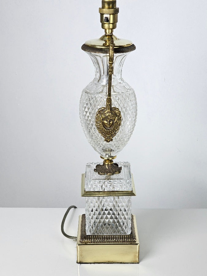 An impressive Mid 20th century cut glass table lamp. Beautiful baccarat cut glass with high quality cast brass and gilt mounts. This lamp comes with an old vintage yellow silk shade which is still very usable.