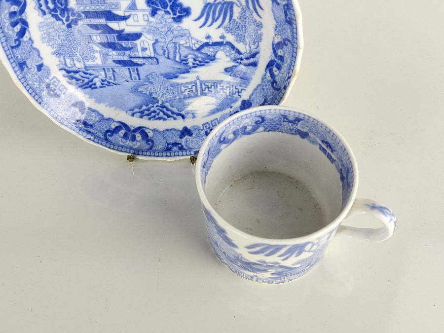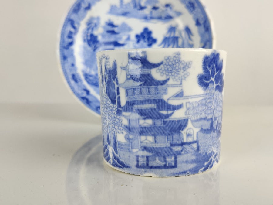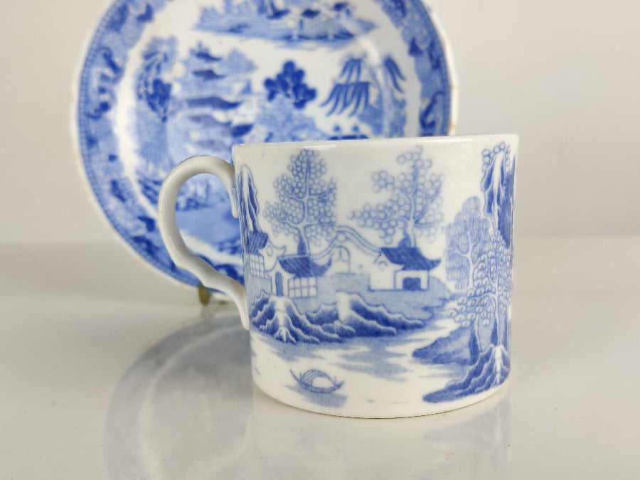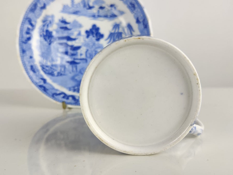 An early 19th century porcelain tea cup and saucer produced by Miles Mason with the transfer two temples pattern. A marked saucer with the pseudo Chinese mark to the base. The handle of the cup, and the outer rim of the saucer have a gently fluted edge. With a Chinese scene in blue, the cup has a design to the inside rim, which matches that on the outer edge of the saucer. In beautiful condition with no chips or cracks.