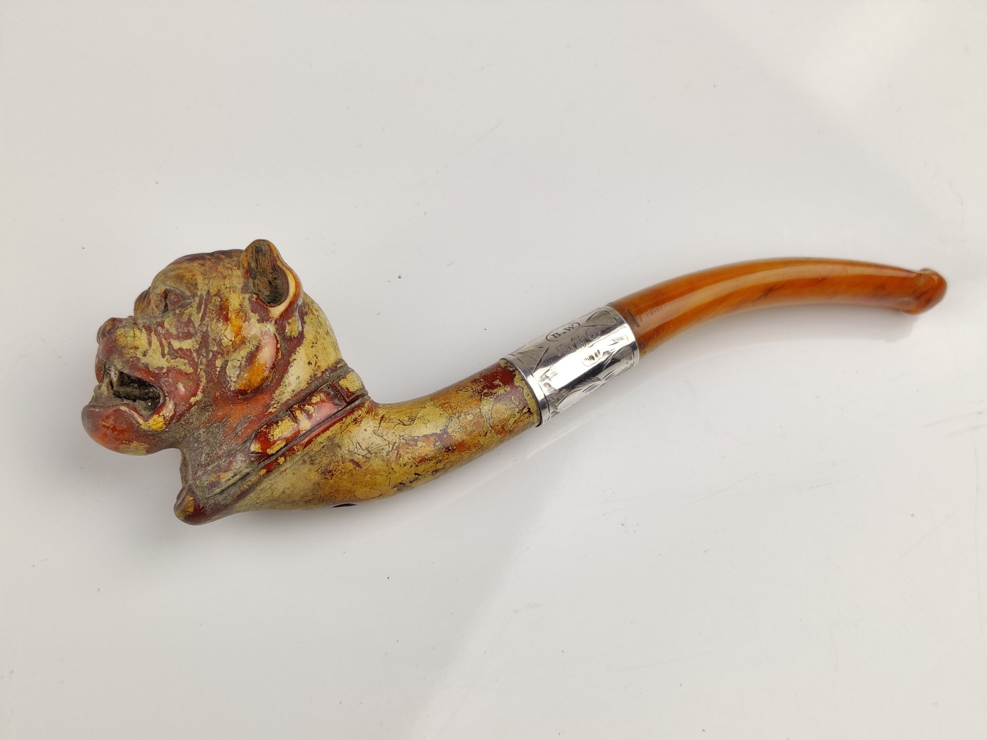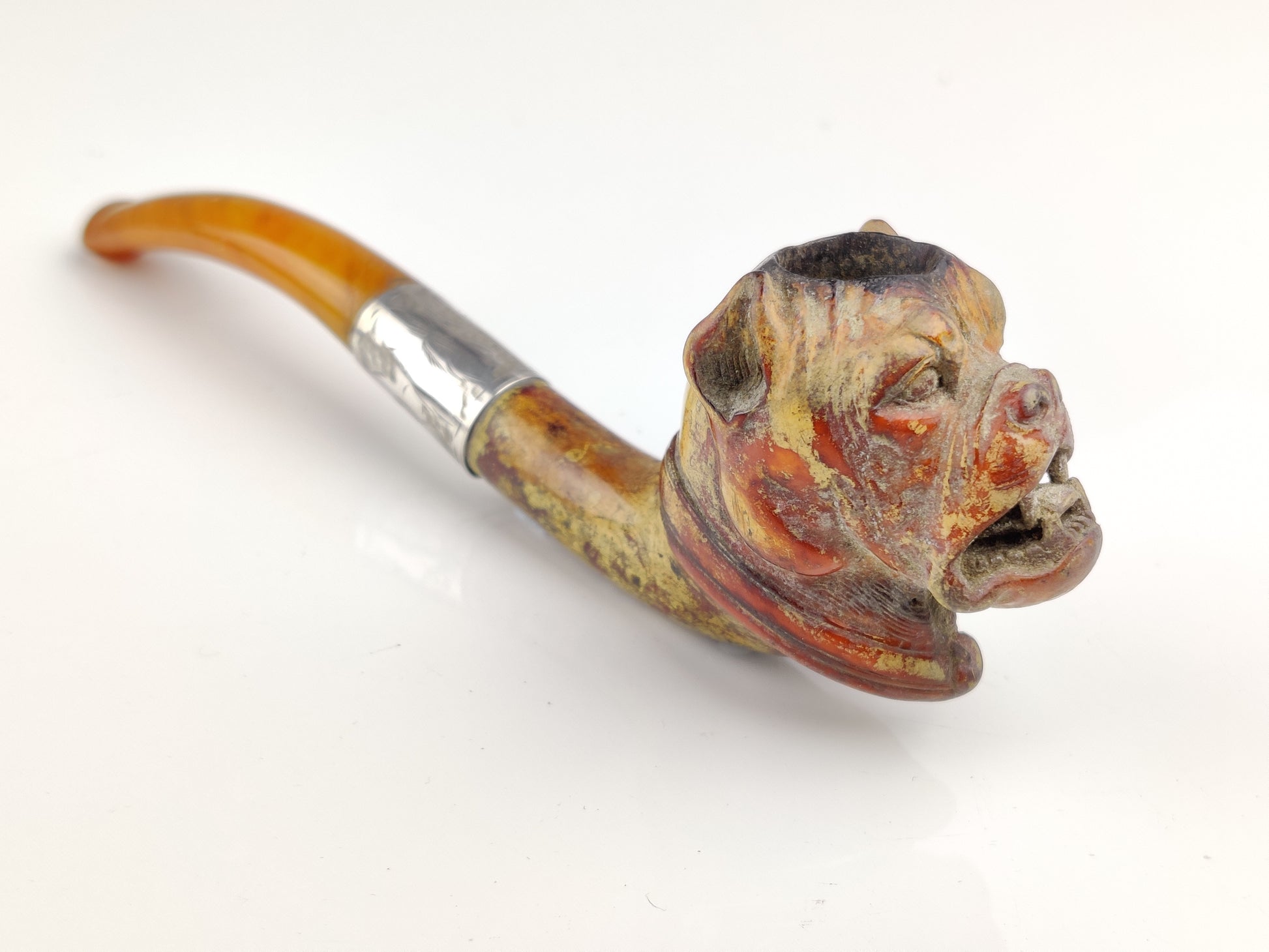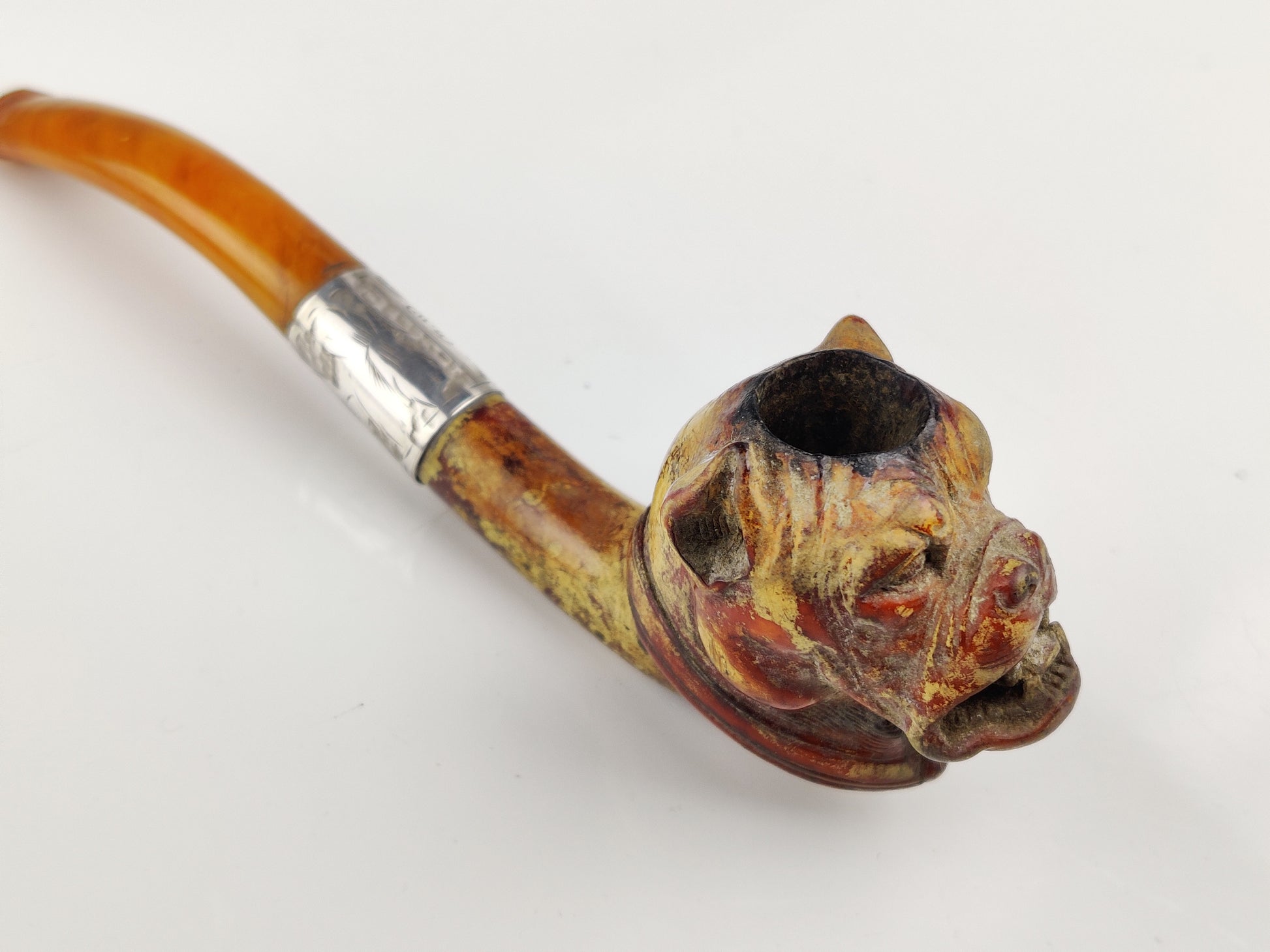 An exceptional 1880s carved Meerschaum "Bulldog" with engraved silver collar with the initials BW, amber cheroot/pipe, cased in original case.