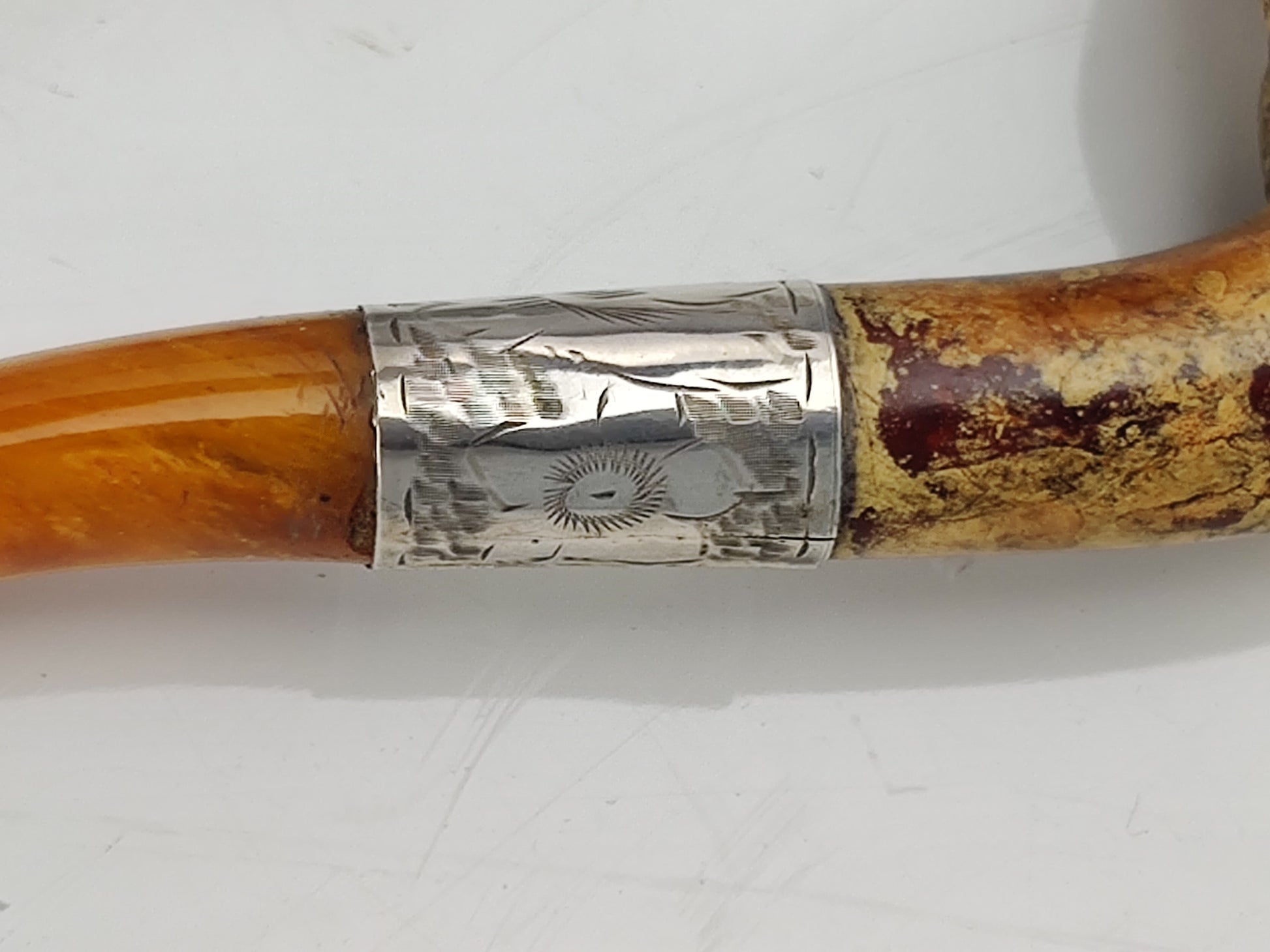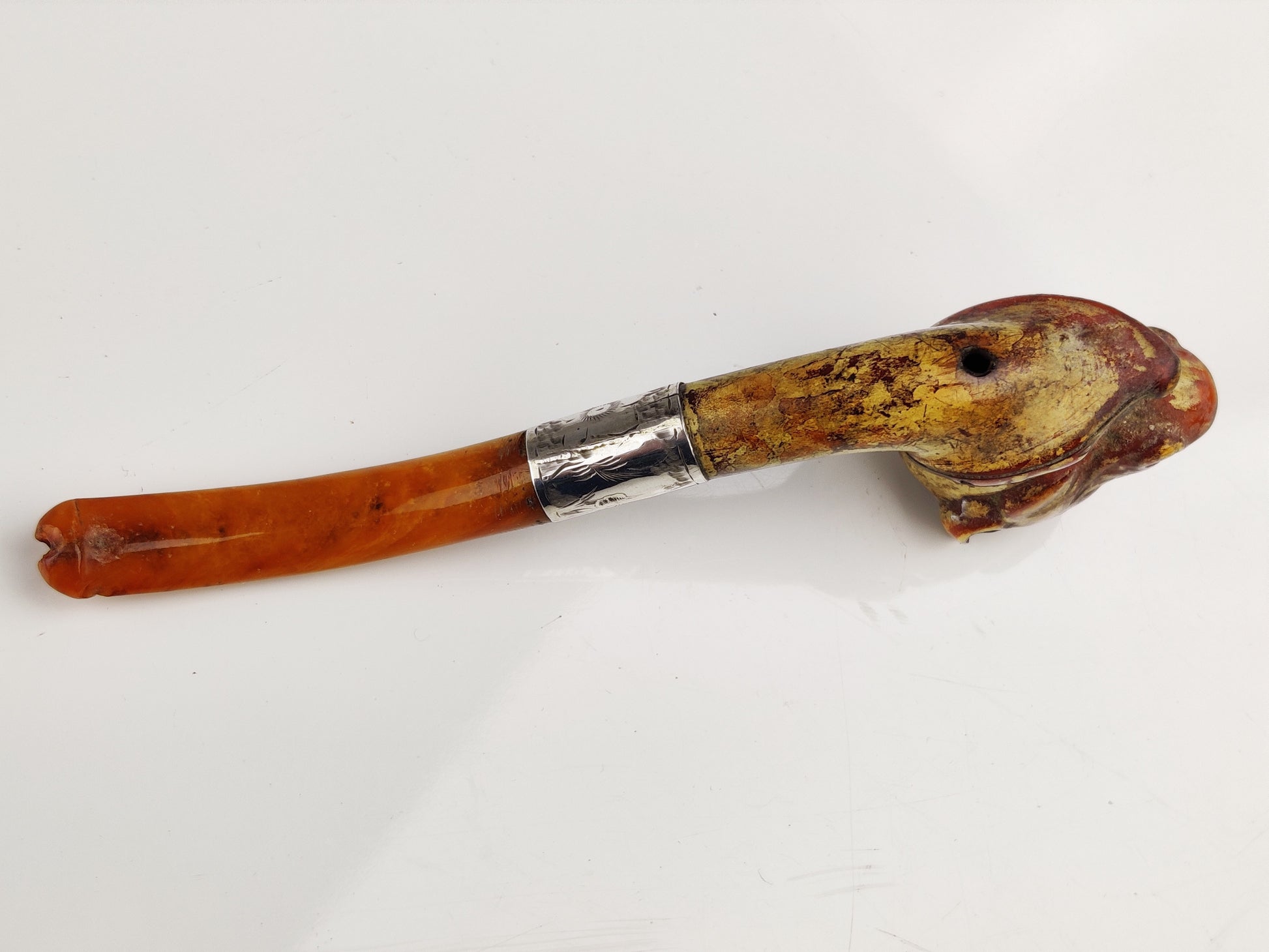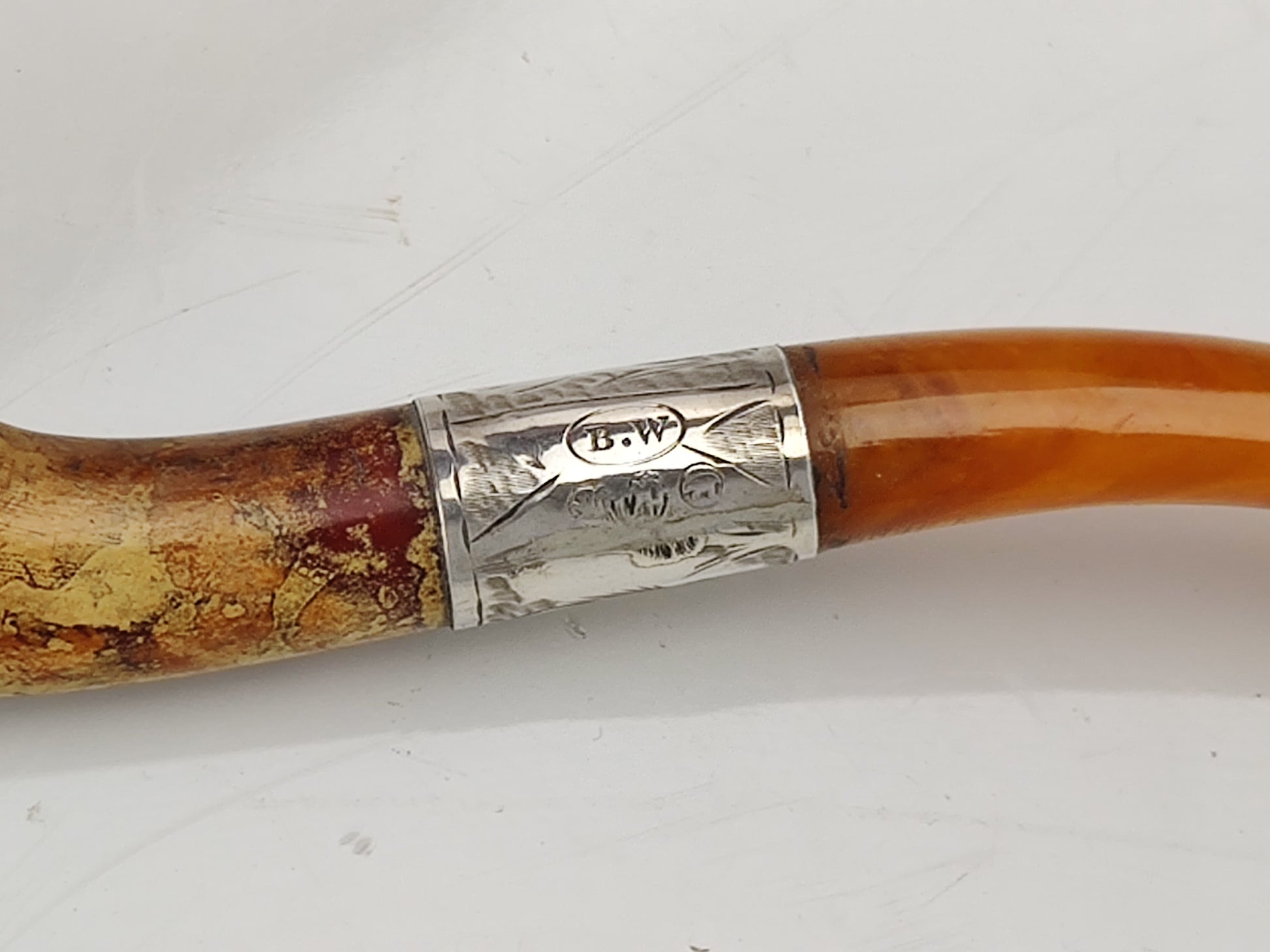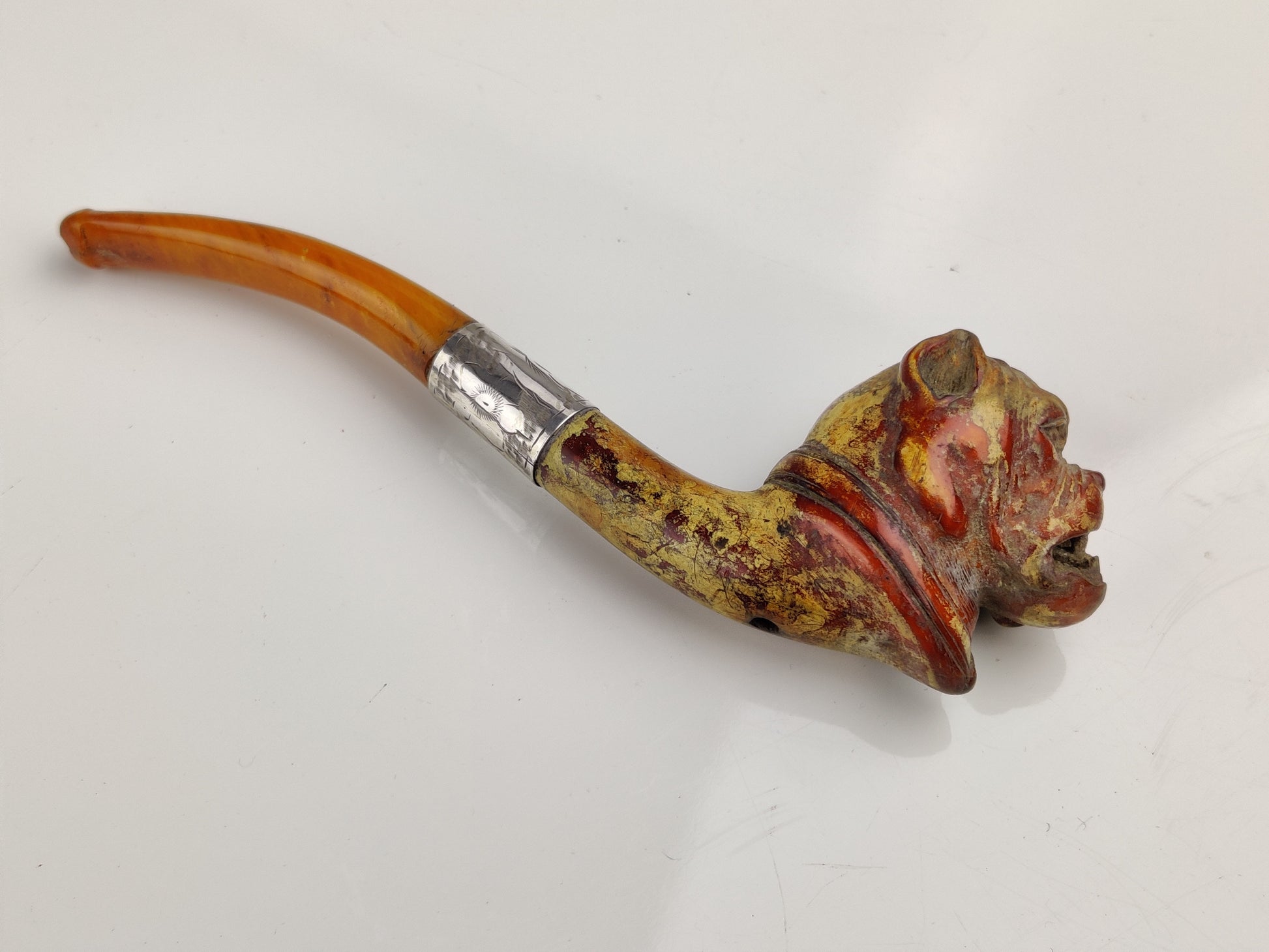 An exceptional 1880s carved Meerschaum "Bulldog" with engraved silver collar with the initials BW, amber cheroot/pipe, cased in original case.