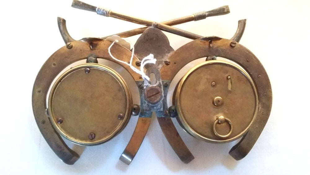 An unusual French 19th century decorative combination novelty clock & aneroid barometer with an equestrian and dog theme. Made from bronze and silver plate and in good working order.