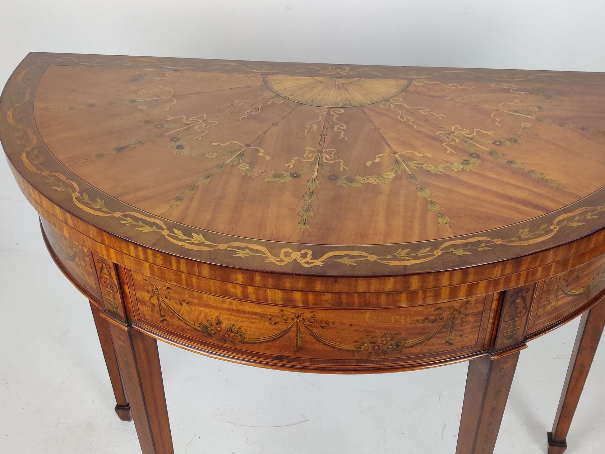 A fine satinwood demi lune inlaid card table in the Edwardian Sheraton style. Beautifully inlaid with swags and hair bells on squared tapered legs with a spade foot. The gateleg to the rear swings out to allow the support of the foldover baize top. All in original condition.