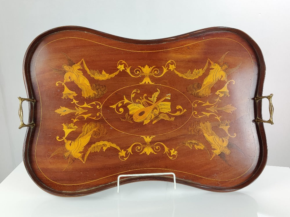 An Edwardian mahogany marquetry tray with a profusely inlaid top, shaped border and in very good condition.
