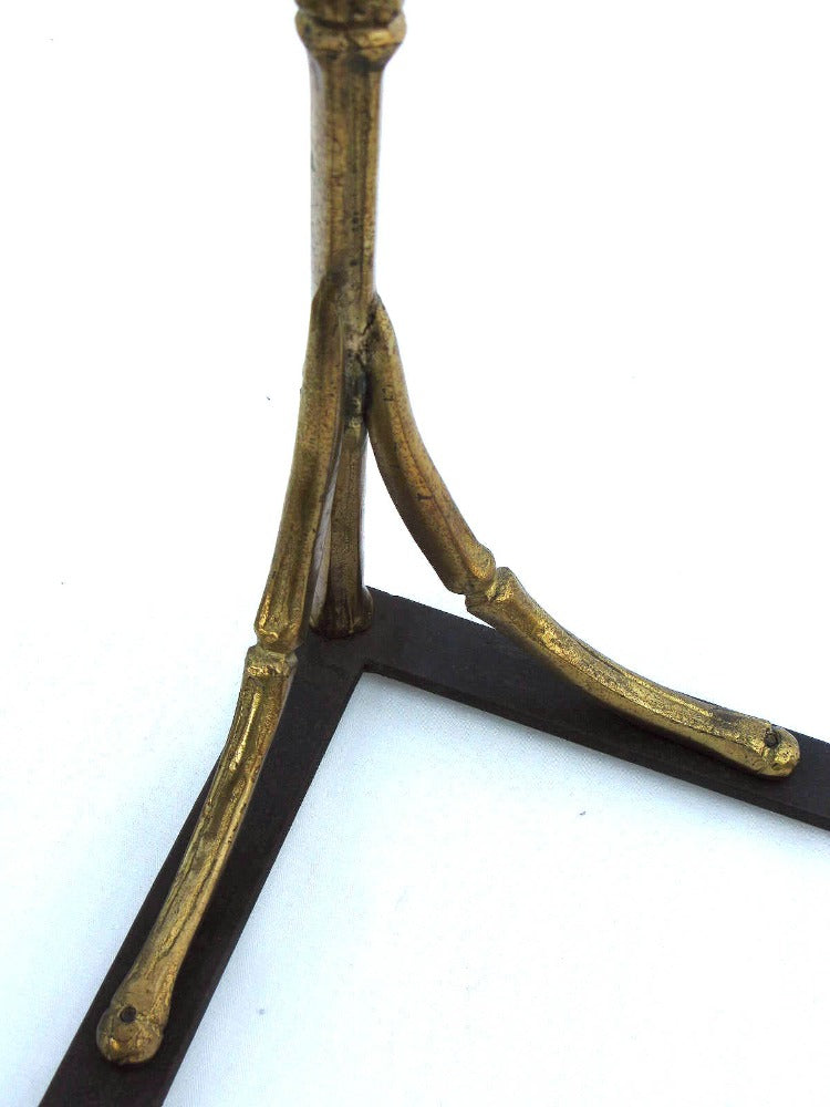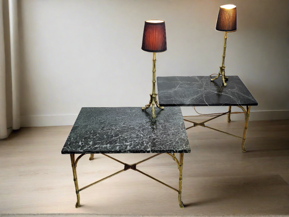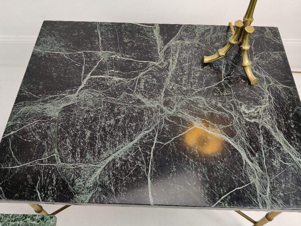 Exquisite pair of vintage mid 20th Century French Maison Bagues side/coffee tables with stylish gilt bronze faux bamboo bases and original variegated dark Verdi Tinos Green marble tops. These outstanding tables are in great original condition. Each foot is stamped with a number 1 -4 and the marble has a great patina to the underneath. (Table lamps not included)