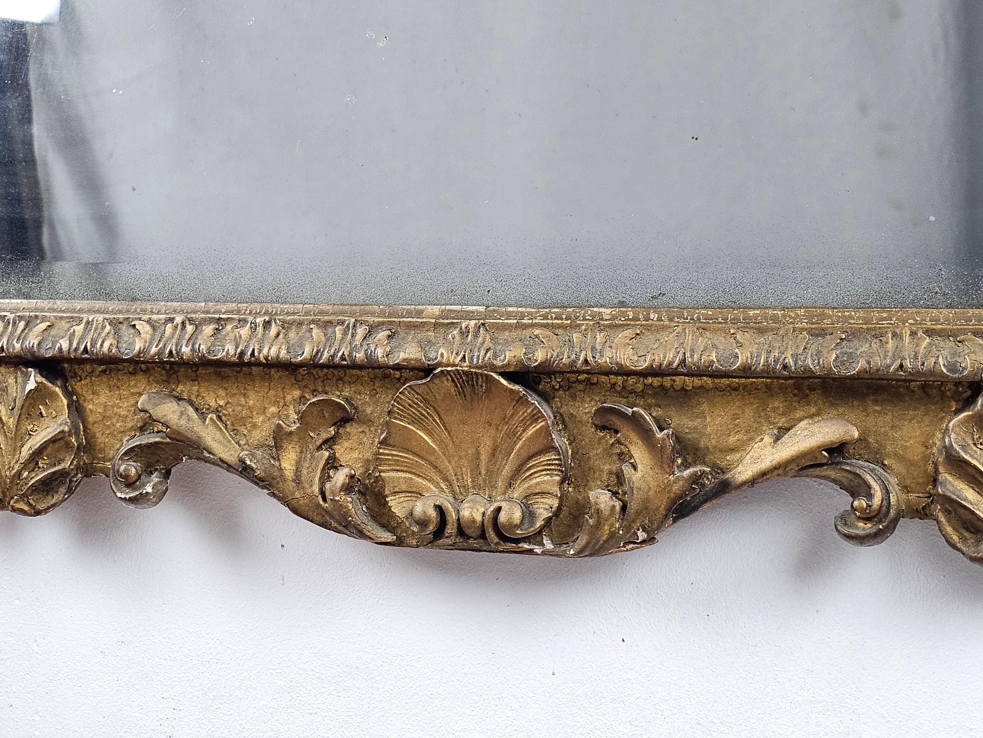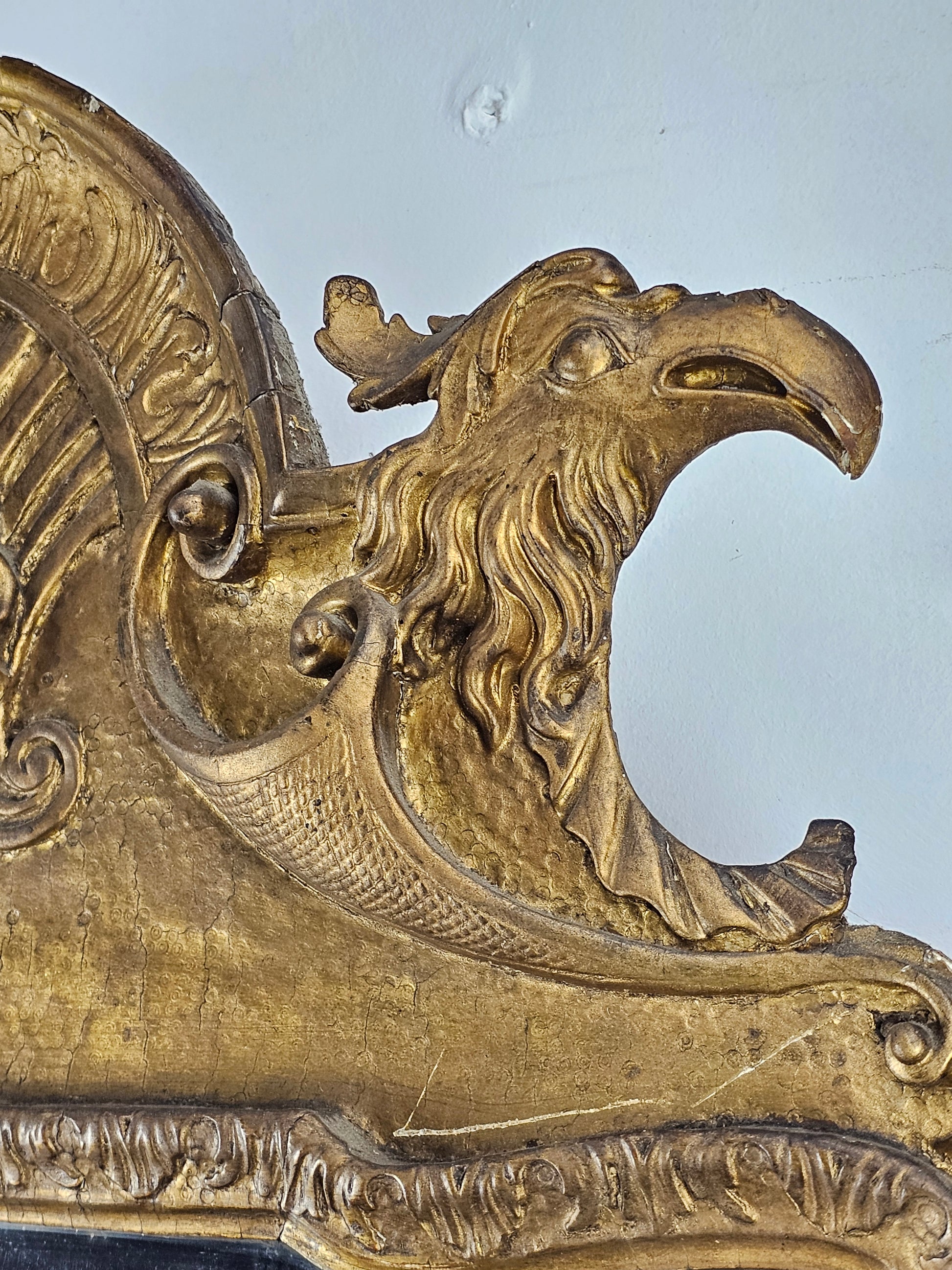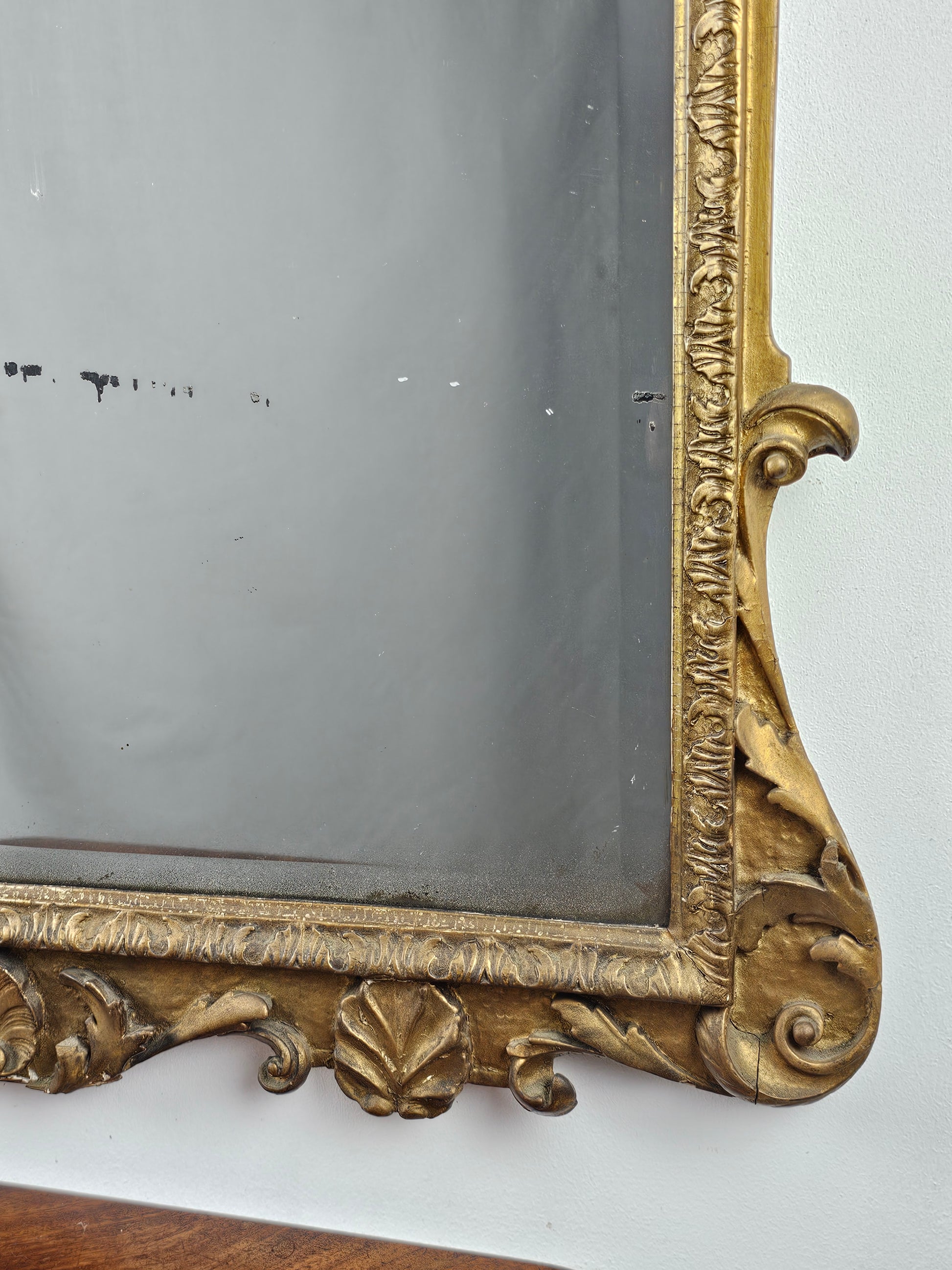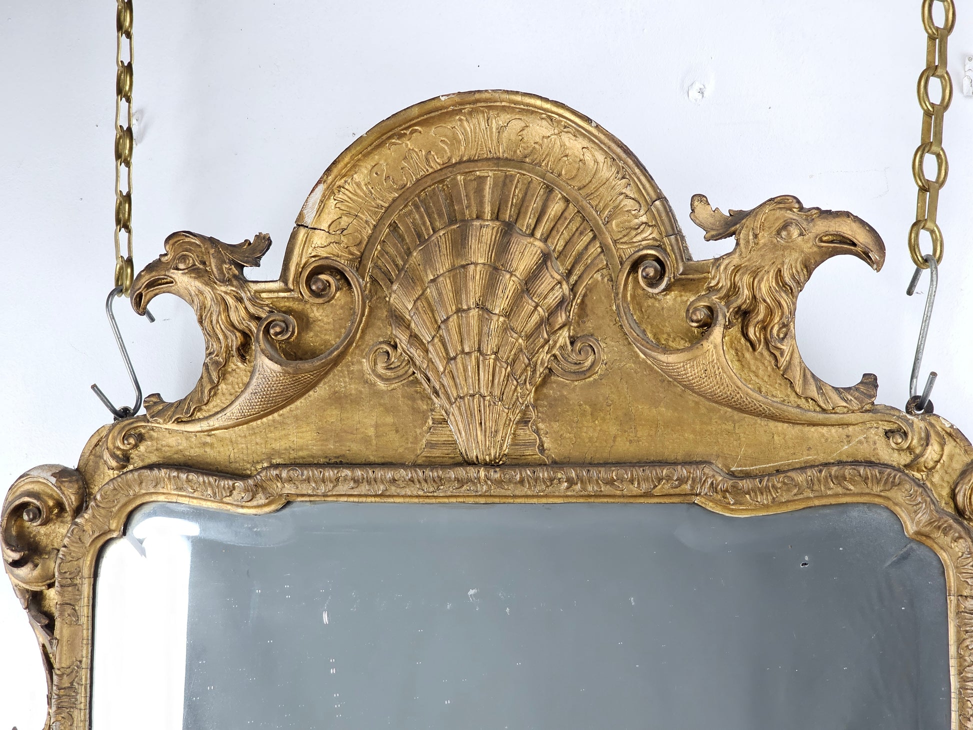 The shaped and softly bevelled looking-glass sits within an upright gilt gesso moulded frame, decorated with a finely carved shell, scrolling lobed acanthus corners and a shaped apron of scrolls centred by a naturalistic shell and eagle heads.