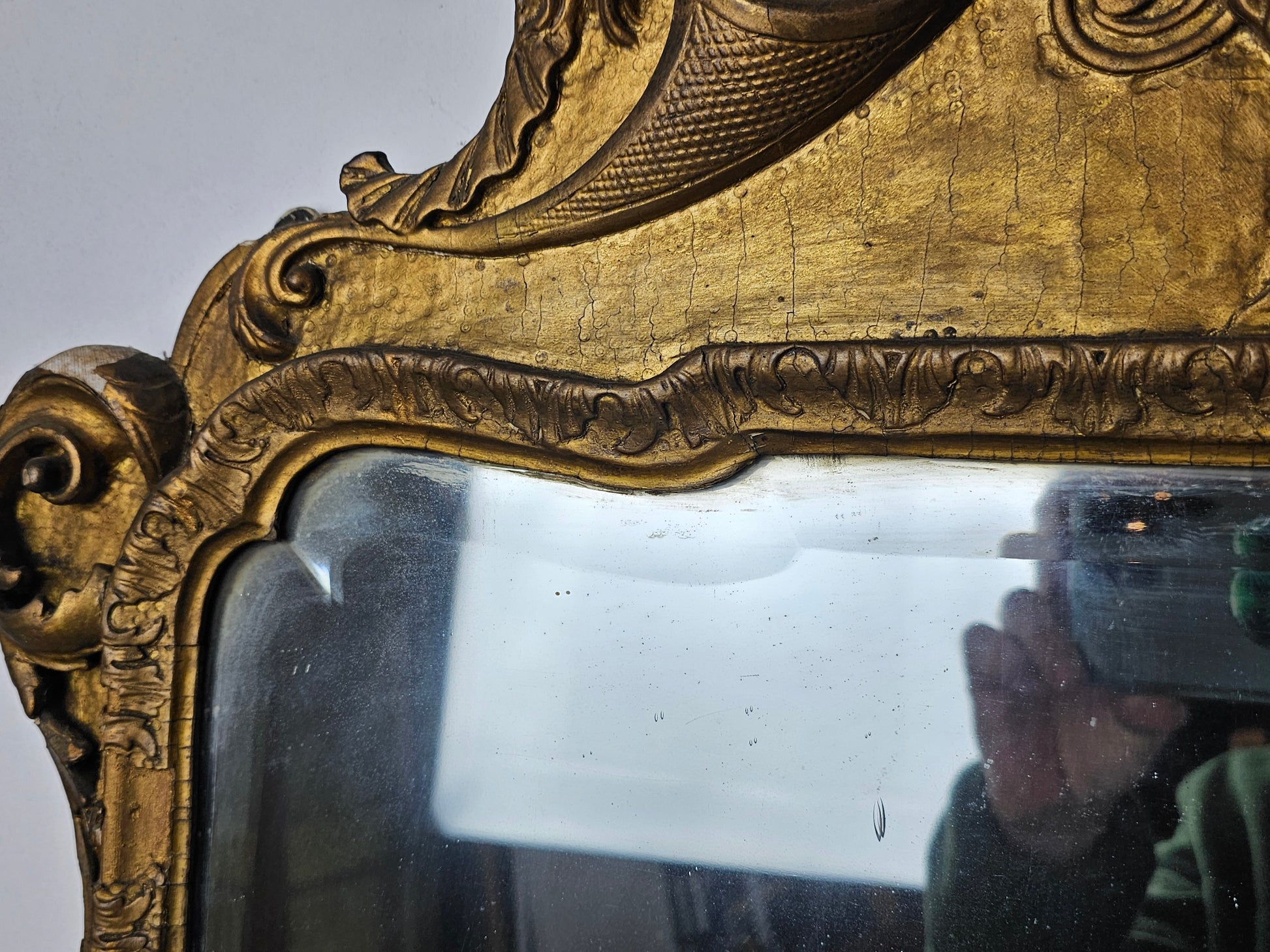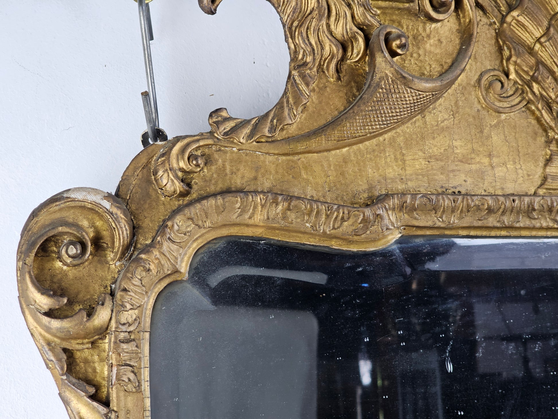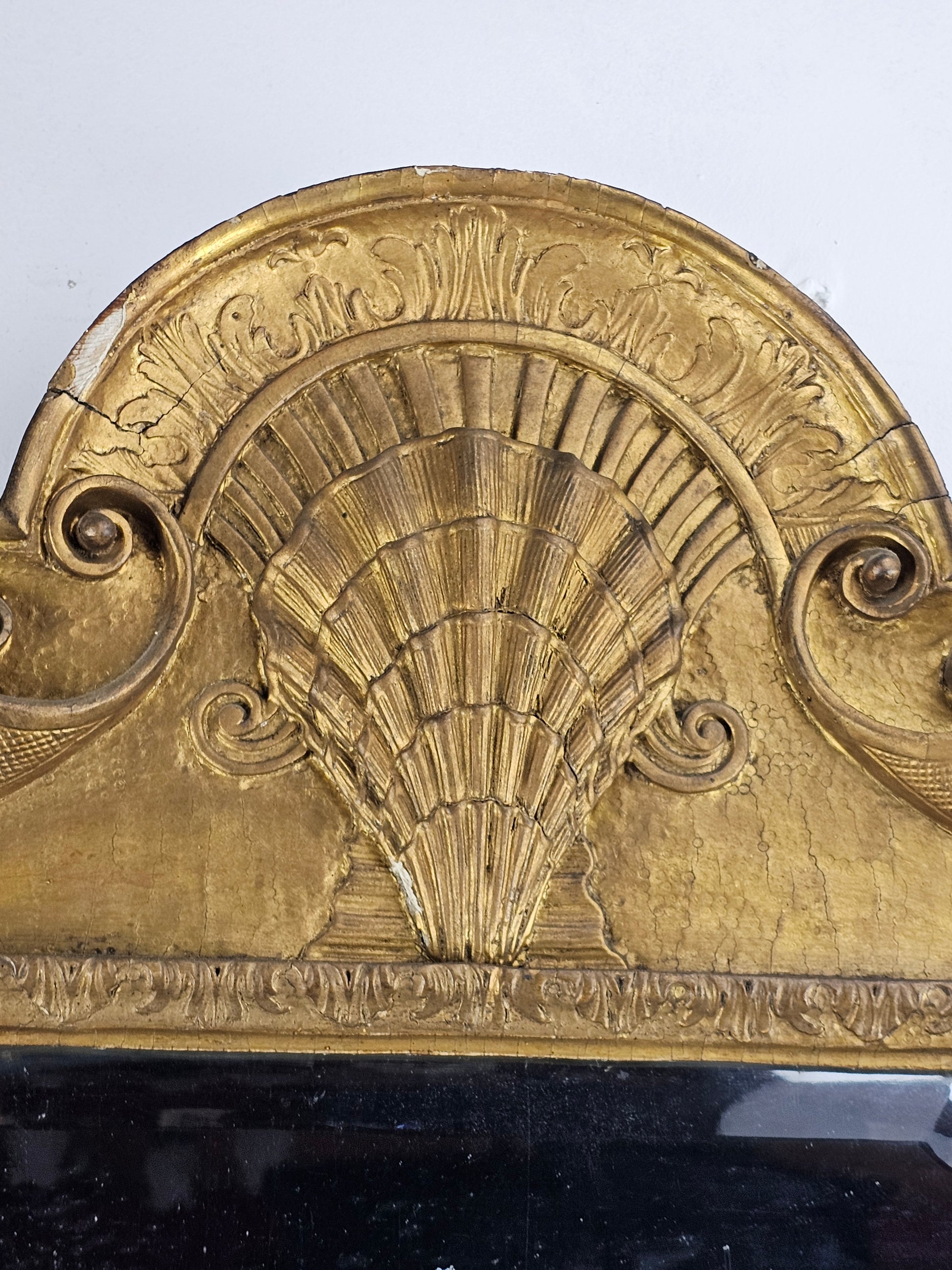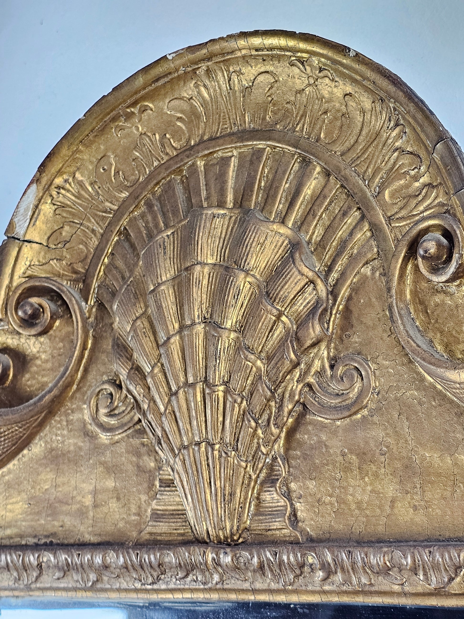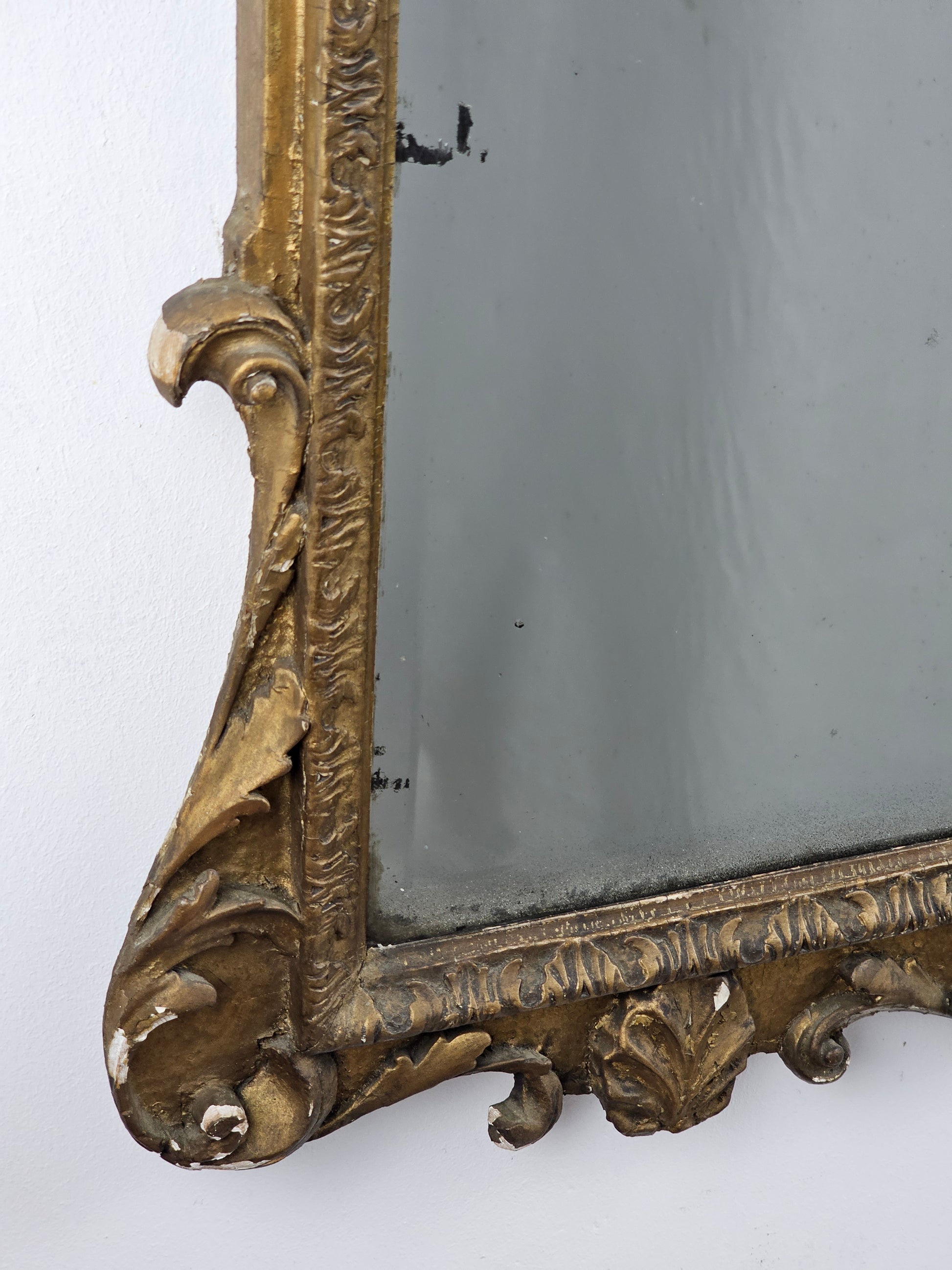 The shaped and softly bevelled looking-glass sits within an upright gilt gesso moulded frame, decorated with a finely carved shell, scrolling lobed acanthus corners and a shaped apron of scrolls centred by a naturalistic shell and eagle heads.