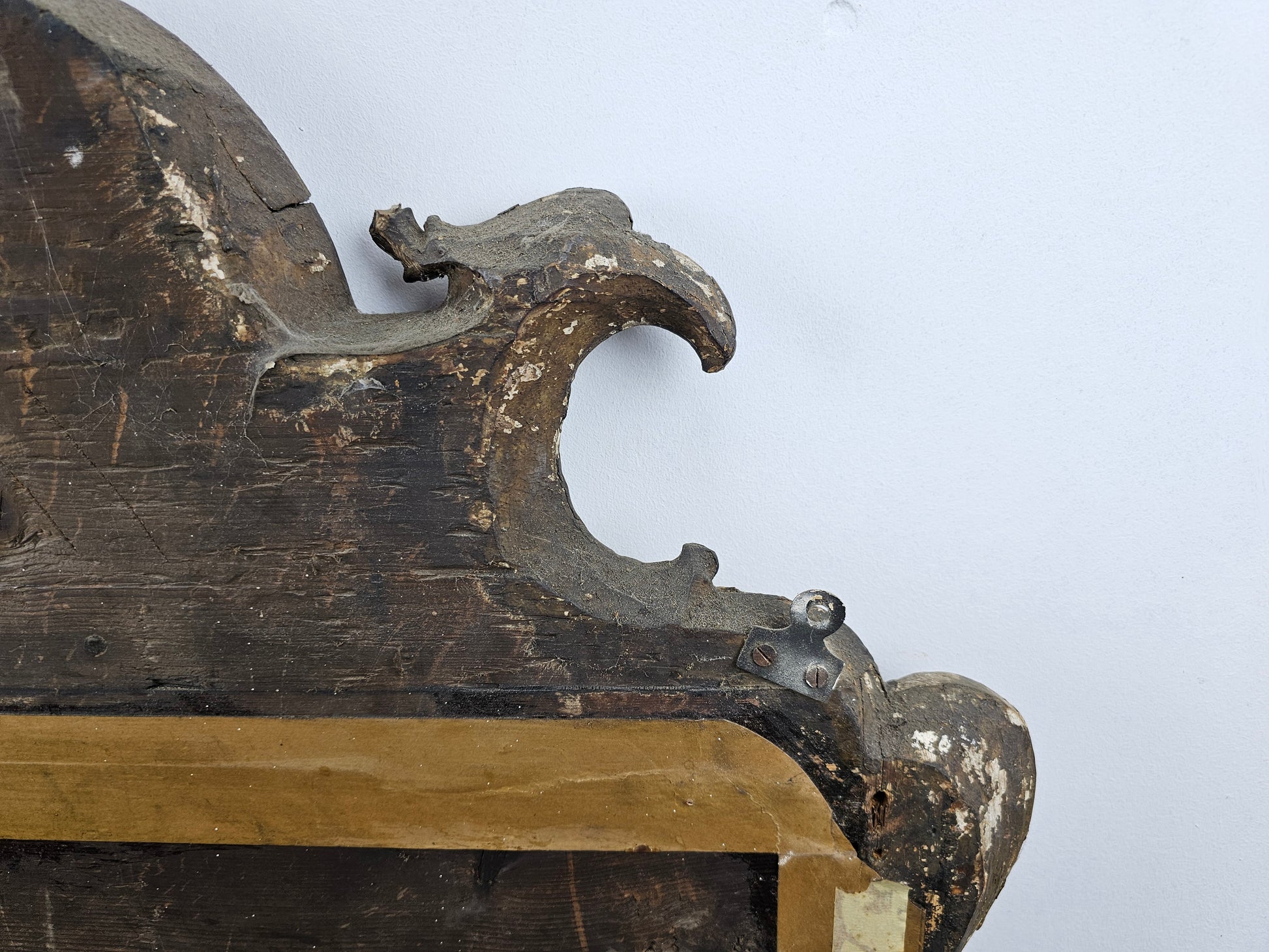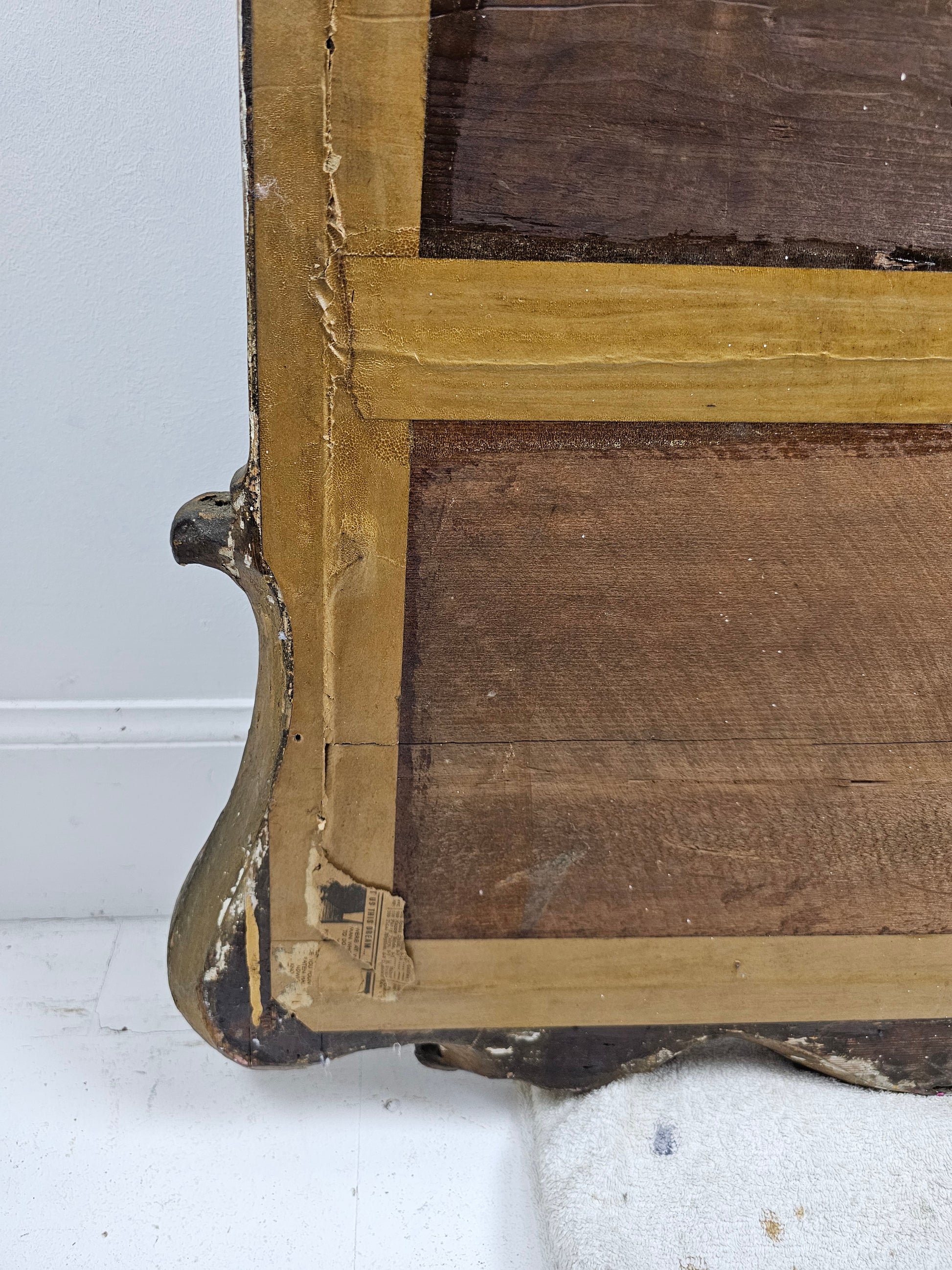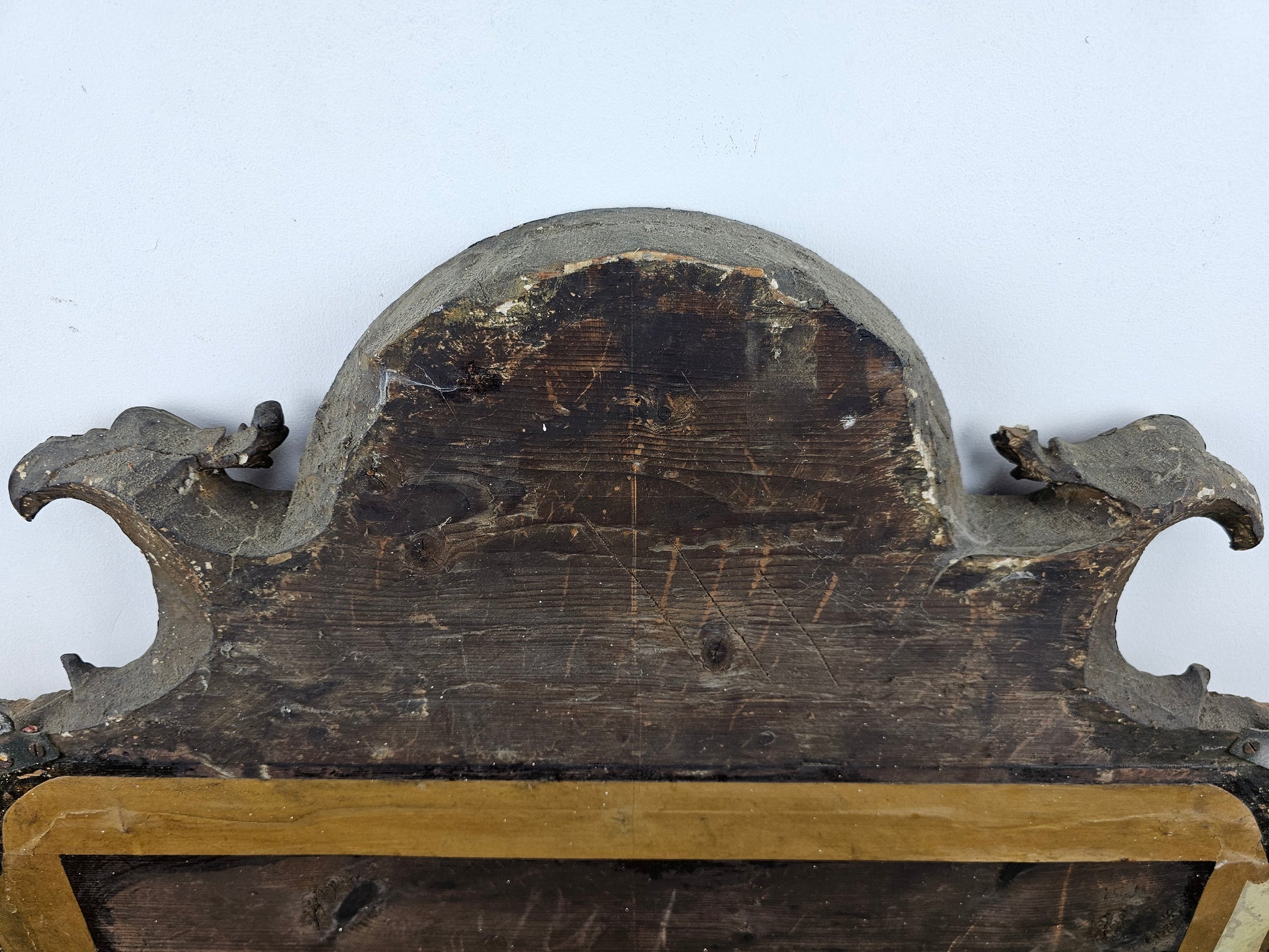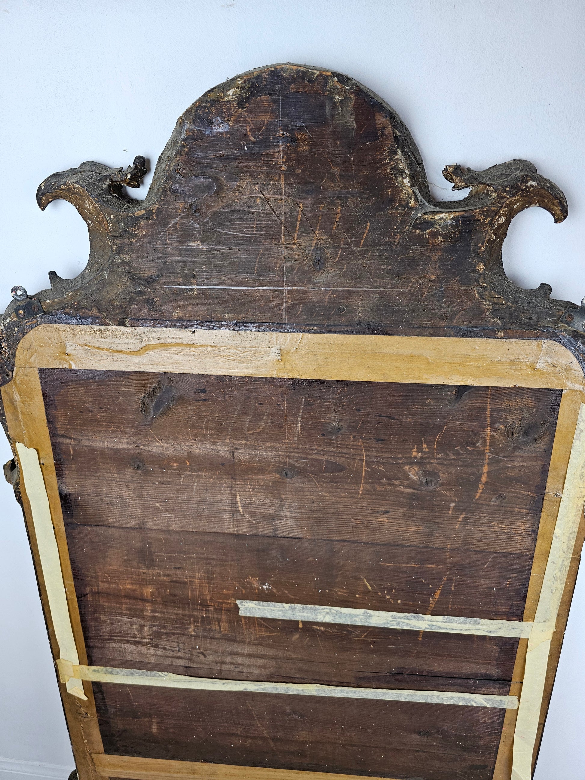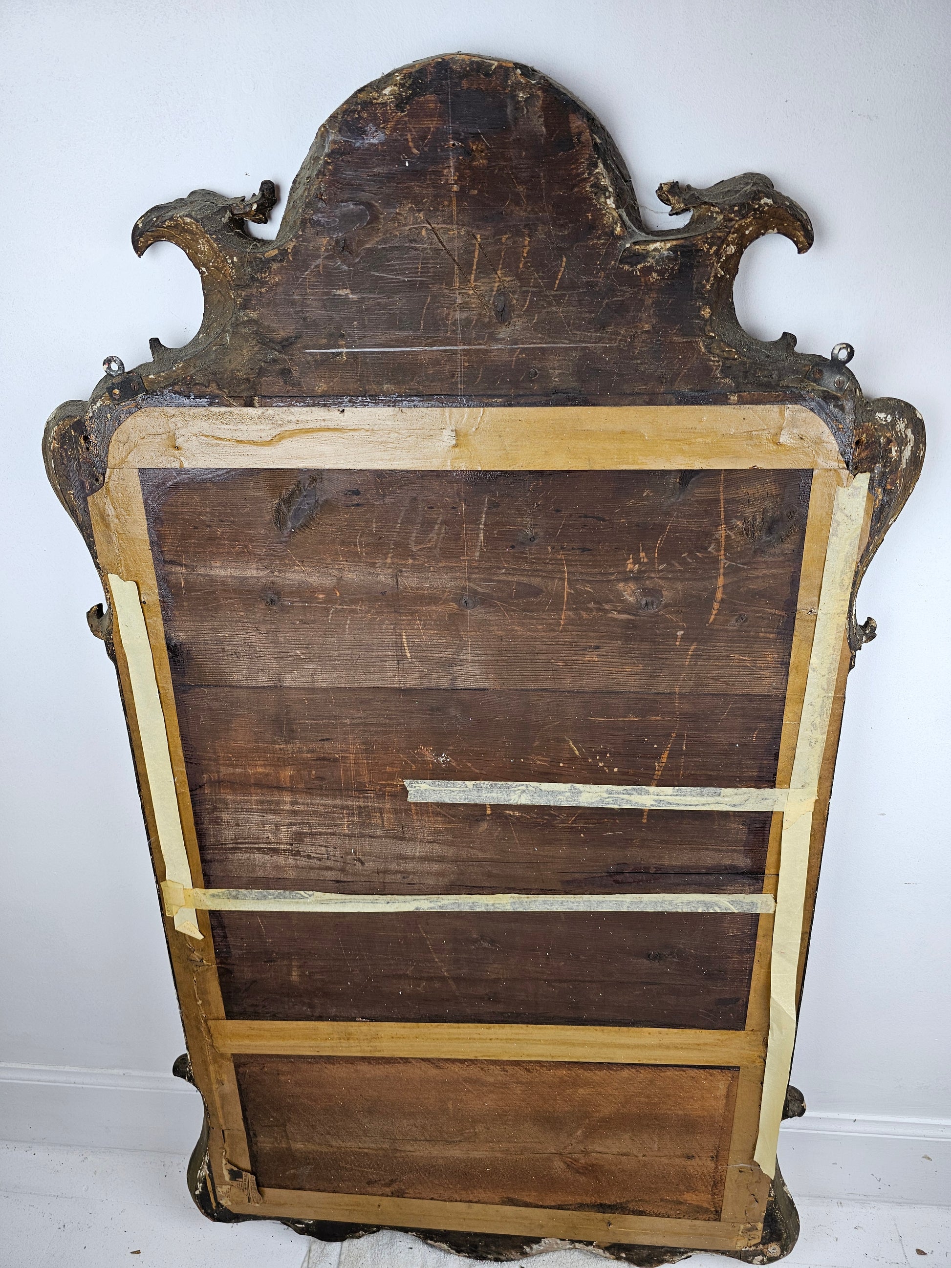 Bold volute scrolls appears to be one of the recurrent aesthetic elements found on mirrors executed by John Belchier as are eagle heads. However, other aspects widely associated with Belchier’s work is the inclusion of foliate strap work decoration terminating in an acanthus scroll, and a Venus-shell apron. All of which can be seen on the present mirror.