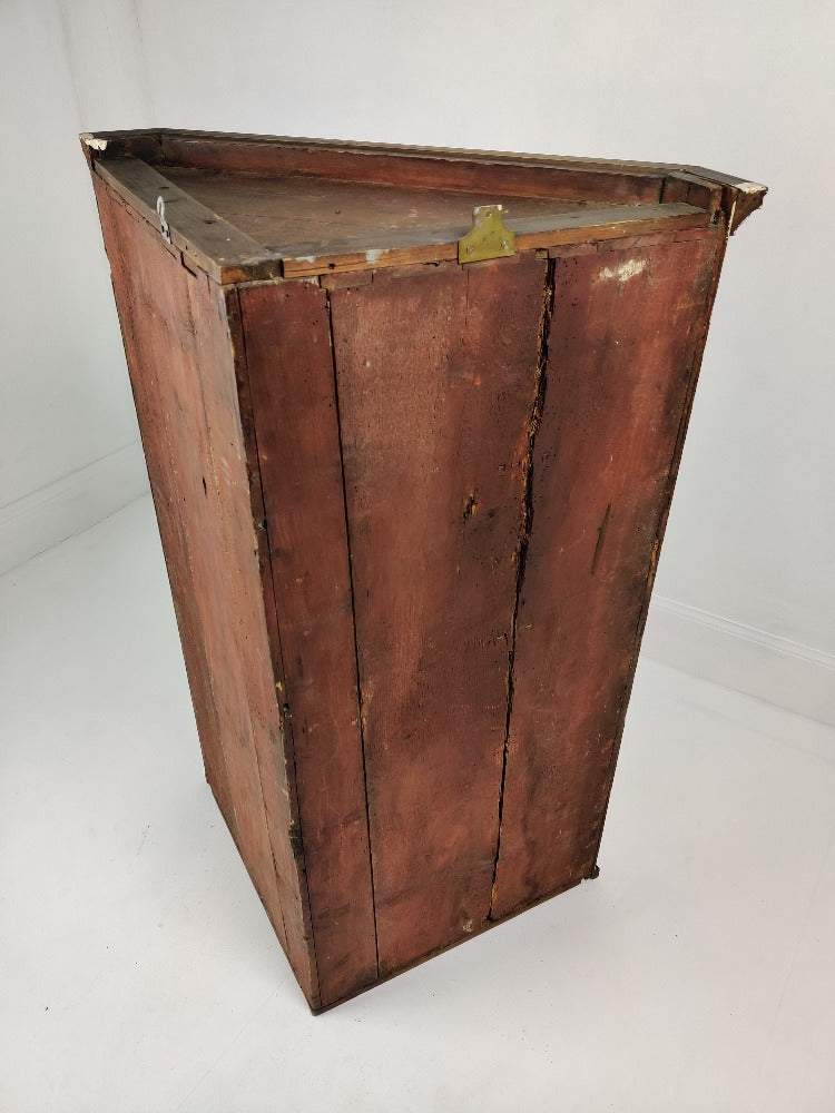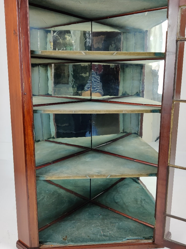 Made in mahogany, it has lovely old glass in the door, with original old drawn glass mirror inside and to the back of each shelf. In beautiful condition and with working lock and key, this piece would brighten up the corner of any room.