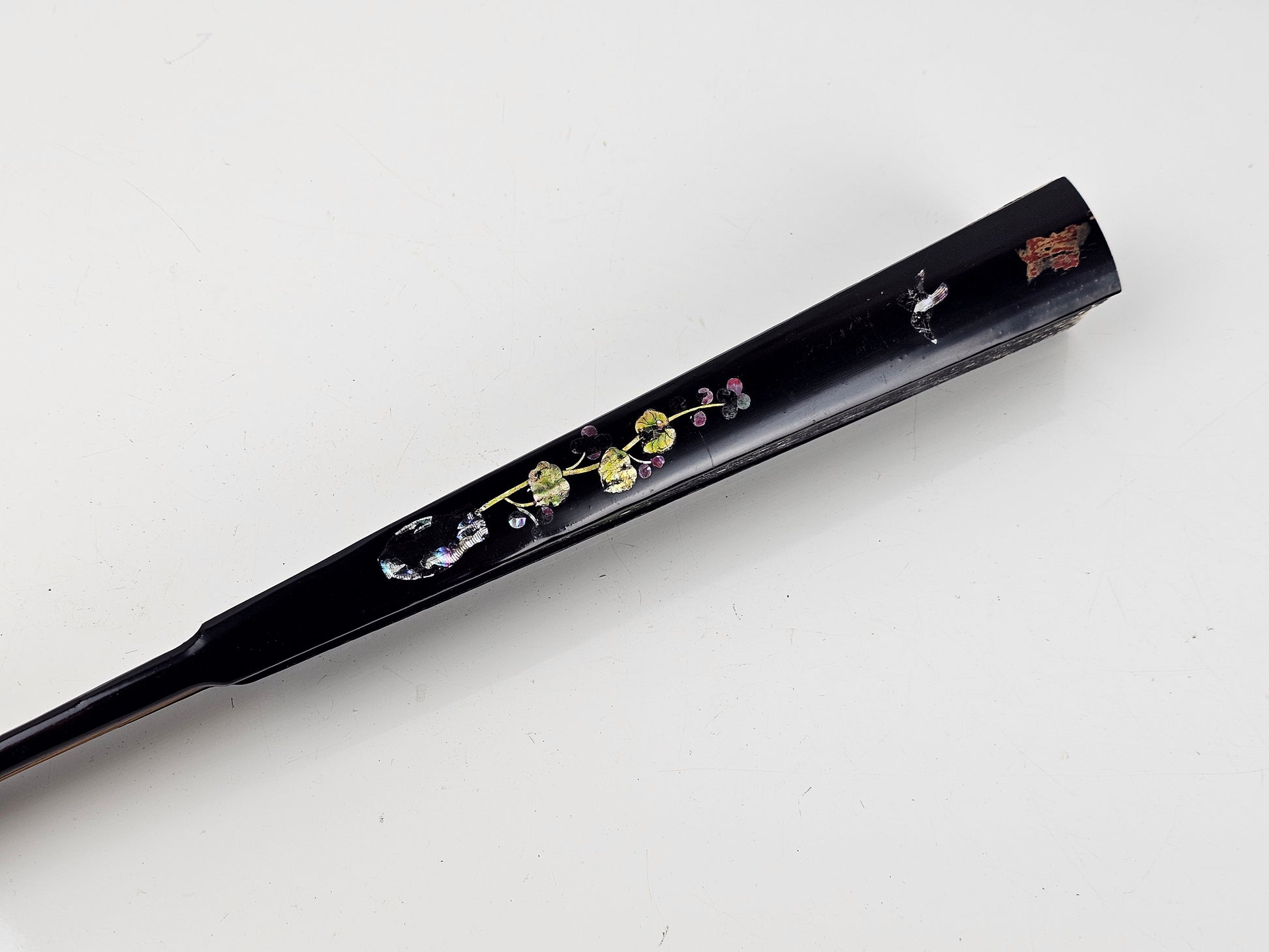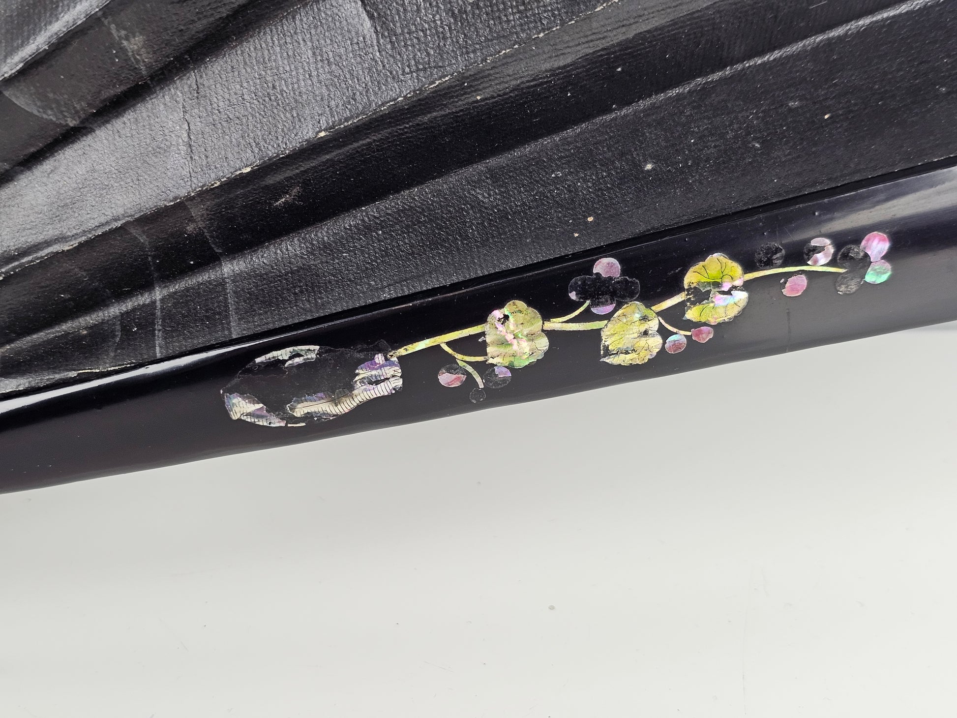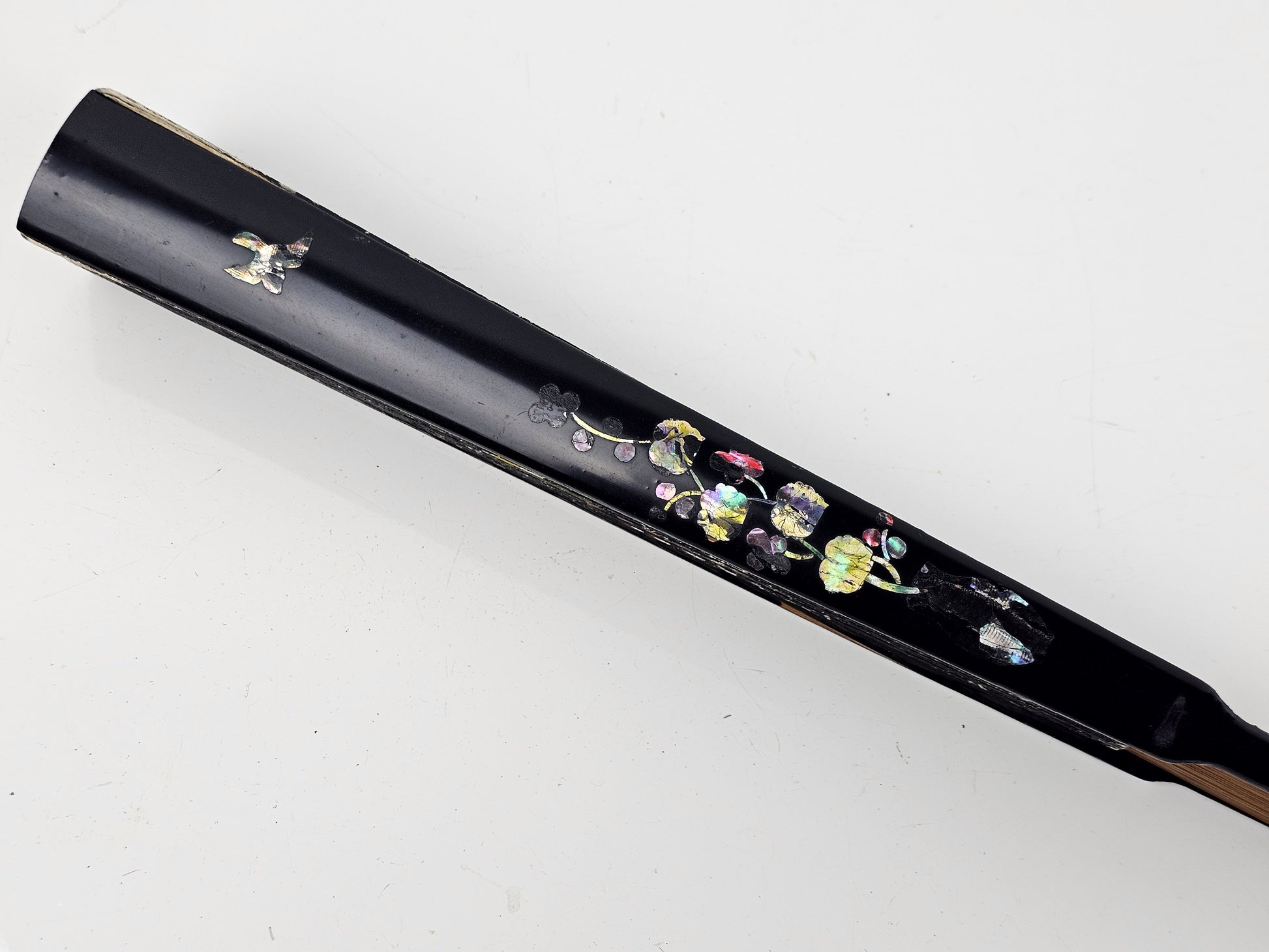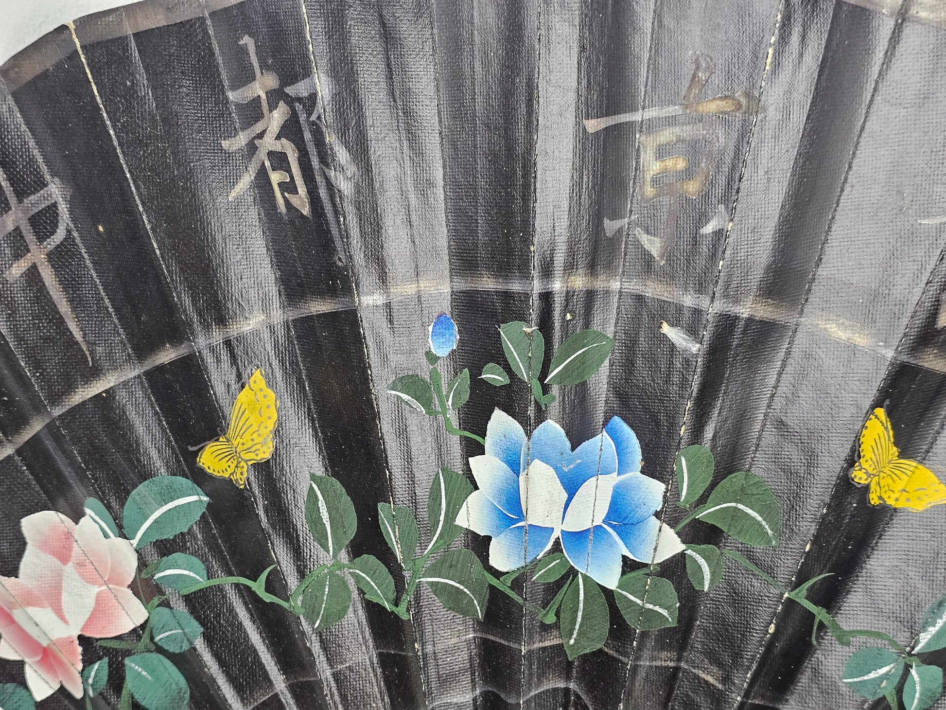 Early 20th century large antique hand-painted Japanese fan. Beautifully painted. Very nice bamboo sticks and mother-of pearl inlay to the outside. In good condition.