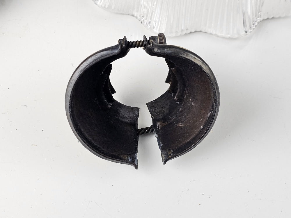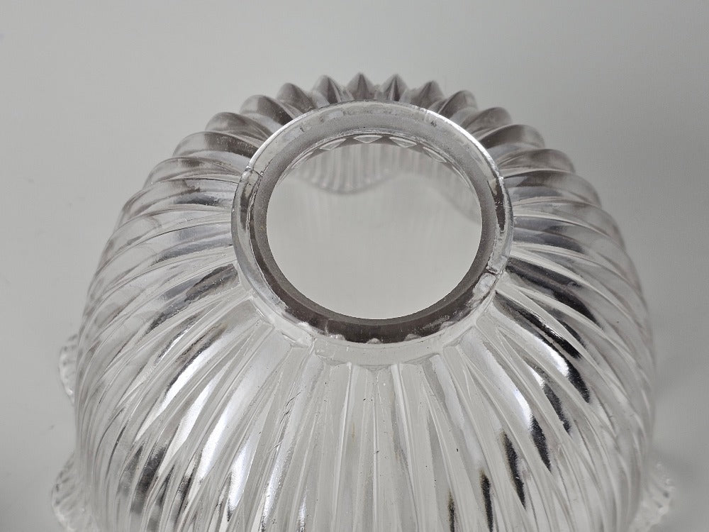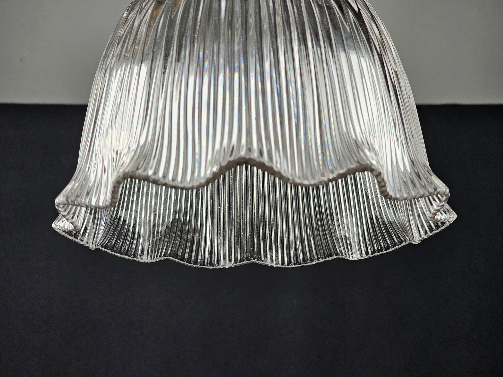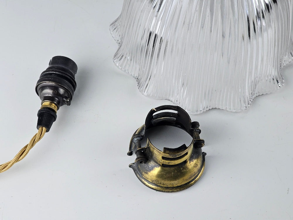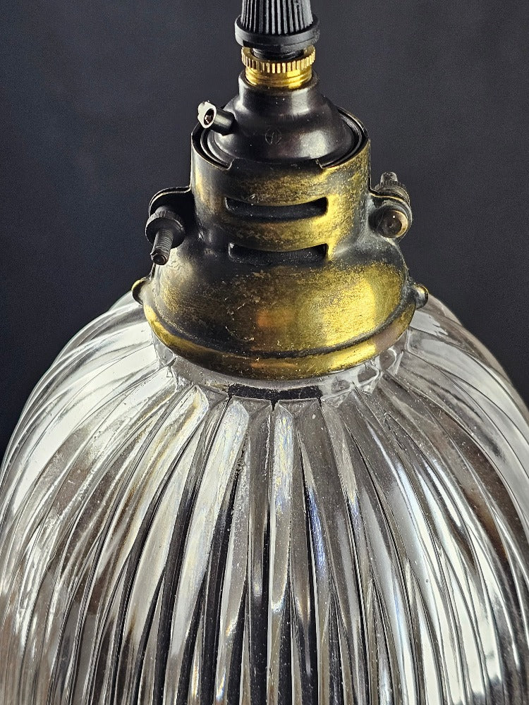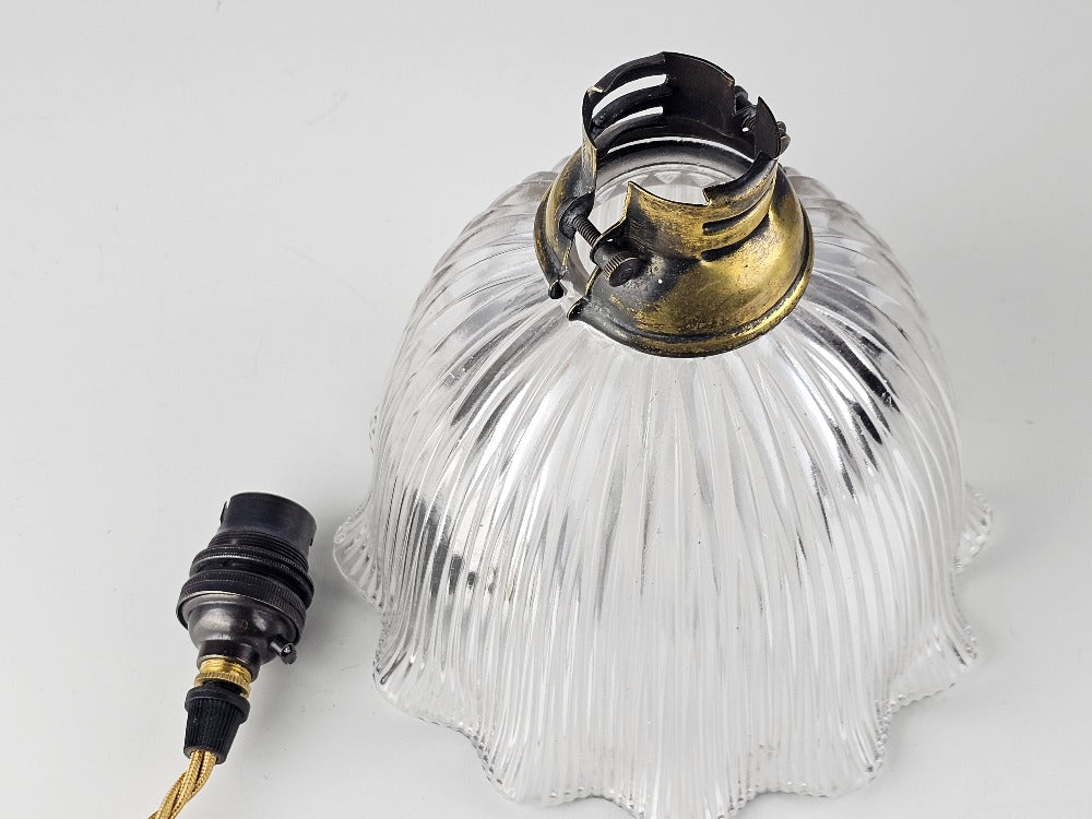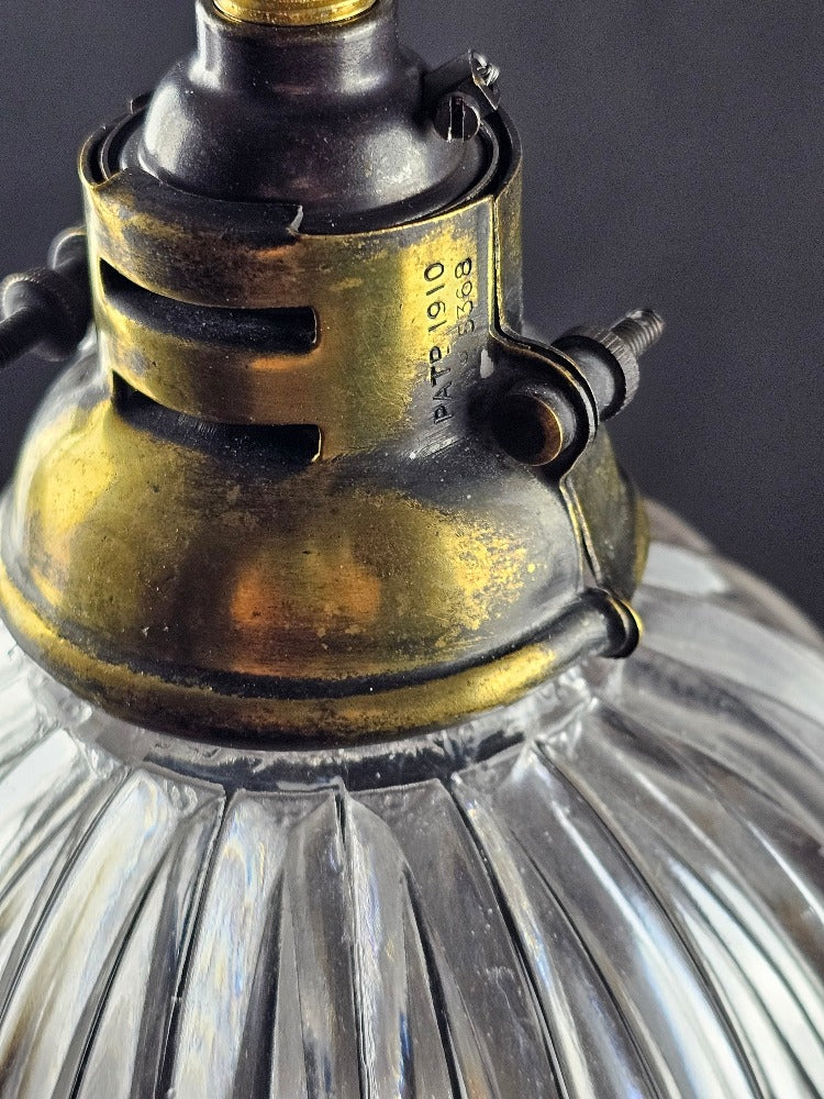 English pendant light period holophane glass with original antique shade holder. Supplied with new patinated lamp fitting re-wired with a gold antique style 3core flex.