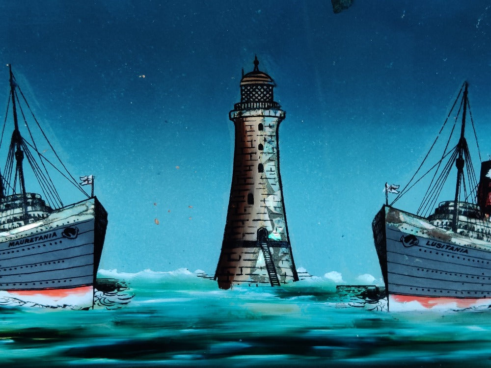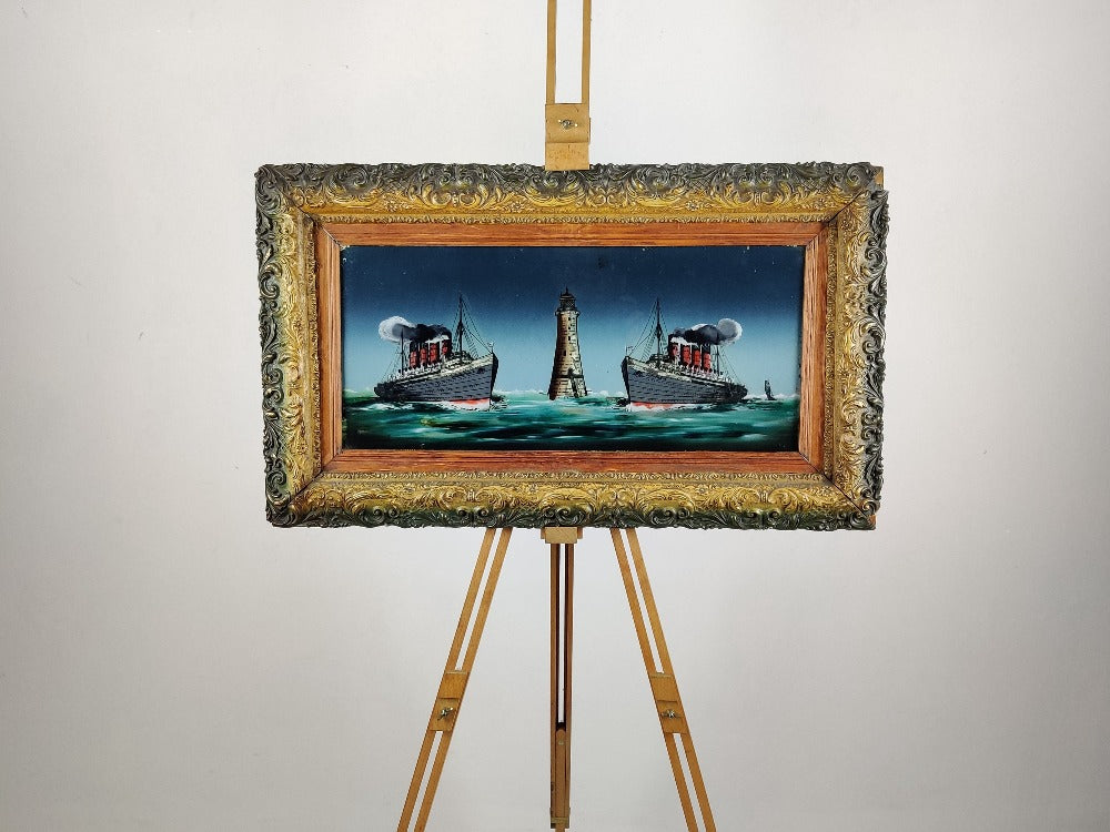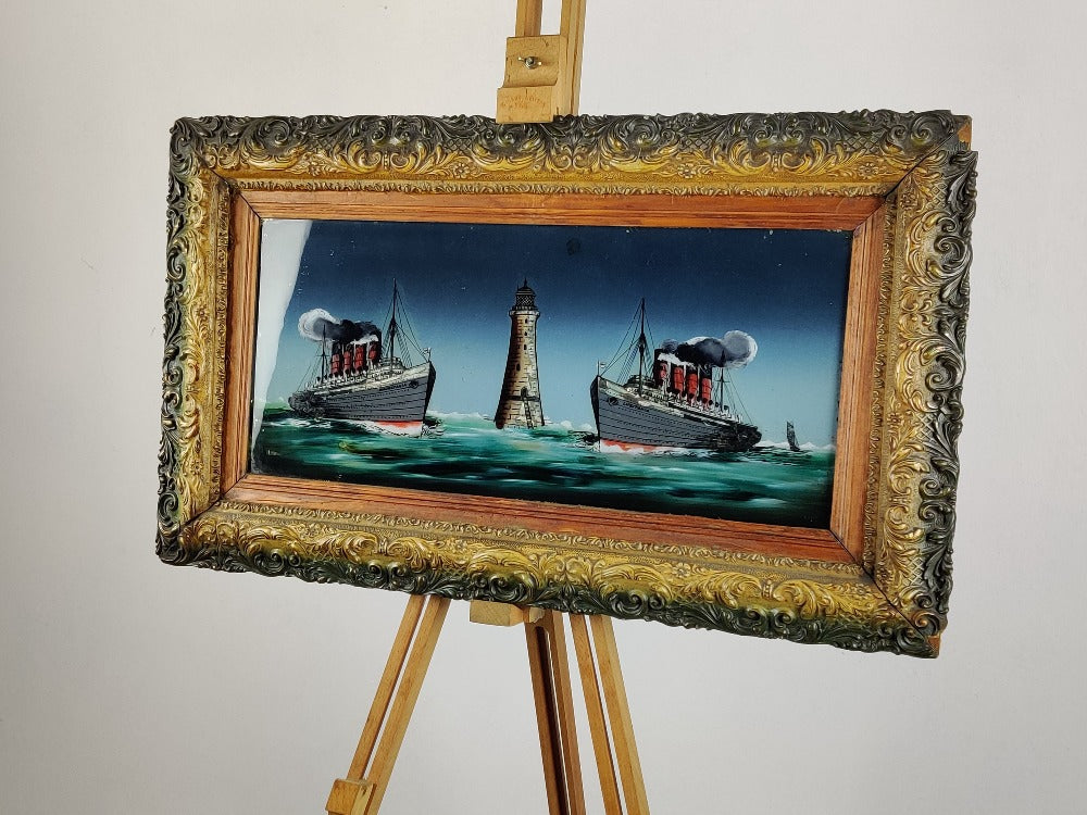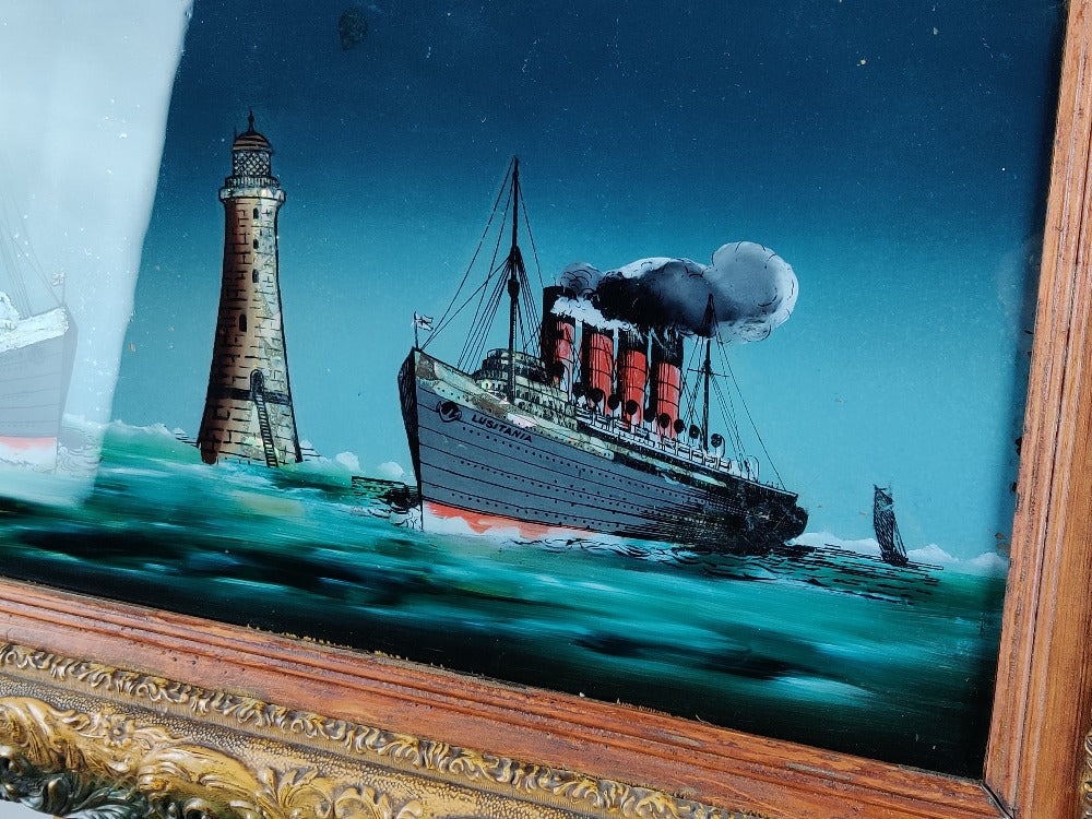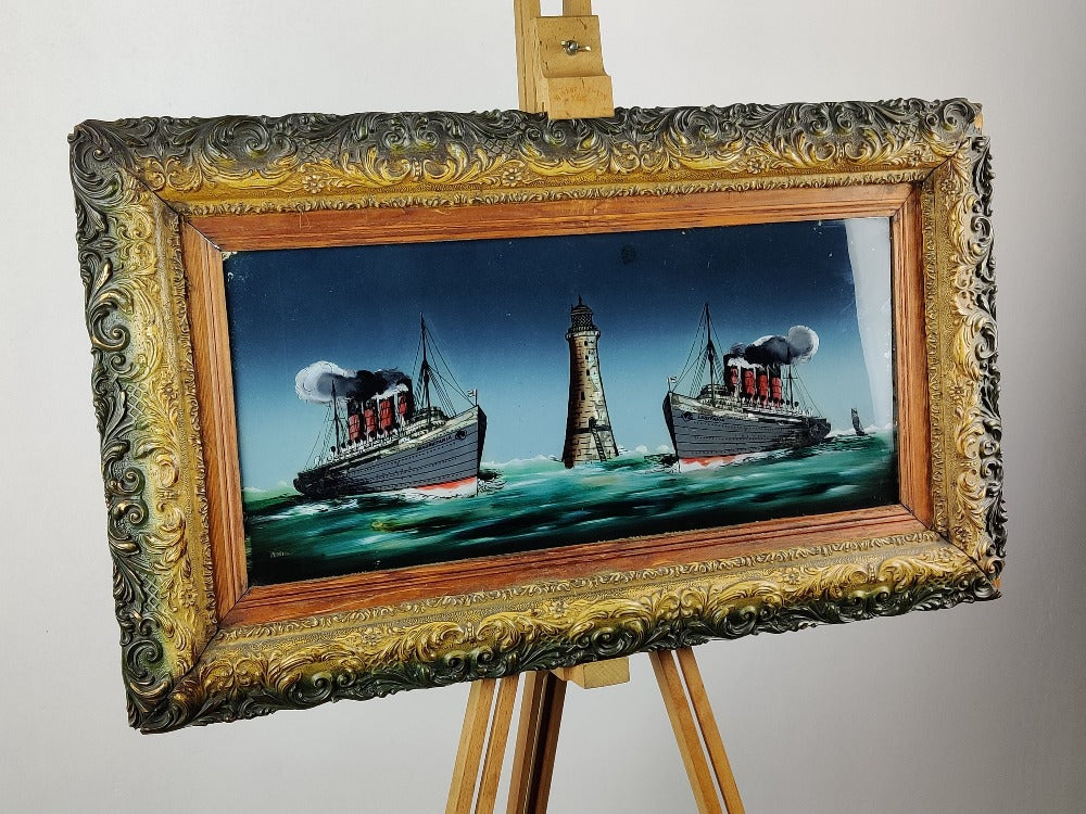 A rare early 20th century reverse painting on glass of good size, Lusitania and Mauretania at Bell rock lighthouse. This beauty comes in its original frame and pre-dates the sinking of Lusitania. The glossy surface of the glass really adds to the depth of this picture. There are small areas of wear and tear which only adds to the character.