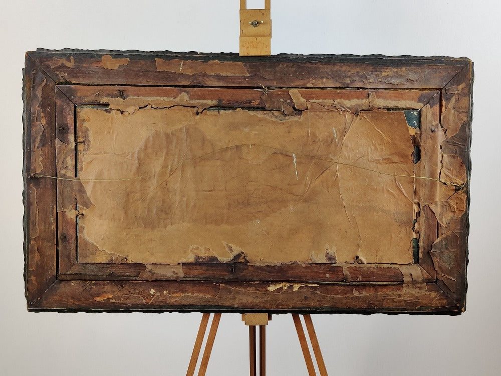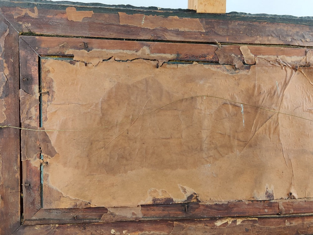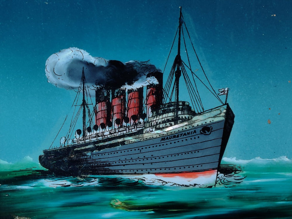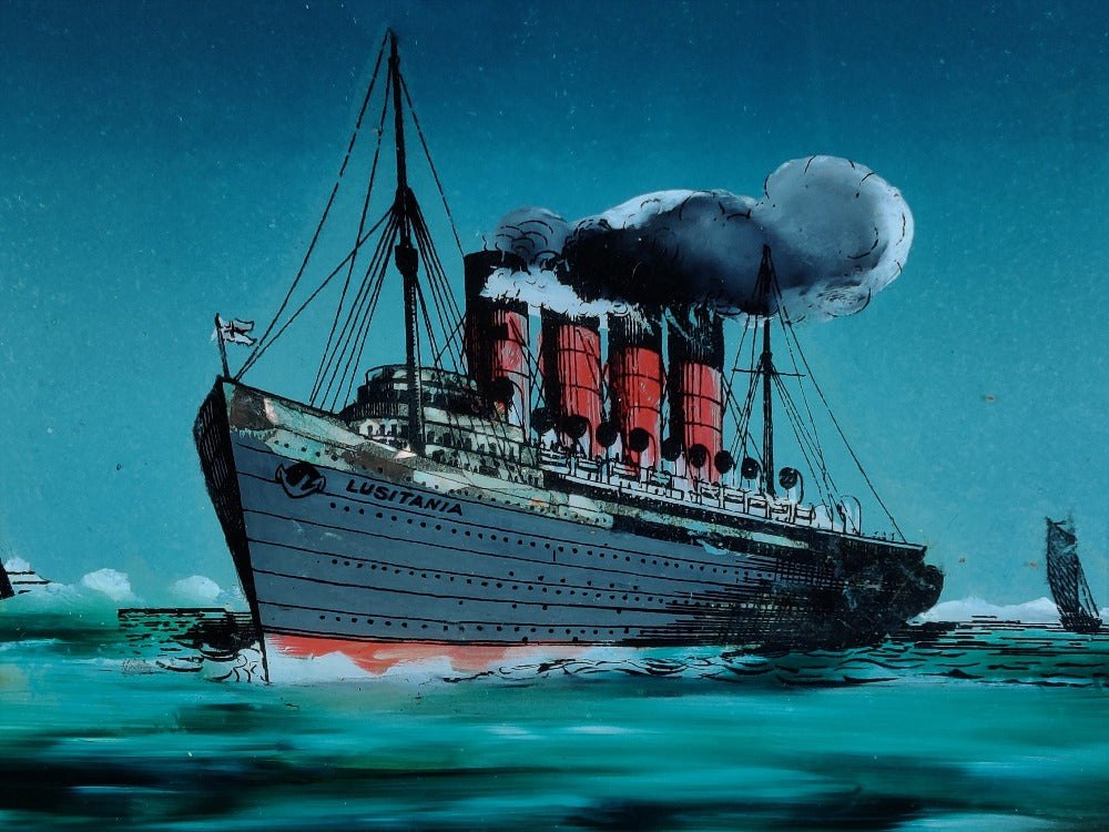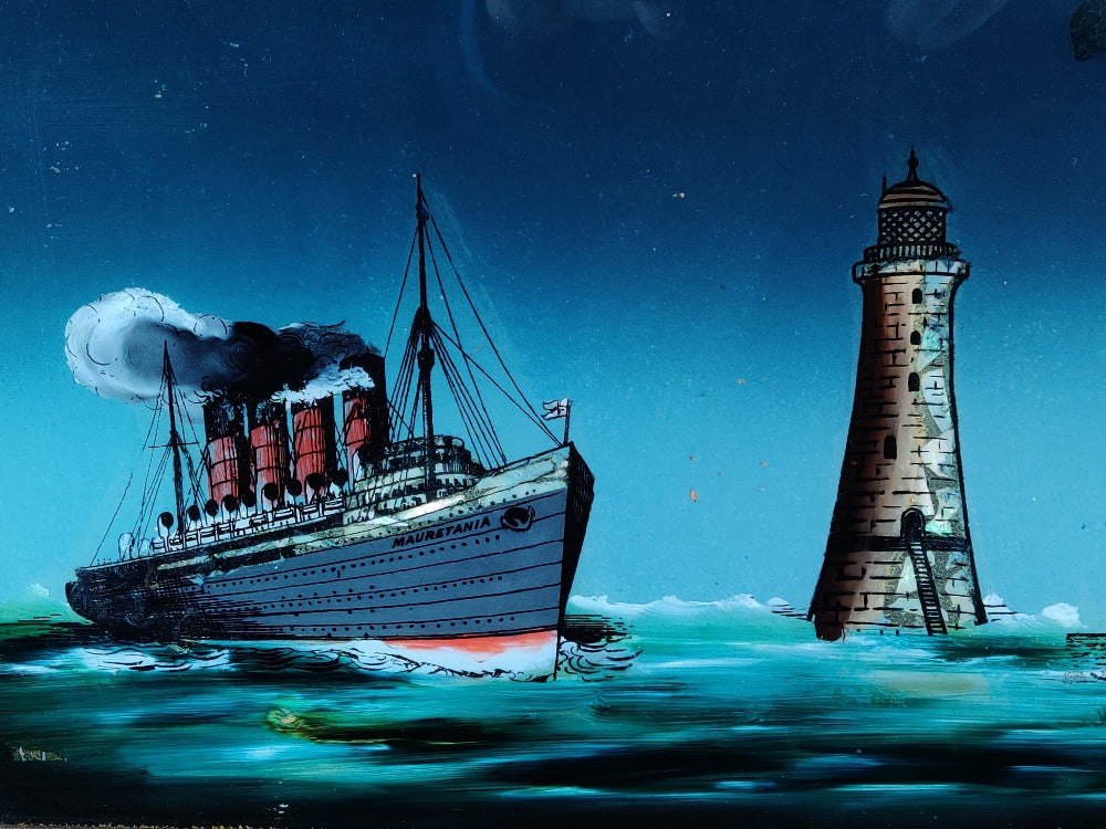 A rare early 20th century reverse painting on glass of good size, Lusitania and Mauretania at Bell rock lighthouse. This beauty comes in its original frame and pre-dates the sinking of Lusitania. The glossy surface of the glass really adds to the depth of this picture. There are small areas of wear and tear which only adds to the character.