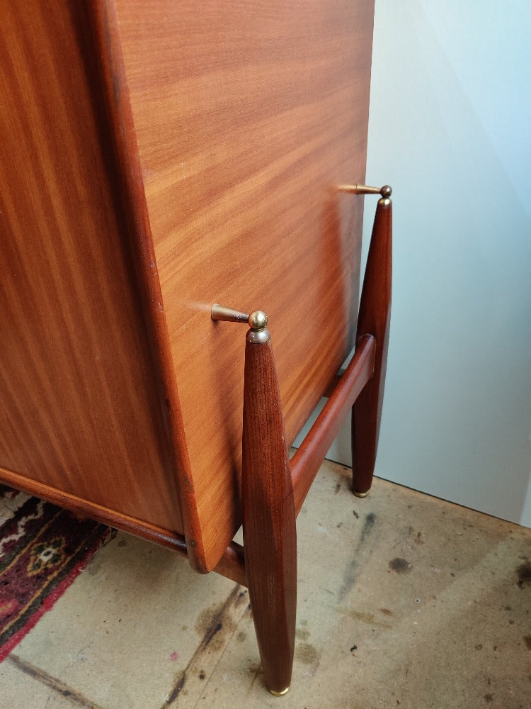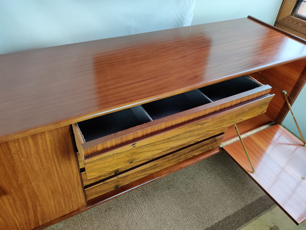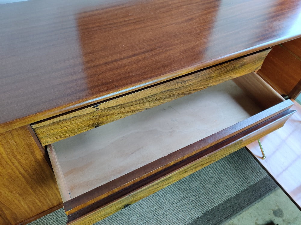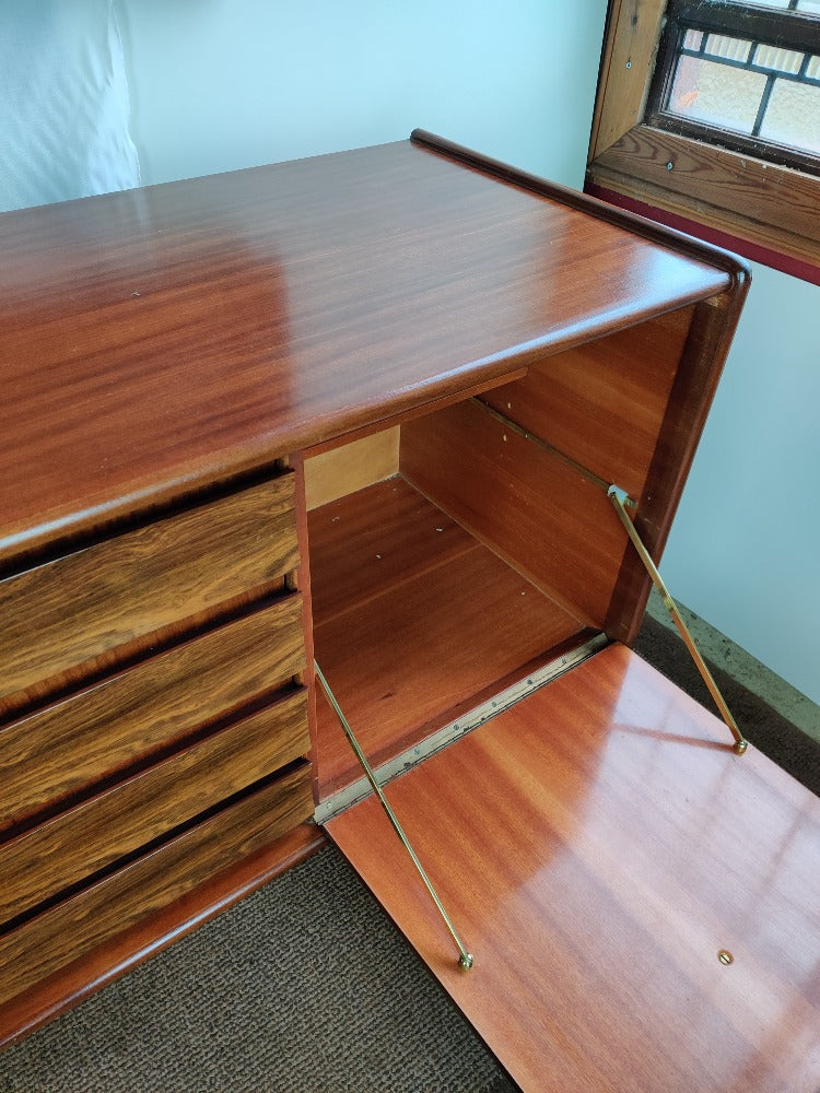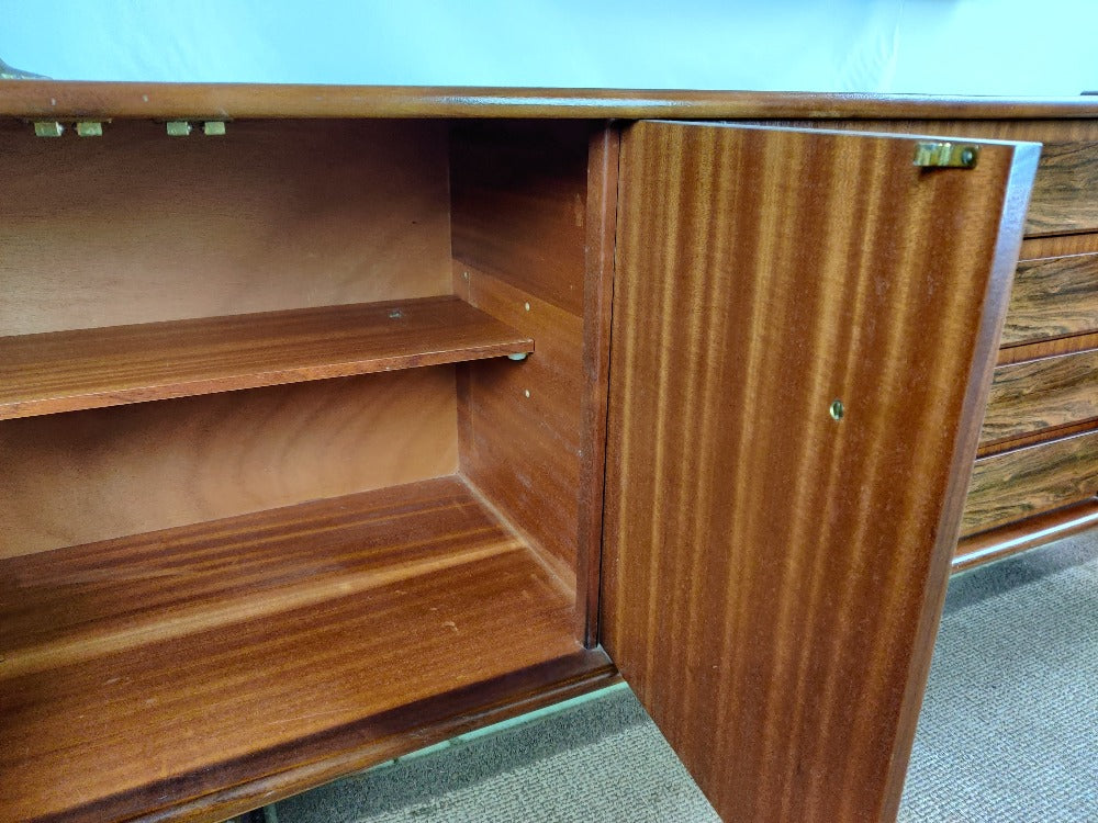 A stunning 1960's sideboard in original condition from British furniture maker Elliotts of Newbury. Beautifully constructed from afromosia and rosewood with brass details. Bold rosewood detailing on the cabinet handles and drawer fronts elevates the clean-lined simplicity of the design and a fantastic base that stretches out from under the cabinet to extended legs to both ends.