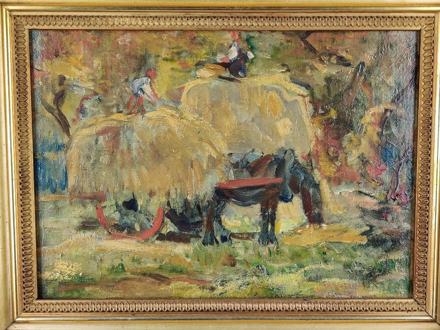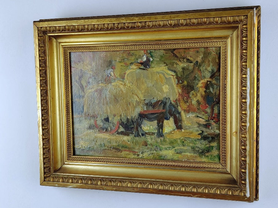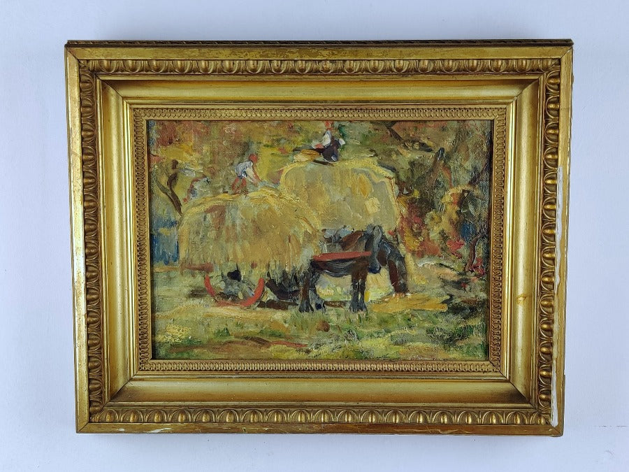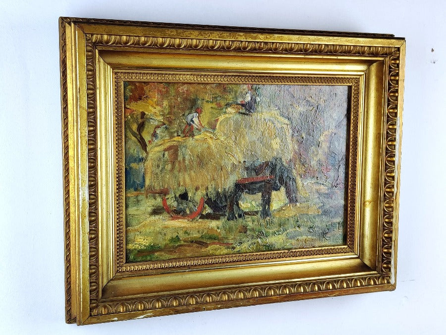 A wonderful oil painting "In the Stack Yard" oil on board. Signed to the back 21 August 1916. In a beautiful antique gilt frame slight damage to gilt but only adding to the character (see photos).