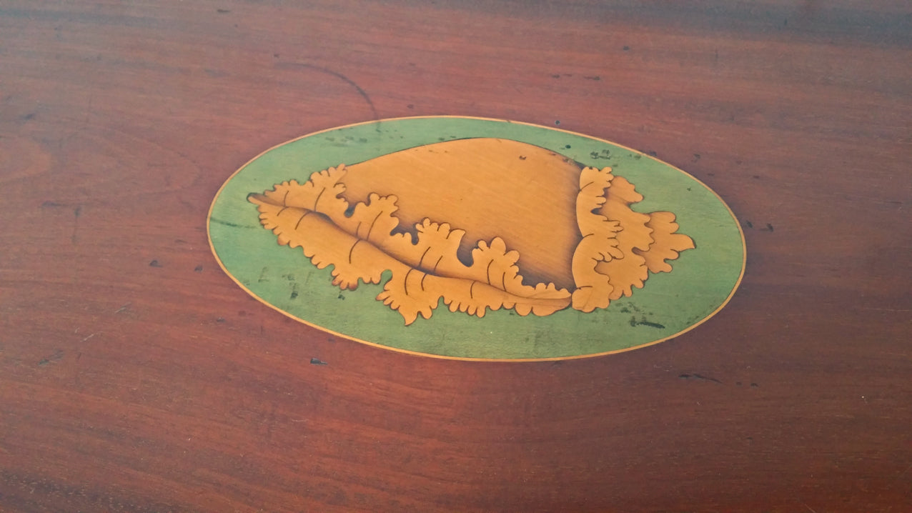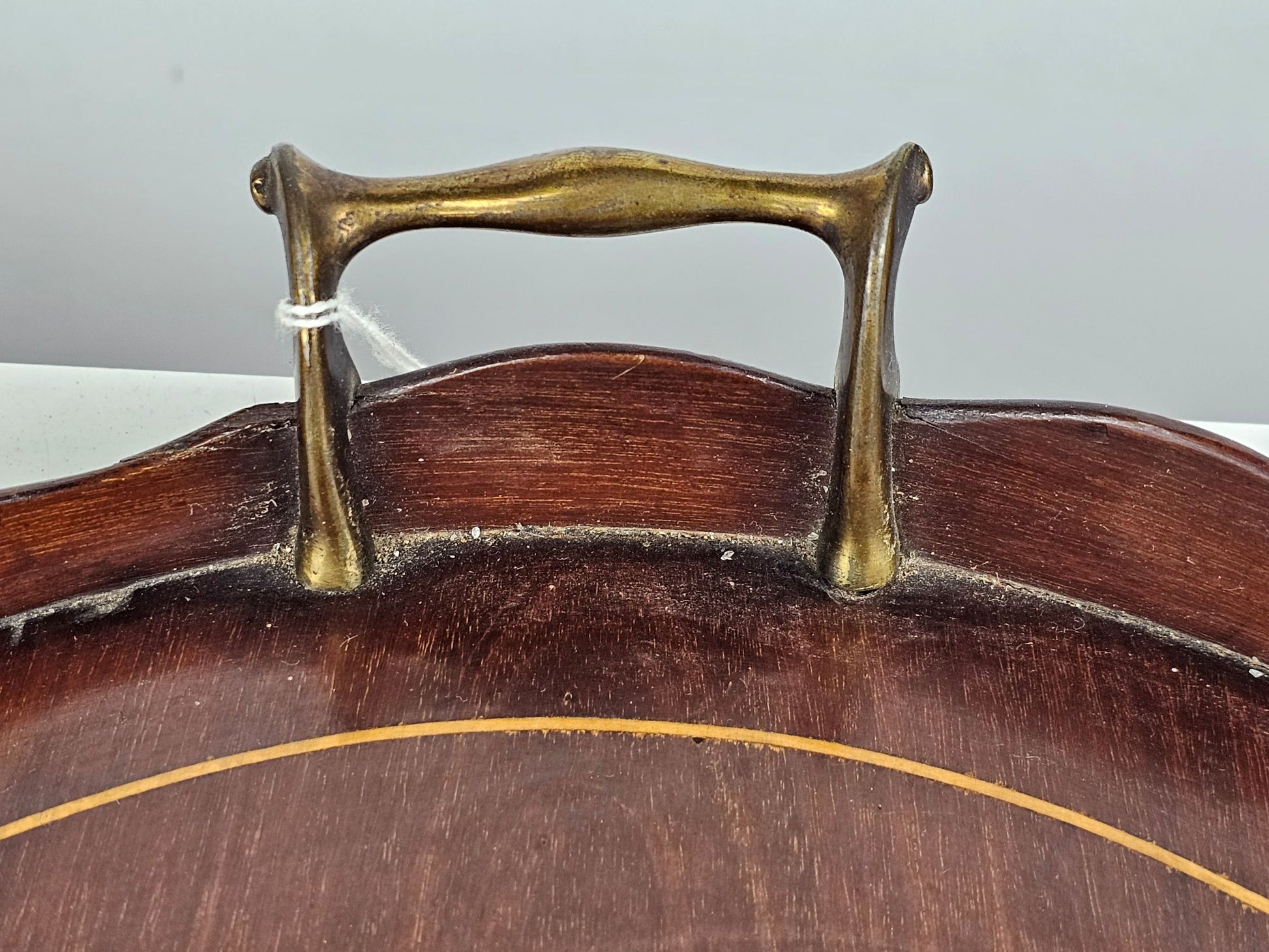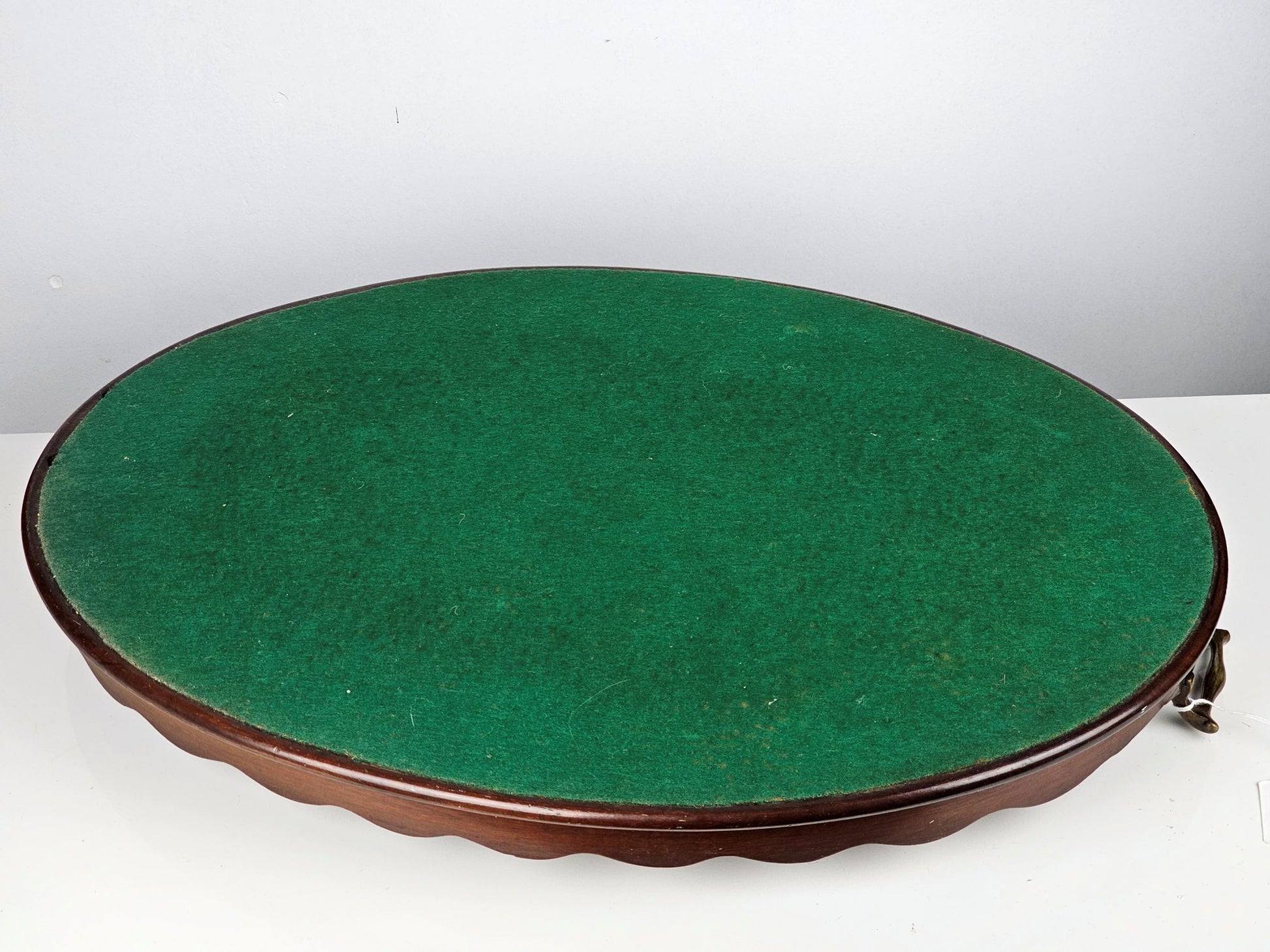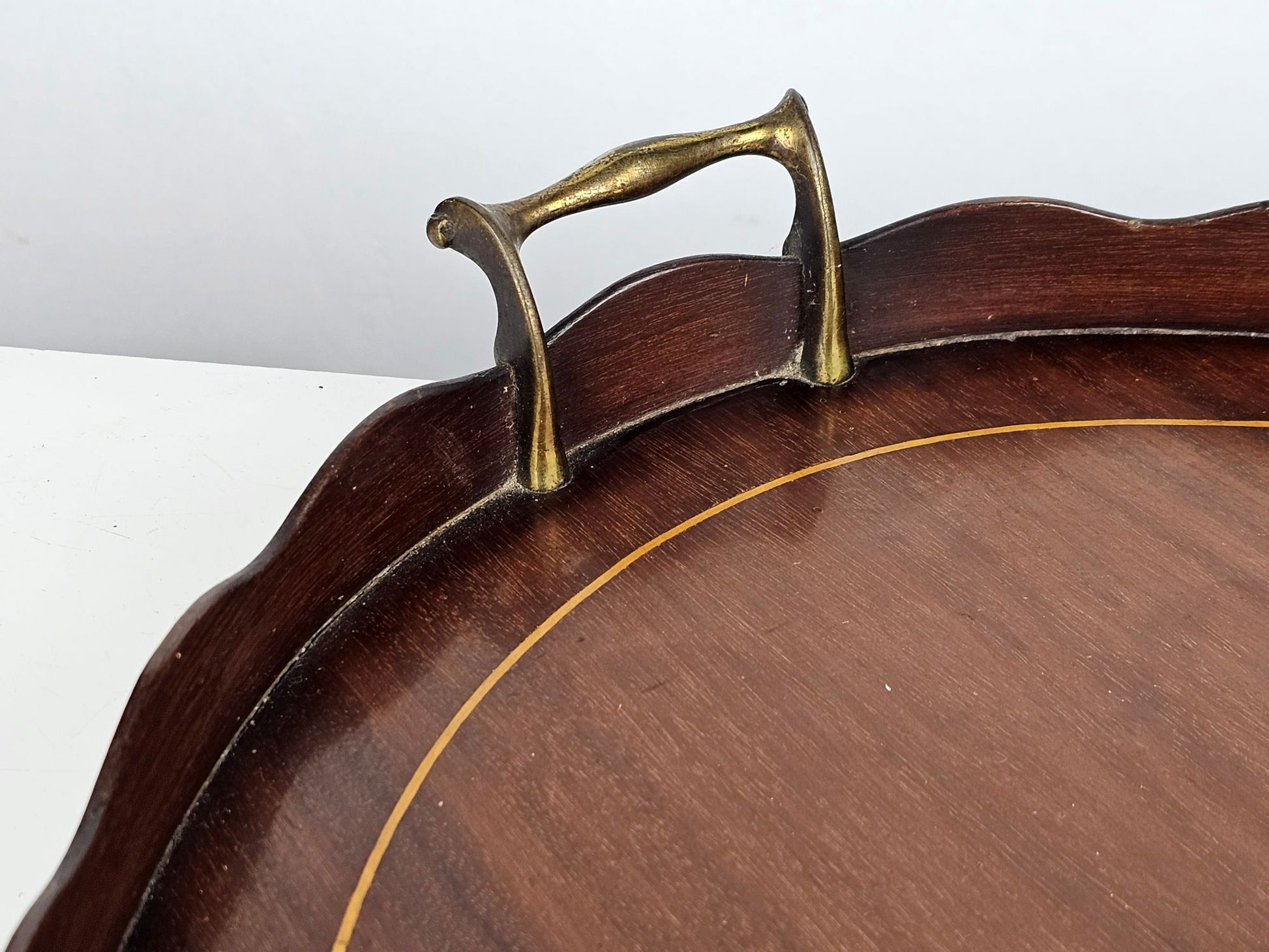 A good 19th century oval mahogany drinks tray with a good colour, conch shell inlay and gallery edged. In good condition.