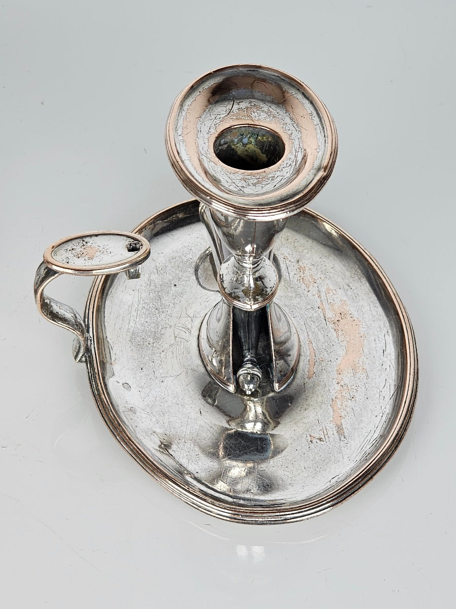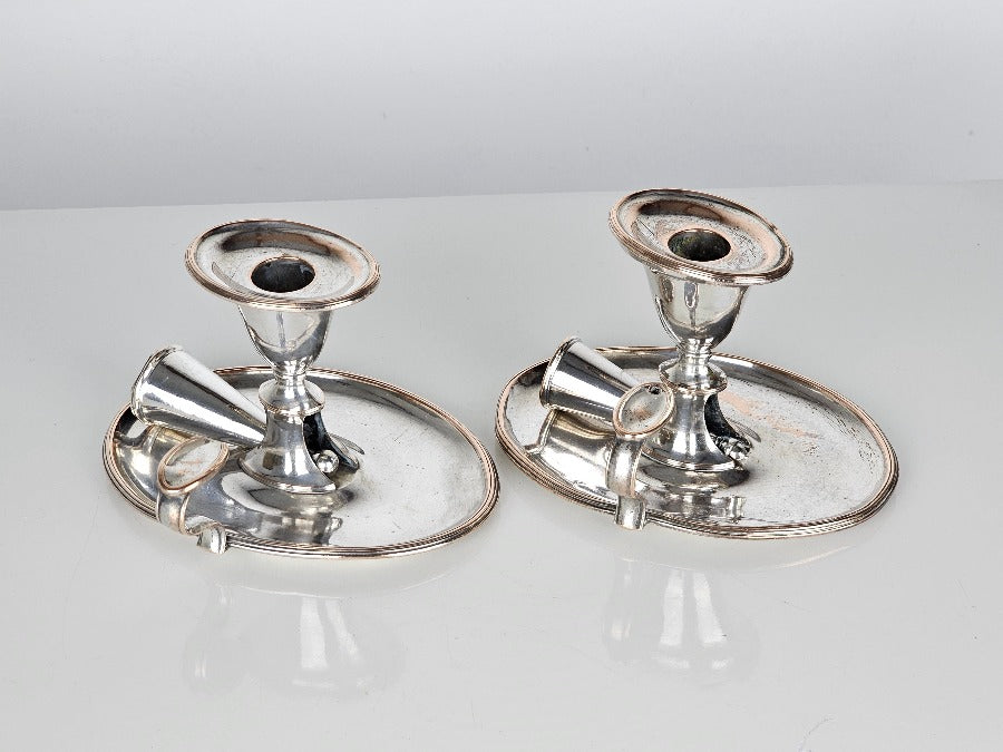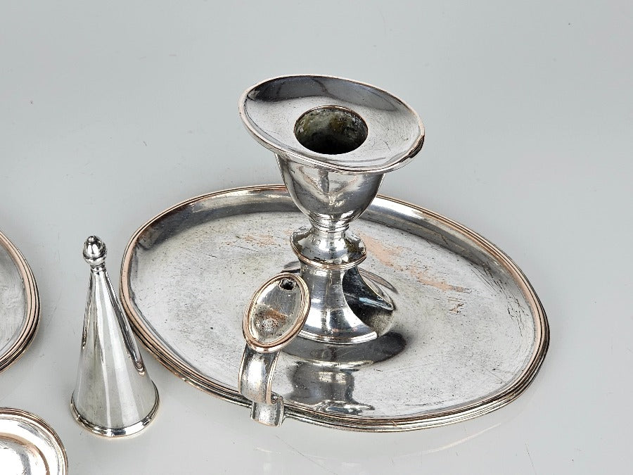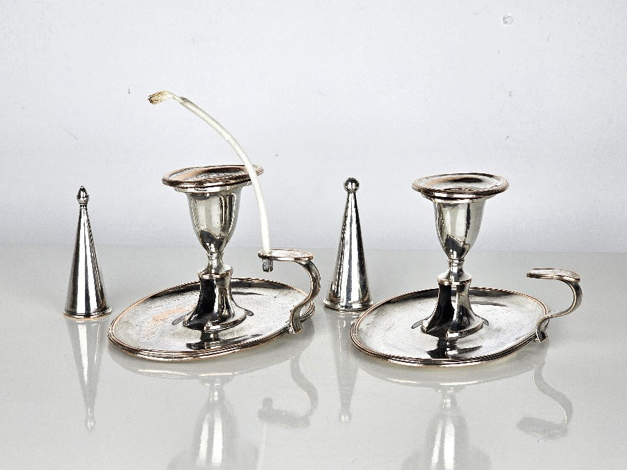 A beautiful pair of chamber candlesticks, silver on copper with individual sconces and snuffers. Time to create that mood lighting...