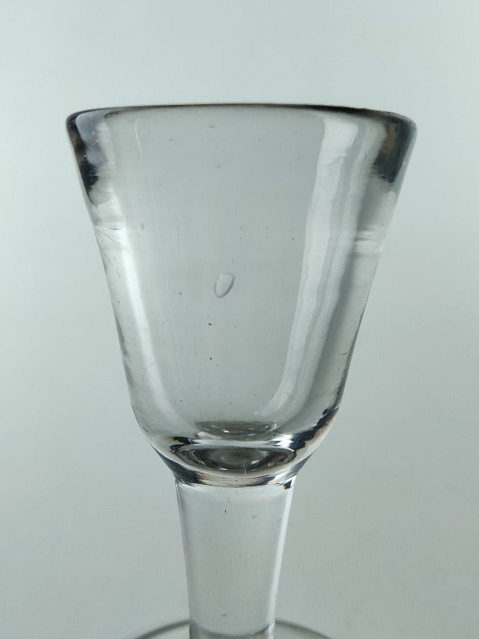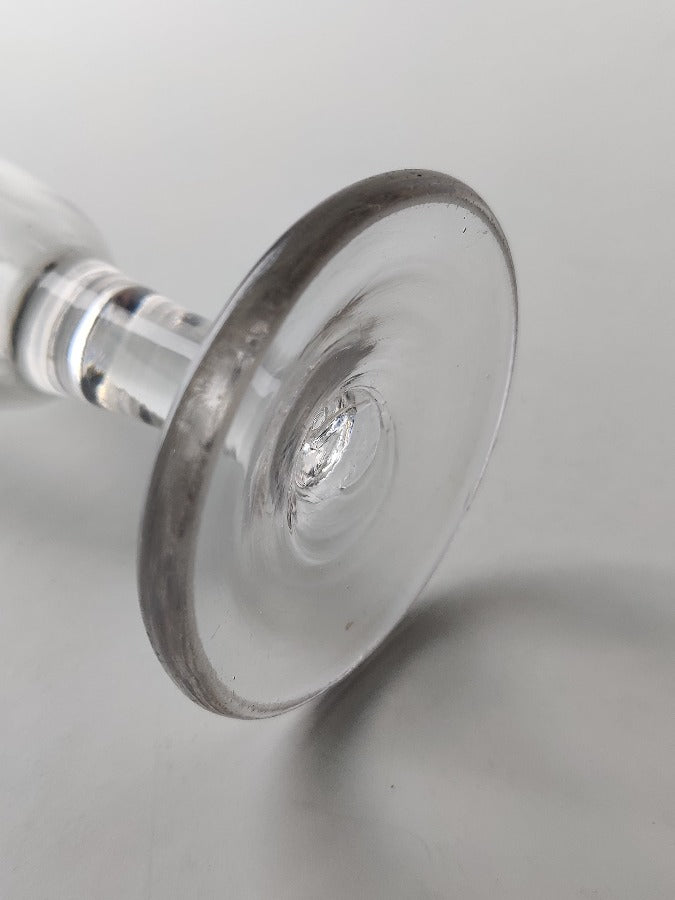 A heavy Georgian deceptive toastmasters glass with conical foot, plain stem, beautiful deceptive funnel bowl, snapped pontil and grey metal.