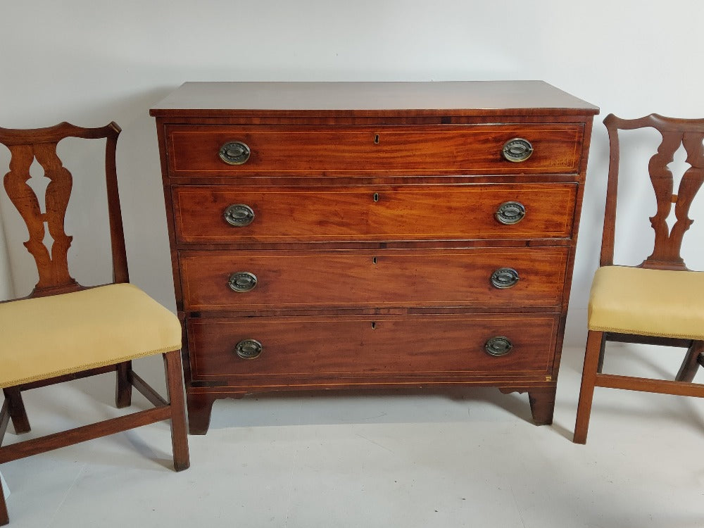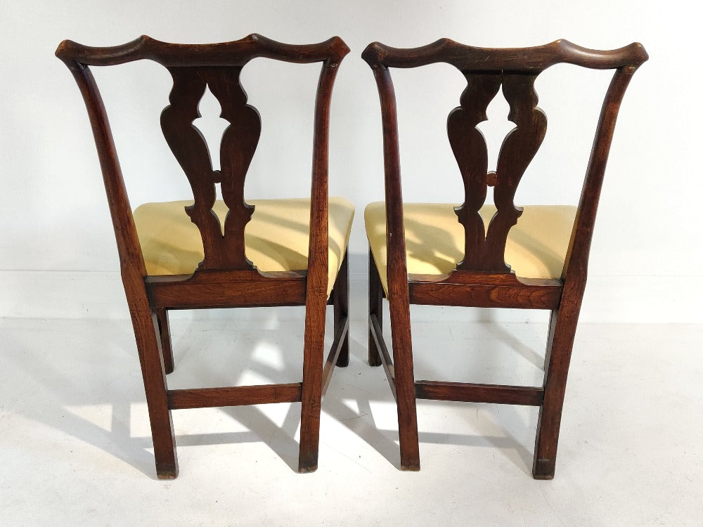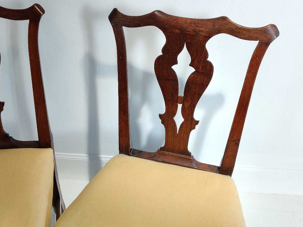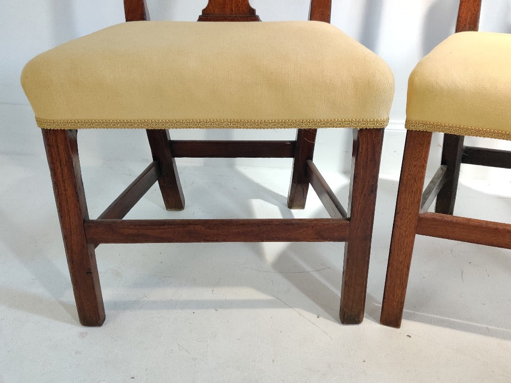 A good pair of upholstered George III mahogany side chairs with pierced splats on squared legs united by stretchers.