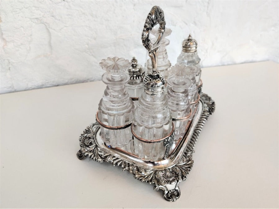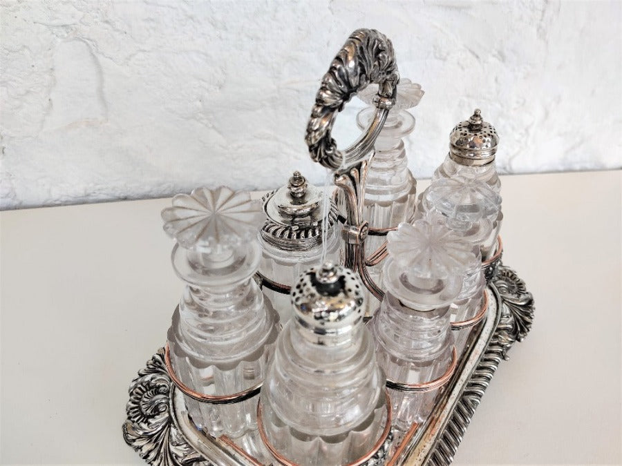 A good cut glass cruet set. Solid silver hallmarked tops and Sheffield plate carrier. Two bottles have a chip to the stopper and one has a chip to the neck, but all very usable (see photos).