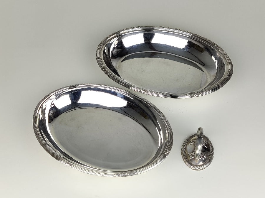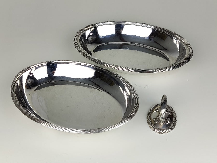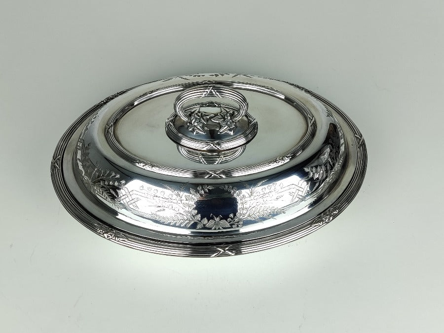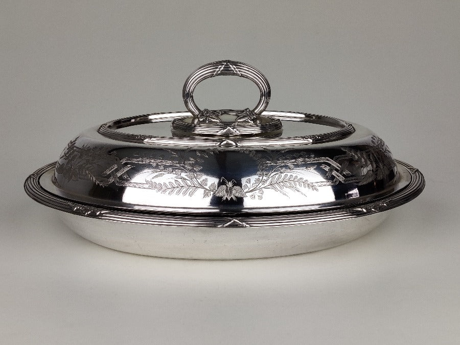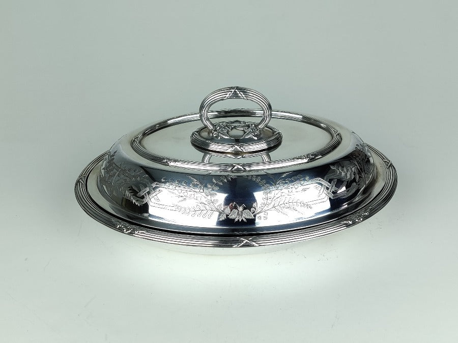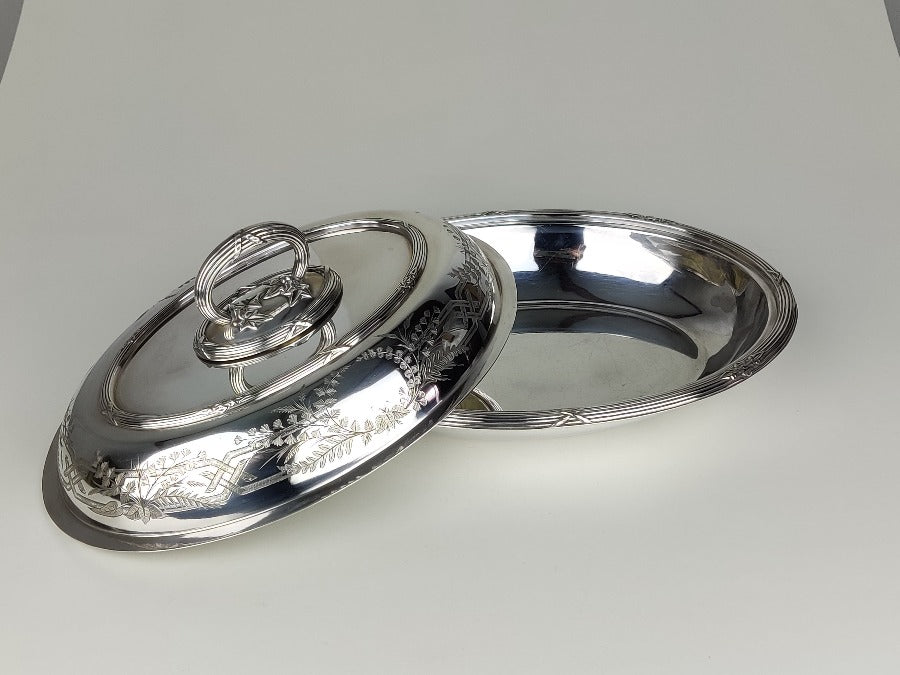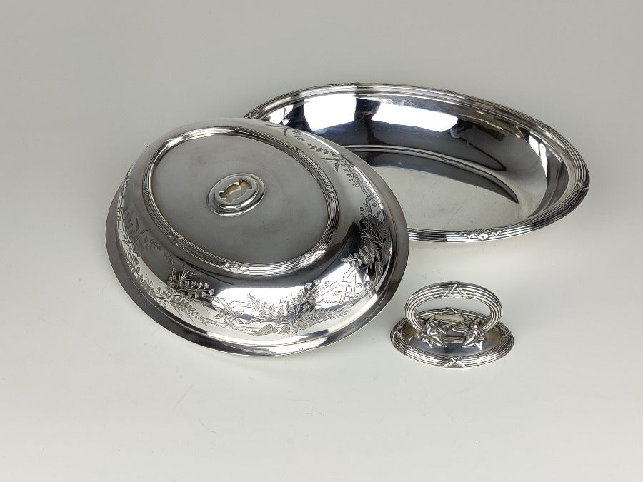 Serve up fine cuisine in style with this exquisite silver plate entrée dish, perfect for hosting dinner parties with a touch of elegance. Bon appetit! The silver plate is in great condition, with removable handle and the lid becoming an additional serving dish if required. With plated marks for "SH & Co"