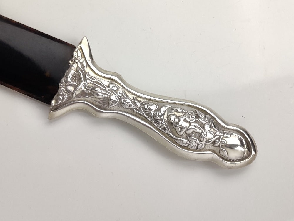 A fabulous page turner/paper knife by William Comyns. Tortoiseshell blade and ornate repousse work to the handle.