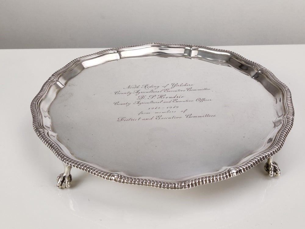 The salver itself has a scalloped edge surrounded with a lovely, understated design and sitting on ball and claw feet. With a few vintage marks but in good condition, this piece would have meant a lot to the person receiving it. Great for serving drinks, or even a conversation piece!