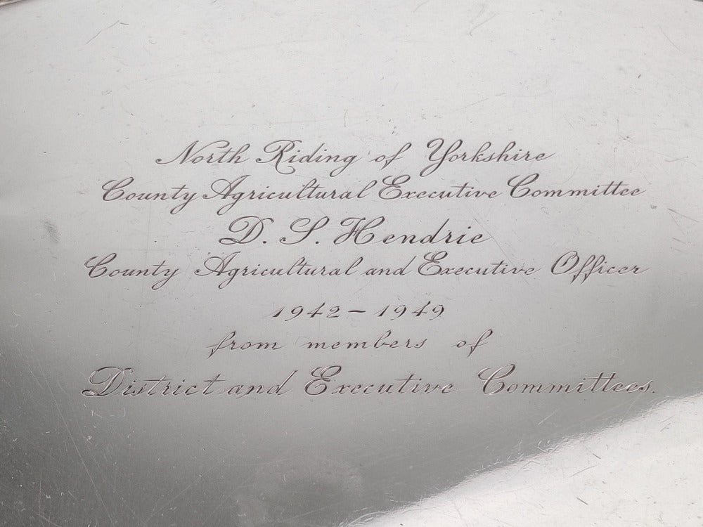 Engraved; 'North Riding of Yorkshire County Agricultural Executive Committee. It was presented to D J Hendrie (County Agricultural and Executive Officer from 1942 - 1949) from the District and Executive Members'.