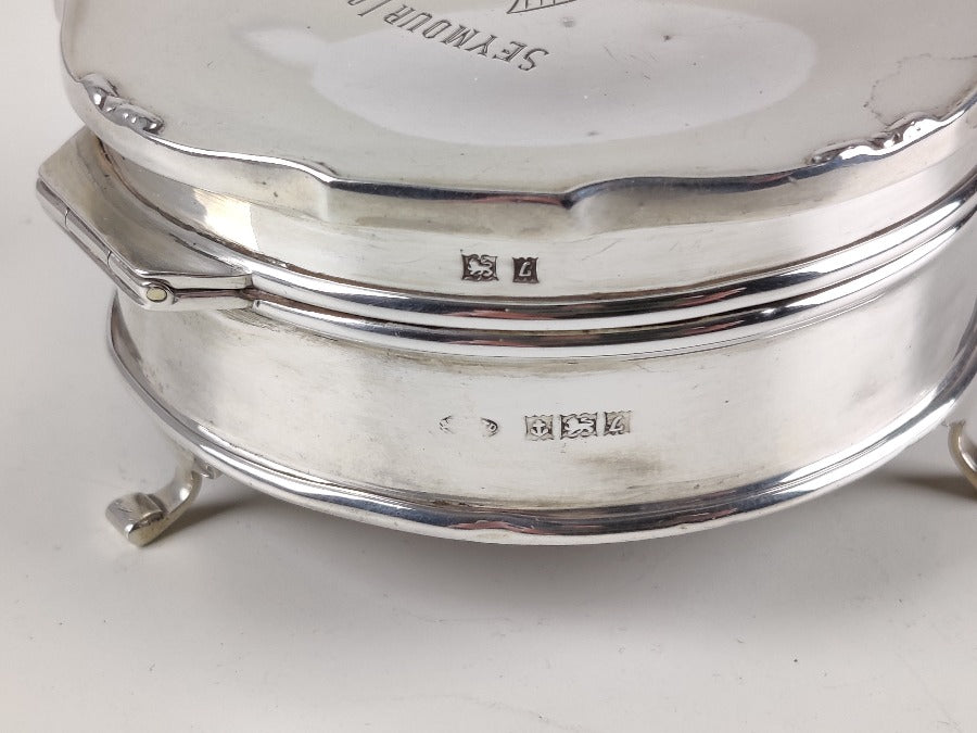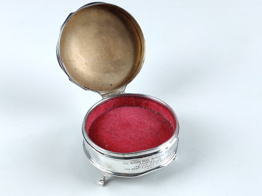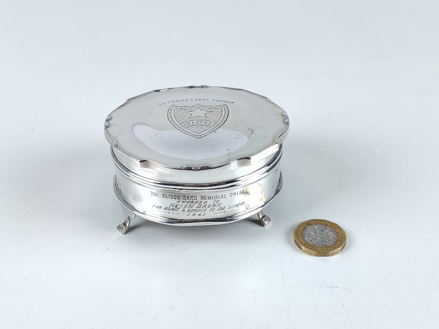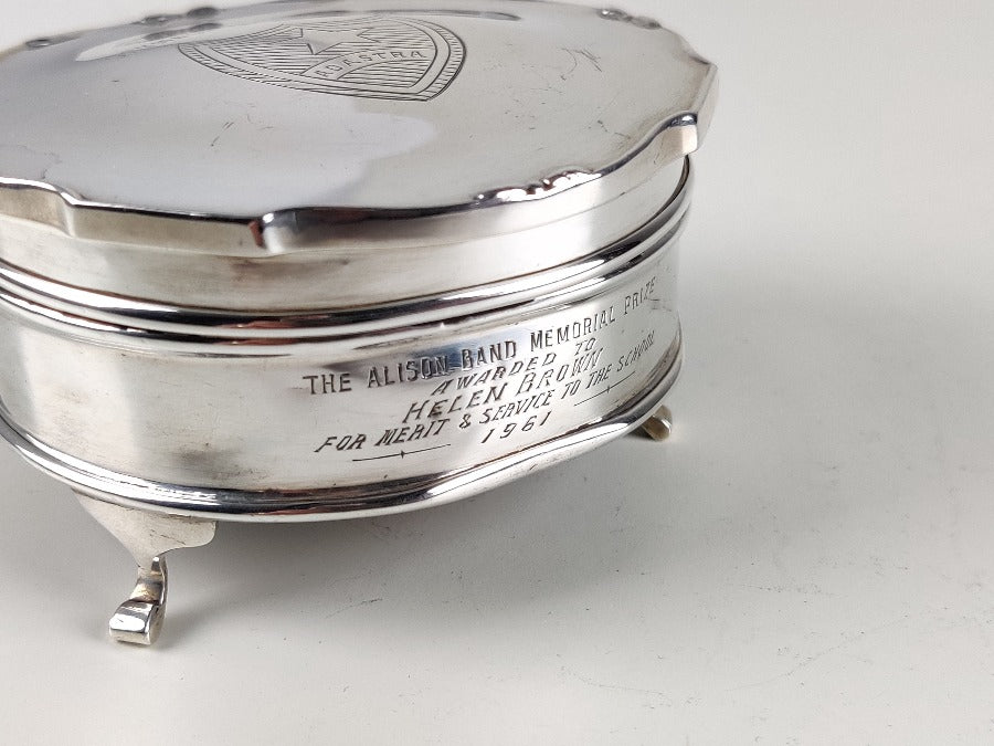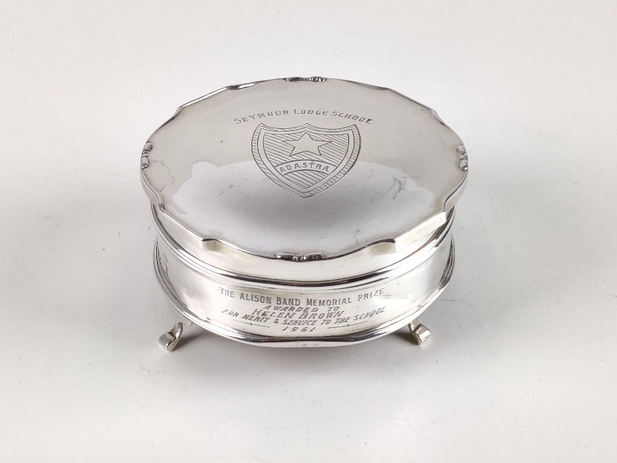 Silver Trinket box with hinged lid. This piece had been awarded as a prize in 1961.