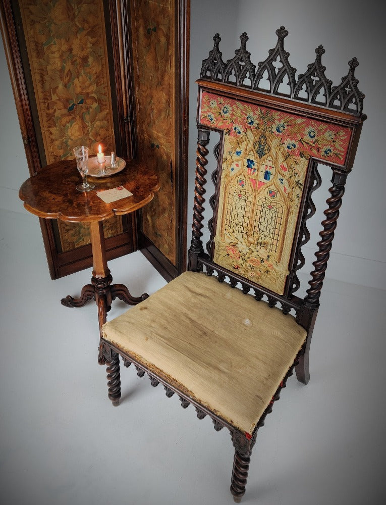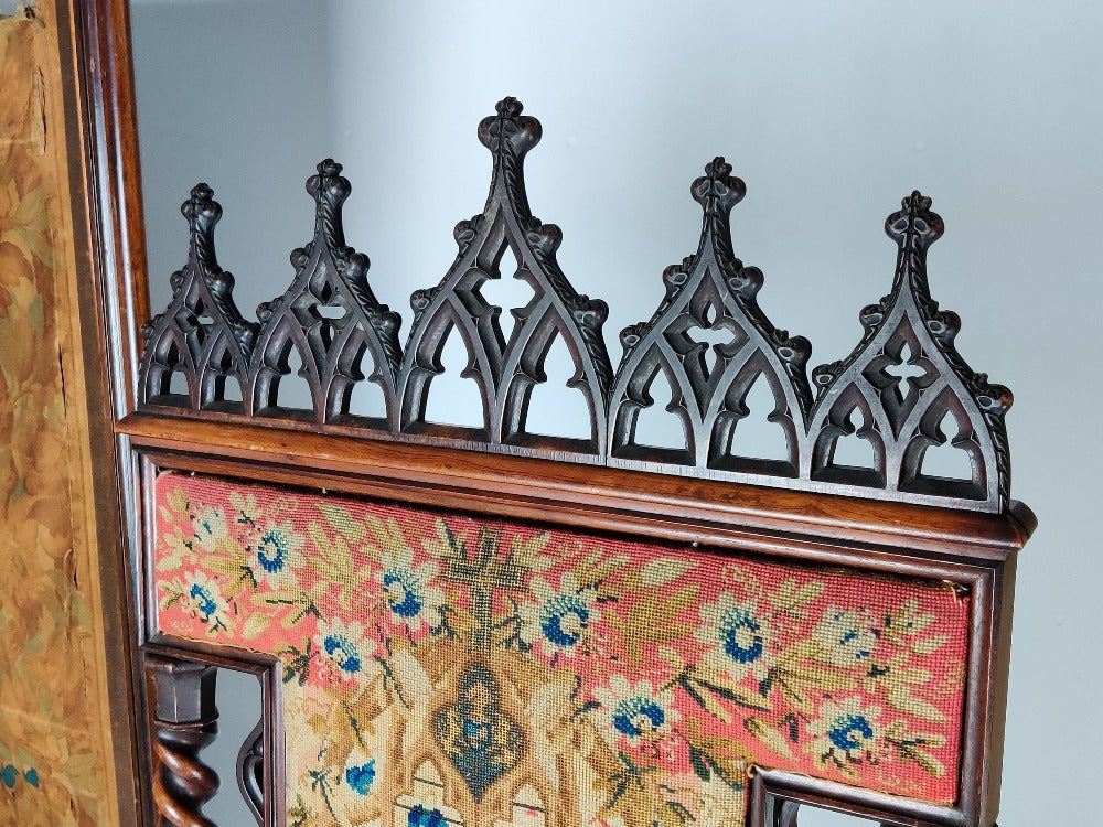 Wanting something different? A conversation piece, this has to be it... A wonderful Strawberry hill gothic revival chair dating from the early 19th century. Made from rosewood, the chair has amazing detail. The seat has the old covering removed to the seat which can now be recovered to the customer's own taste, the back still retains the original hand sewn needle point, beautifully sewn.
