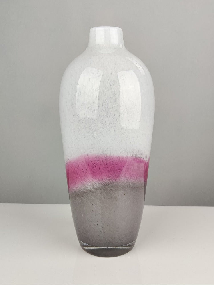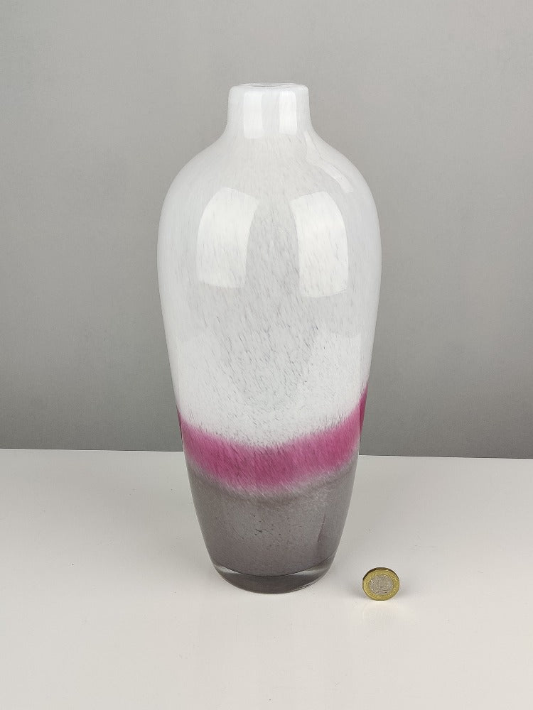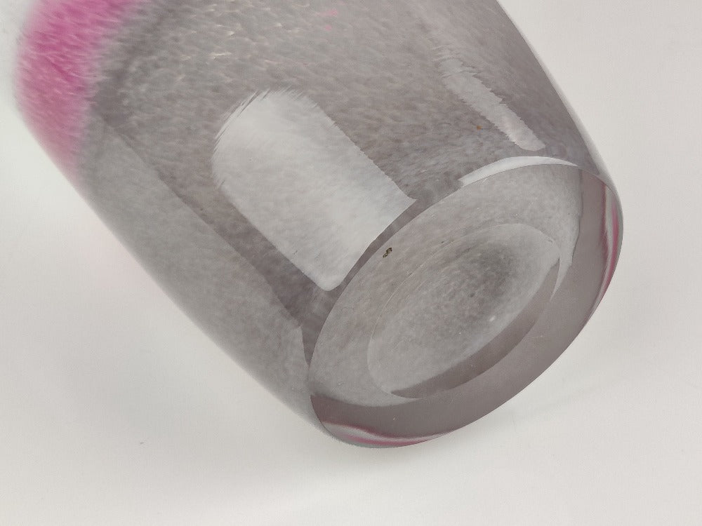 An early 20th Century Monart tri-colour glass vase with a deep ground pontil mark. This piece is in good condition with no chips or cracks. With its sleek shape, and pretty colours ranging from grey to deep pink and then white, it would look amazing with or without some pretty blooms.