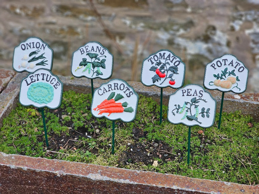 Set of seven, high quality Solid Cast Iron, beautifully hand painted vegetable signs in the early 20th century style. These will compliment any period or modern garden. Sold as a set of seven.
