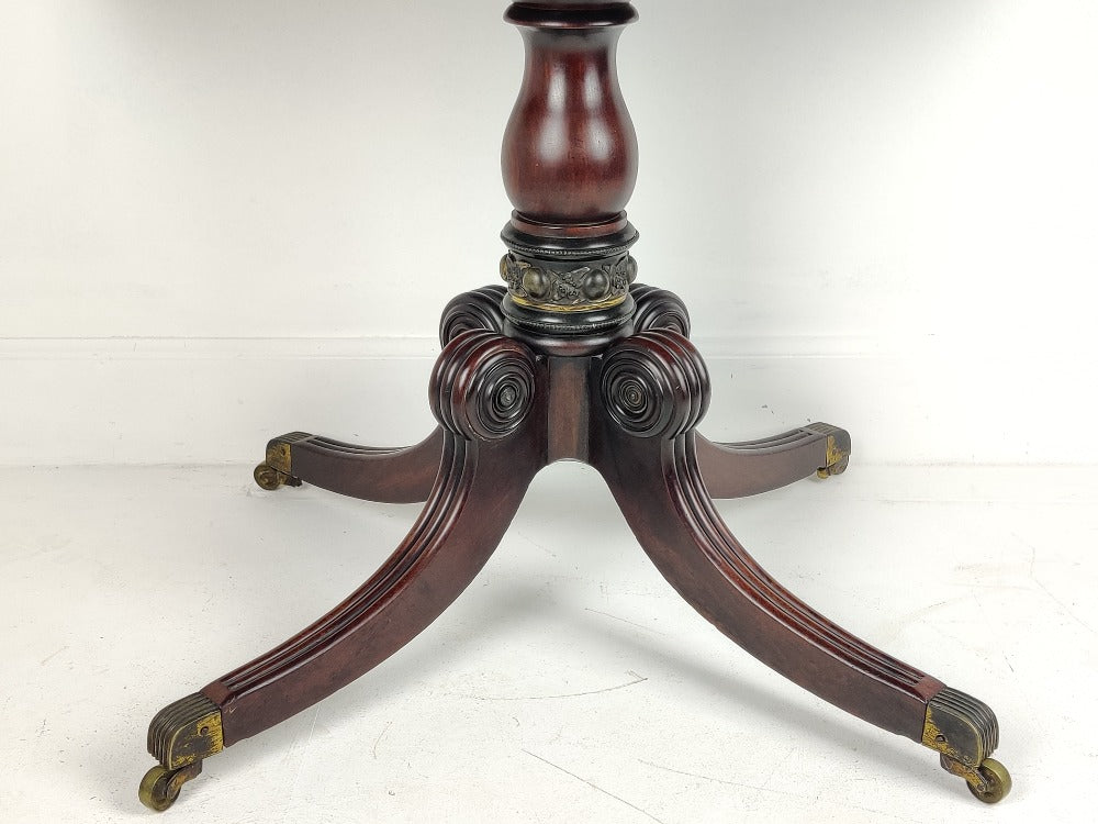 A fine George III versatile mahogany fold over table by William Trotter, Edinburgh. Truly stunning flame mahogany, on a pedestal base with out swept legs terminating in a detailed brass castor.