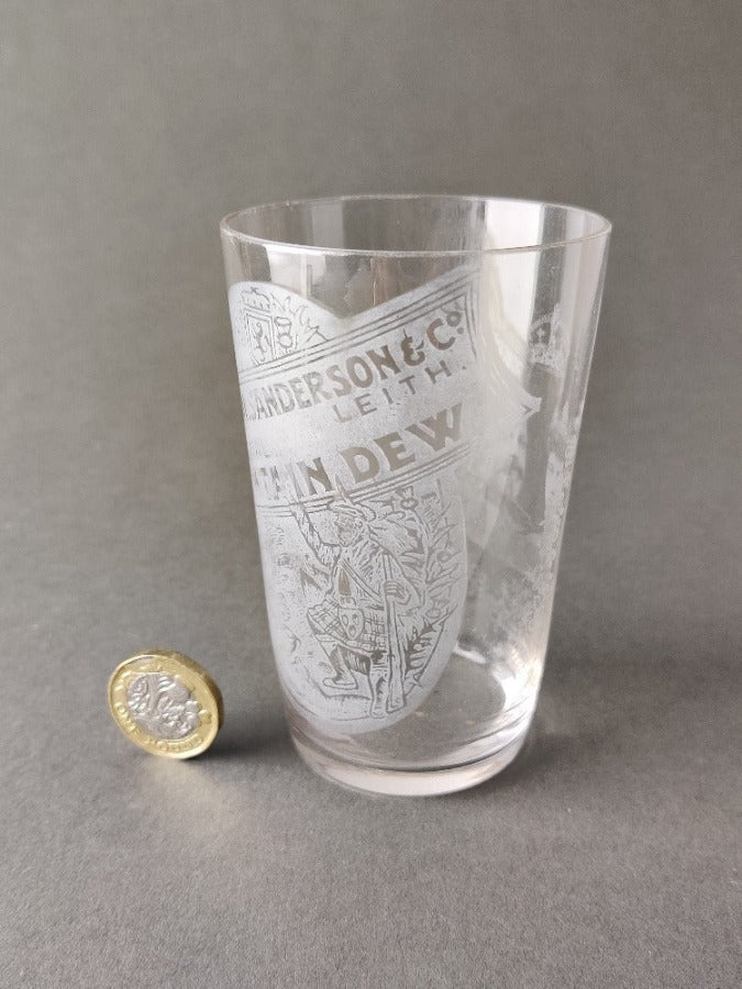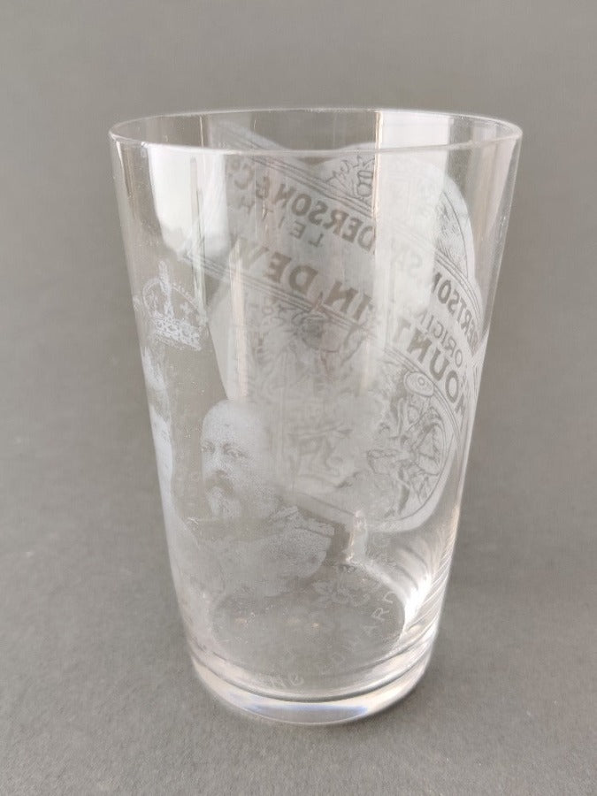 A great vintage whisky/drinks advertising glass. Acid etched with the inscription "Robertson, Sanderson & Co Leith" The original Mountain Dew. The rear of the glass has the inscription of Queen Alexandra and King Edward.