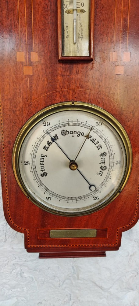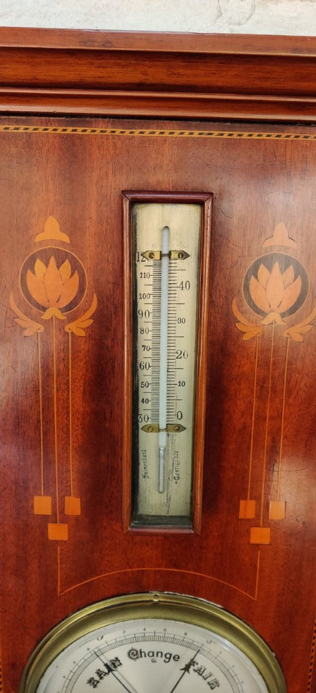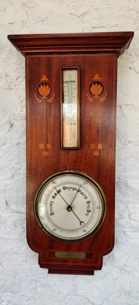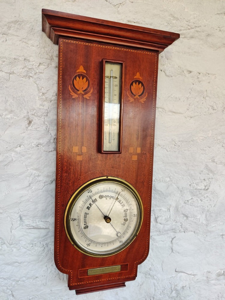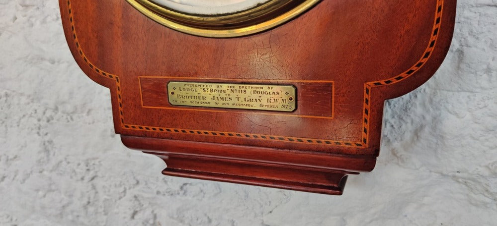 A good and attractive Masonic inlaid mahogany aneroid barometer. The case is inlaid with various exotic veneers, housing a silvered dial set inside a brass bezel and silvered mercury thermometer.