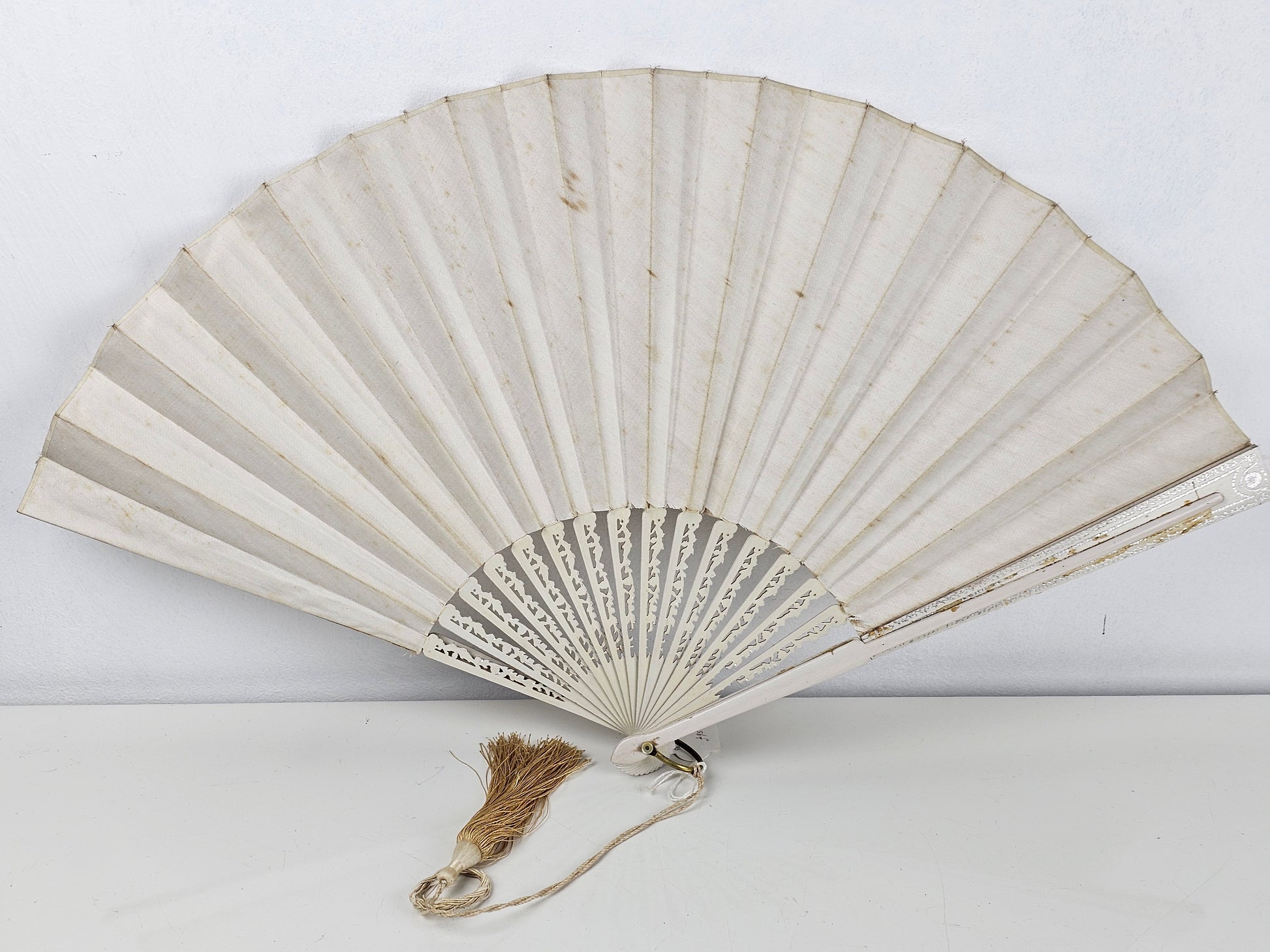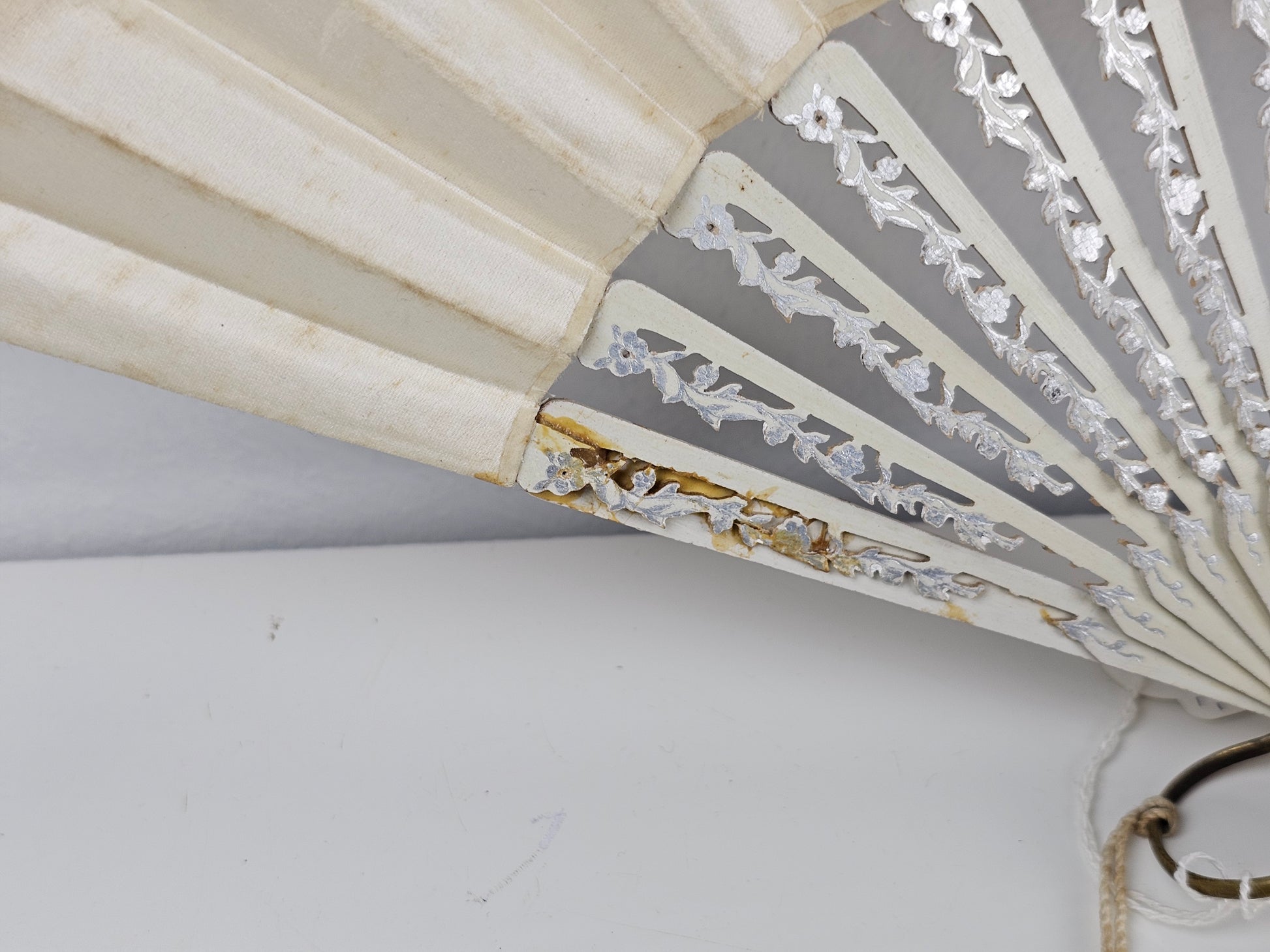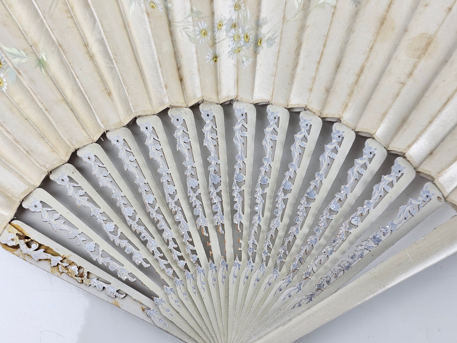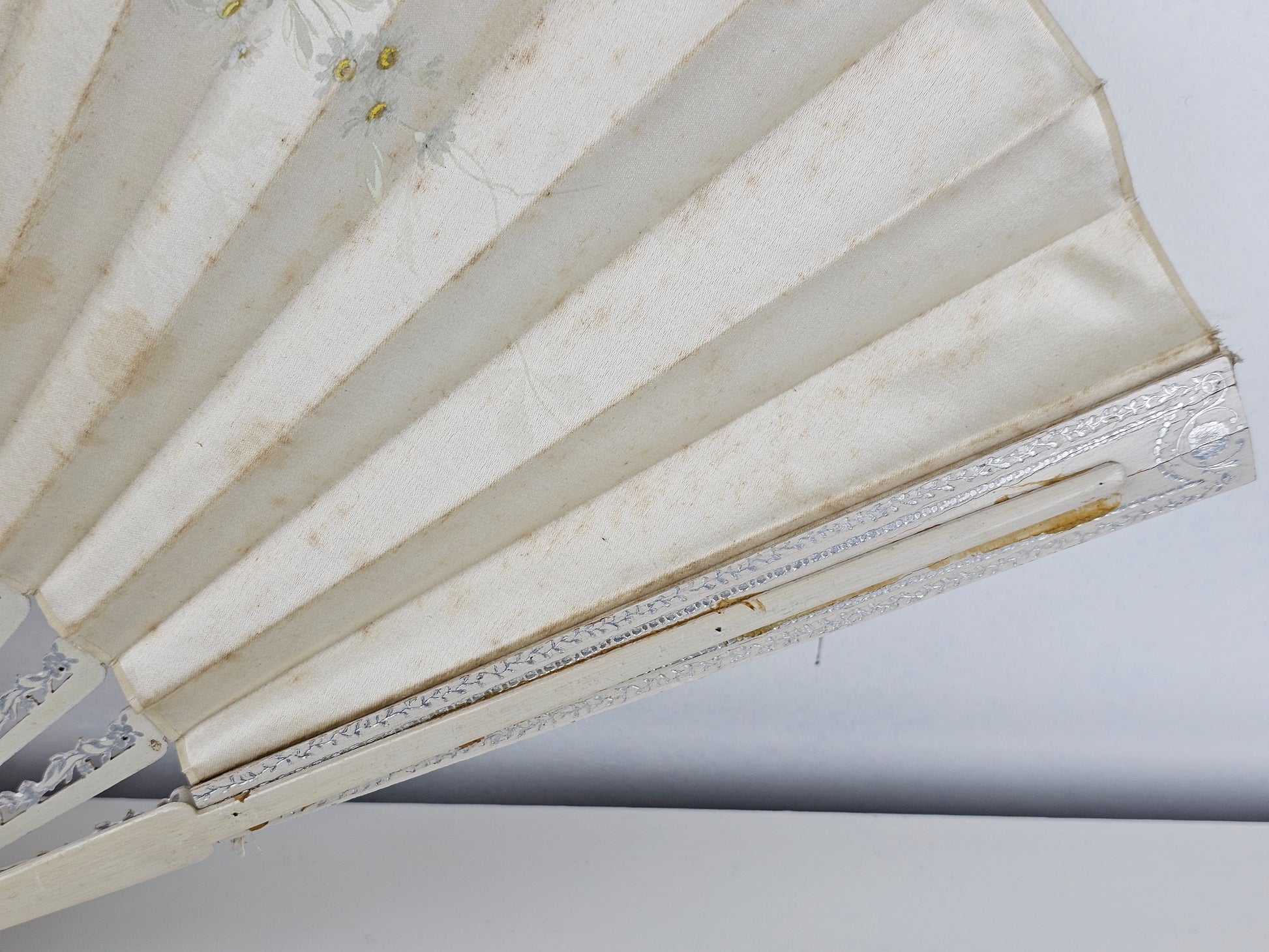 Late 19th early 20th century antique hand-painted silk fan with daisies in original, on fretted wood sticks. (some damage, see photos). Would be good to use at a themed party.