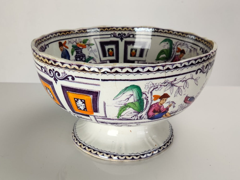 A lovely 19th Century Scottish Punch Bowl/ Jardiniere by D Lockhart & Co, Glasgow, in the Singapore design. A beautifully decorated transfer and hand painted bowl with a fluted edge, depicting different garden scenes around the outside and within the bowl itself. Sitting on a sturdy raised foot, although the bowl is in overall good condition, there is a slight hairline crack/scratches to the glaze and a slight discolouring to the inside rim. This bowl would also make a lovely planter/jardiniere, is very usable and would look in place with today's fashion. Would suit a themed kitchen or for that contrast between modern and old