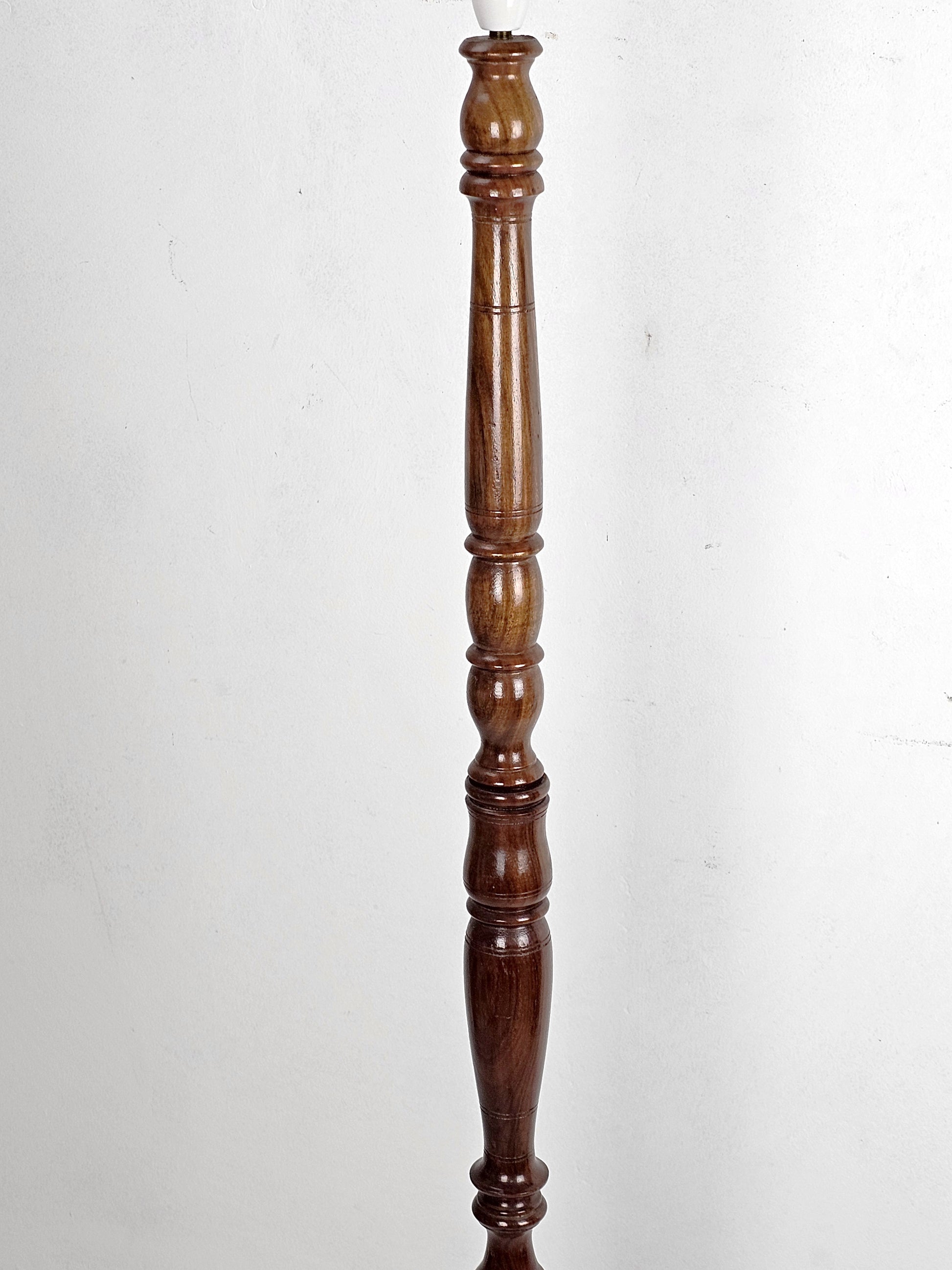 Wooden turned electric standard lamp. The price for this light includes re-wiring. However, the photos show the light prior to re-wiring.