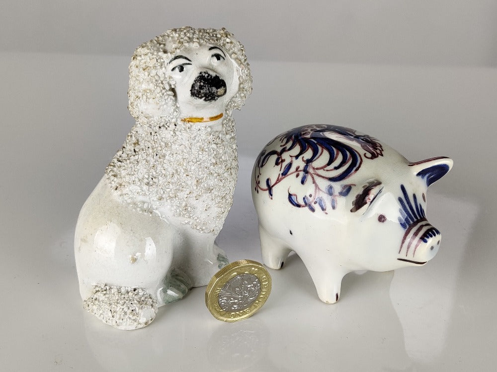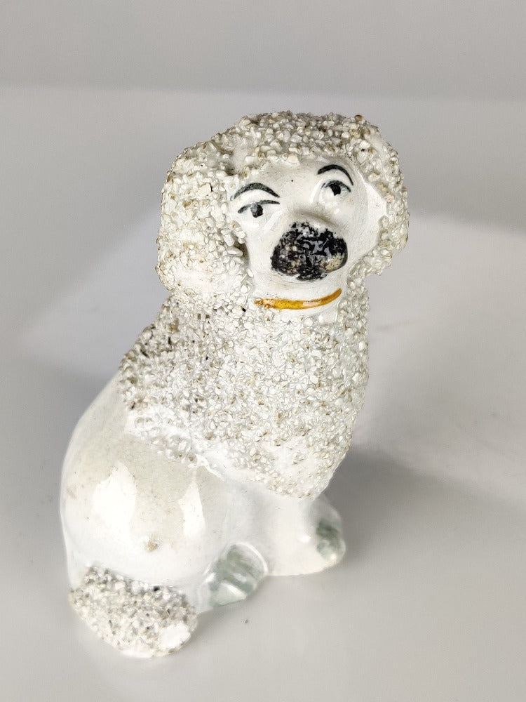 A lovely miniature porcelain Staffordshire Poodle dog. These figurines usually come in pairs, but unfortunately this one has lost it's partner. In great condition and looking for a new home, I'm sure he would make a great addition to a collection, or a great gift for someone who loves dogs!