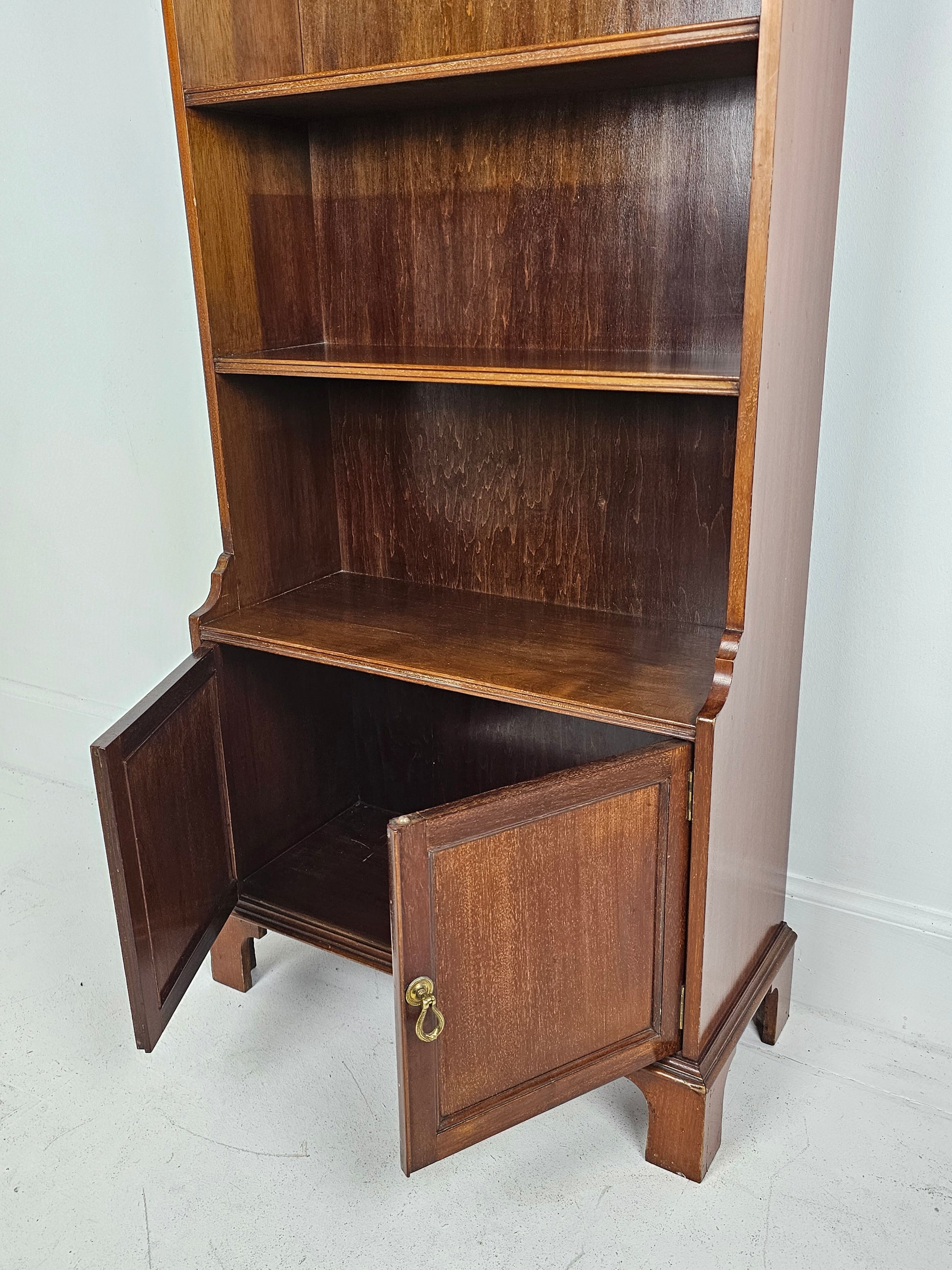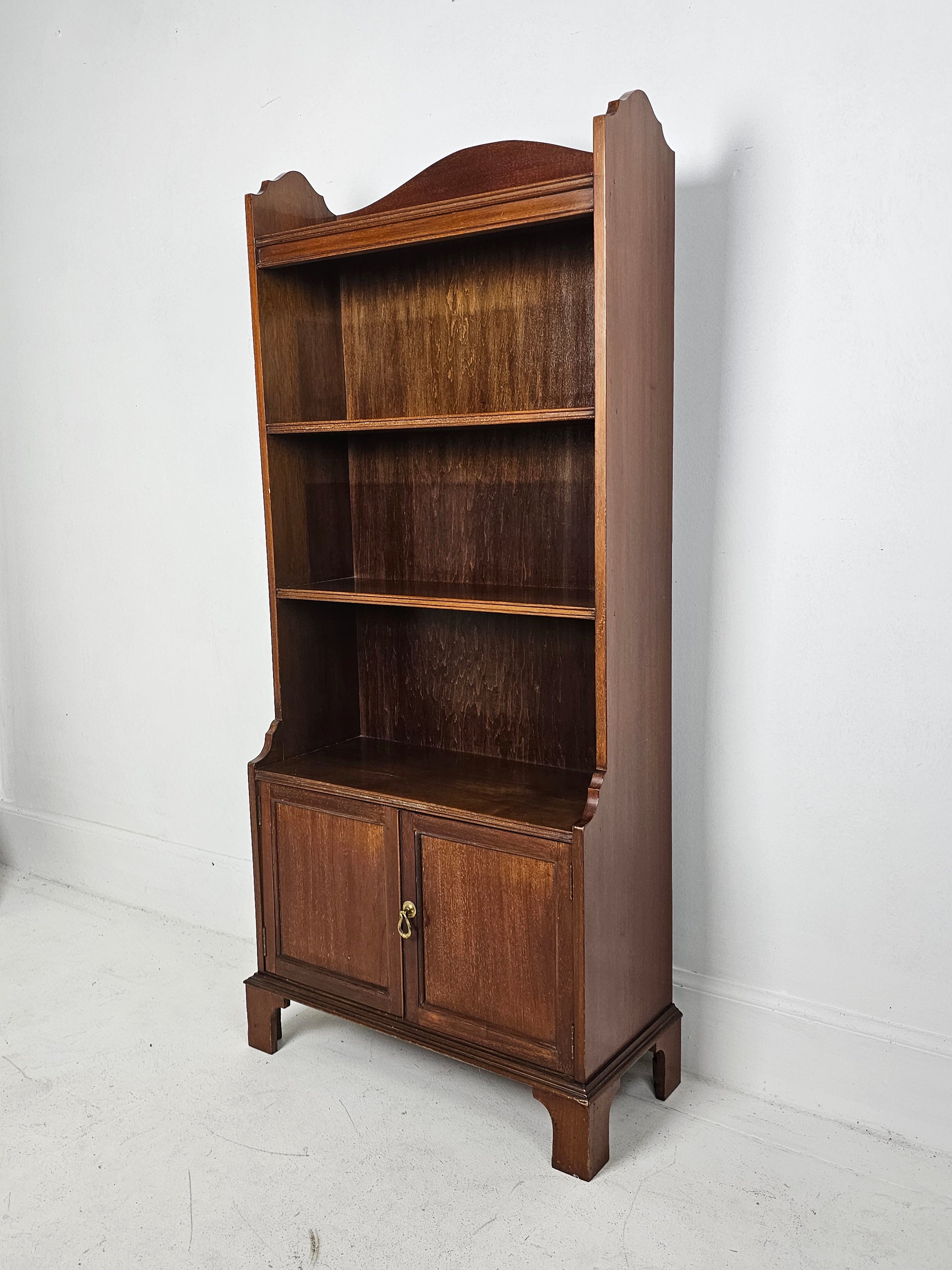 A beautiful Edwardian waterfall bookcase with lower cupboard on bracket feet.